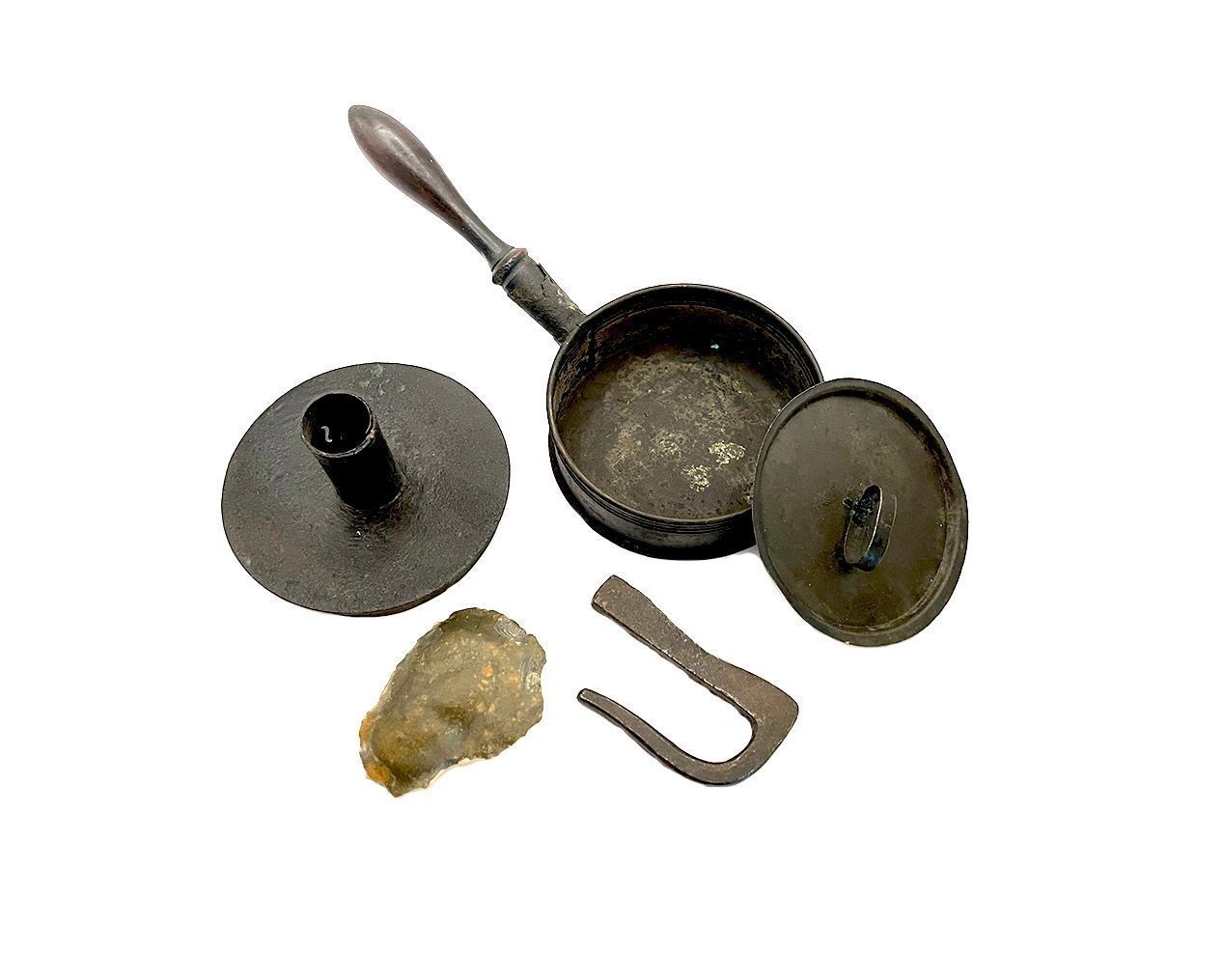 Small tin pan with a turned wood handle. The set includes a tight fitting 'damper' lid and candle stick to rest on the top of the pan. Also a metal striker and a flint.Context
