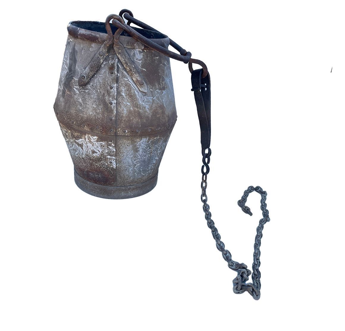 A galvanised bucket with handle, clasp and chain.Context