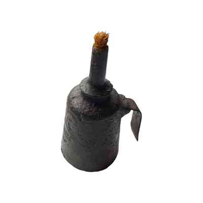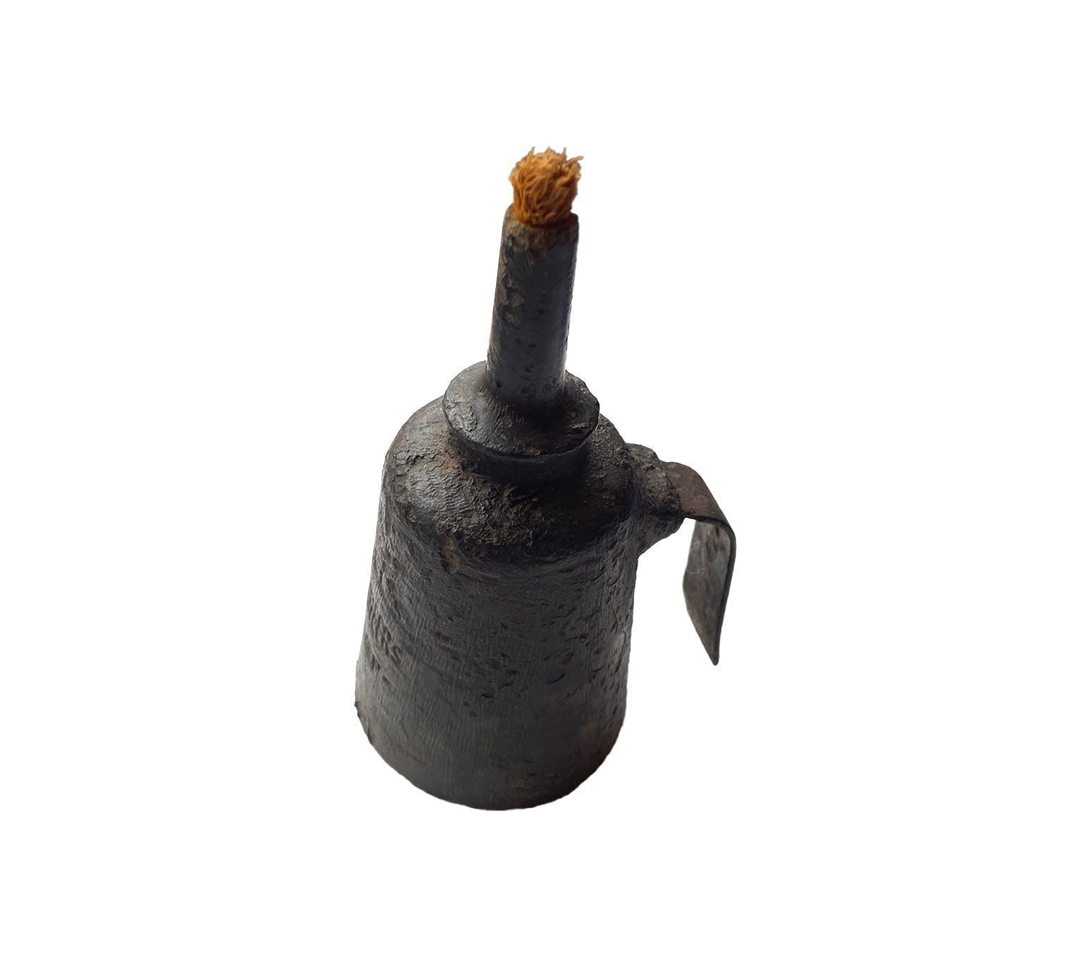 A thick cast iron body with wick and handle. The lamps were usually fuelled with colza oil (a type of rapeseed oil) which could also be used as a lubricant in engineering because it didn't dry up. The top unscrews in order to add the oil and insert the wick.Context
