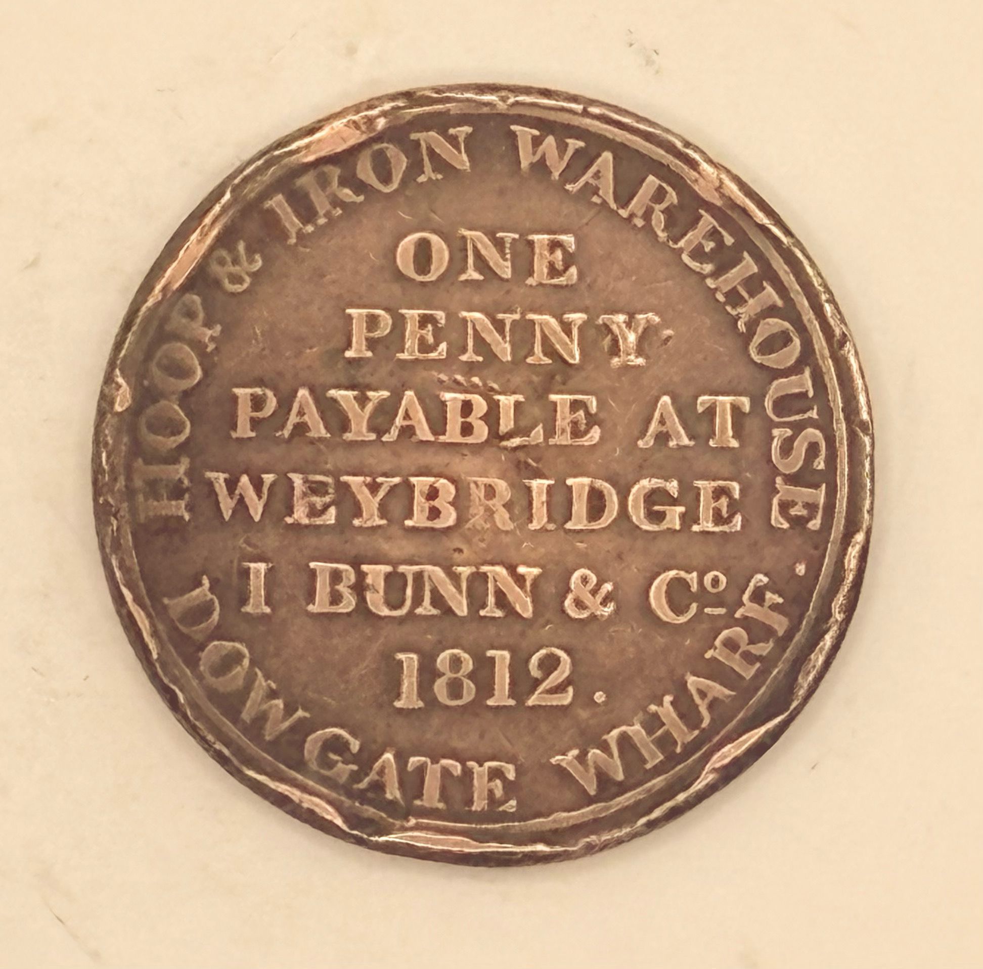 One Penny token payable at Weybridge I Bunn & Co. 1812Cataloged By