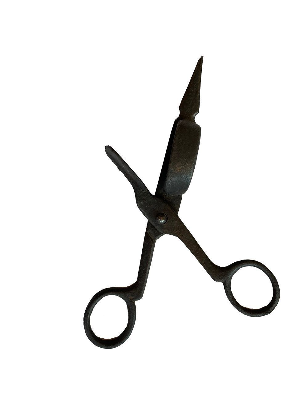 Metal scissor-like instrument with small pan attached to one blade and a paddle attached to the other. When the wick was cut the excess was pushed by the paddle into the side pan. This trimmer was most likely for a kerosene lamp.Context