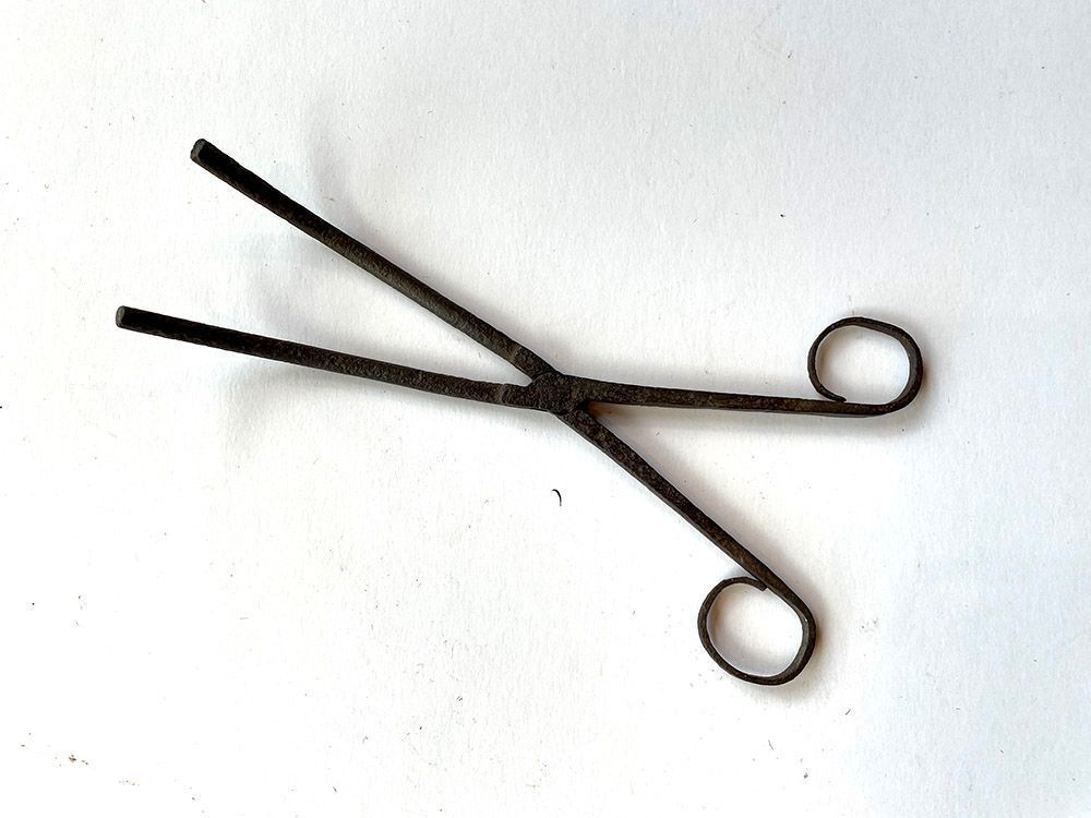 Iron tongs with curved blades.Context