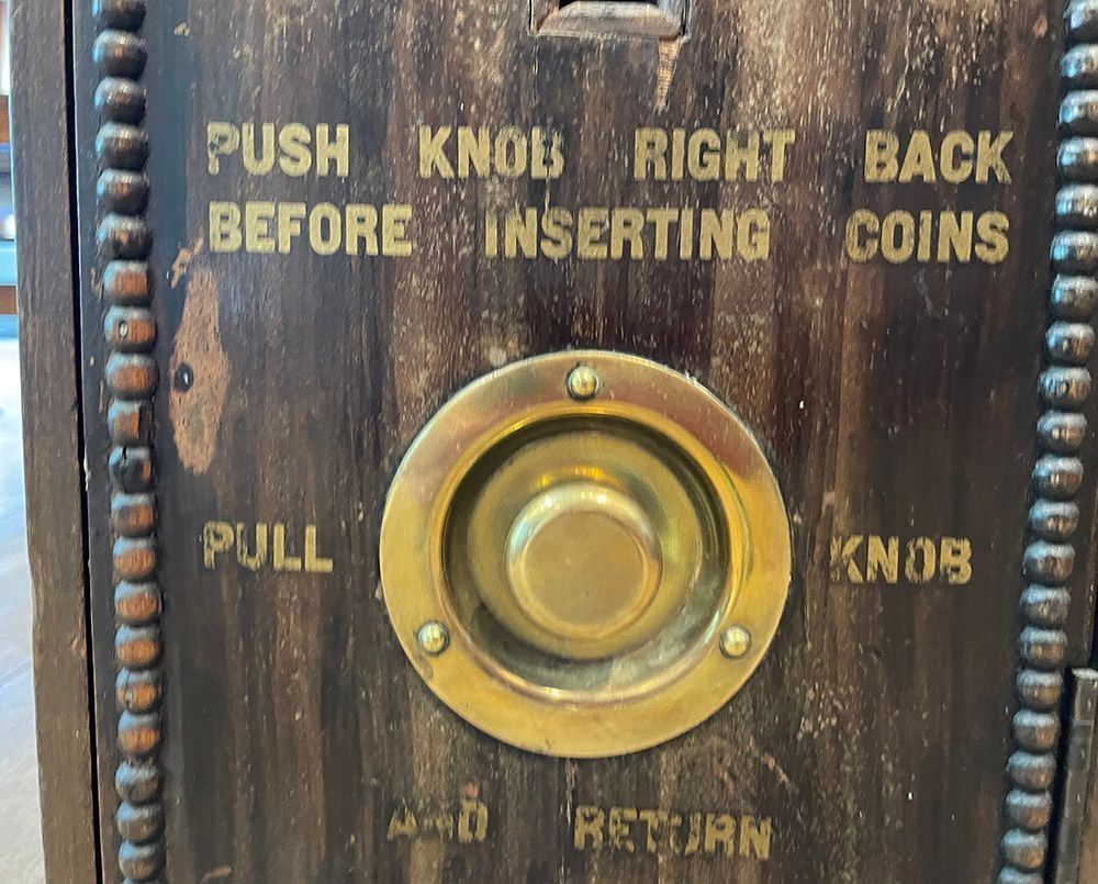 Wooden cigarette dispenser, with copper plate top and fittings. The dispenser front has 'bobbin beading' moulding to decorate the edge.Context