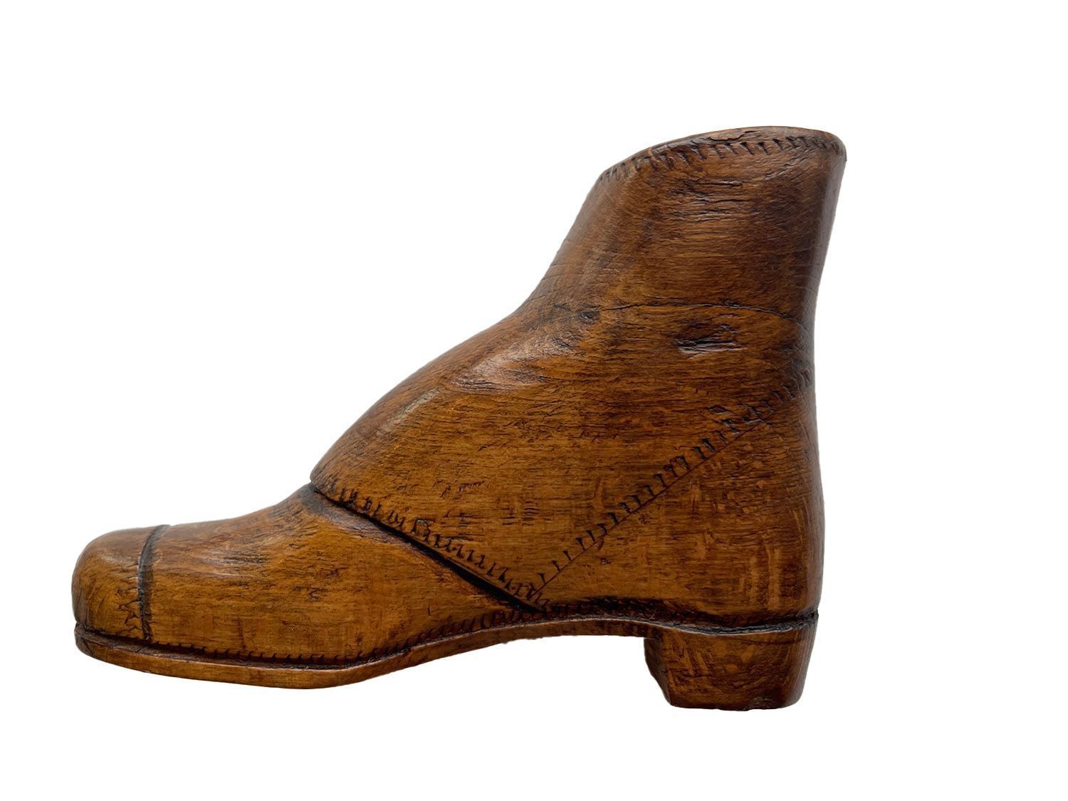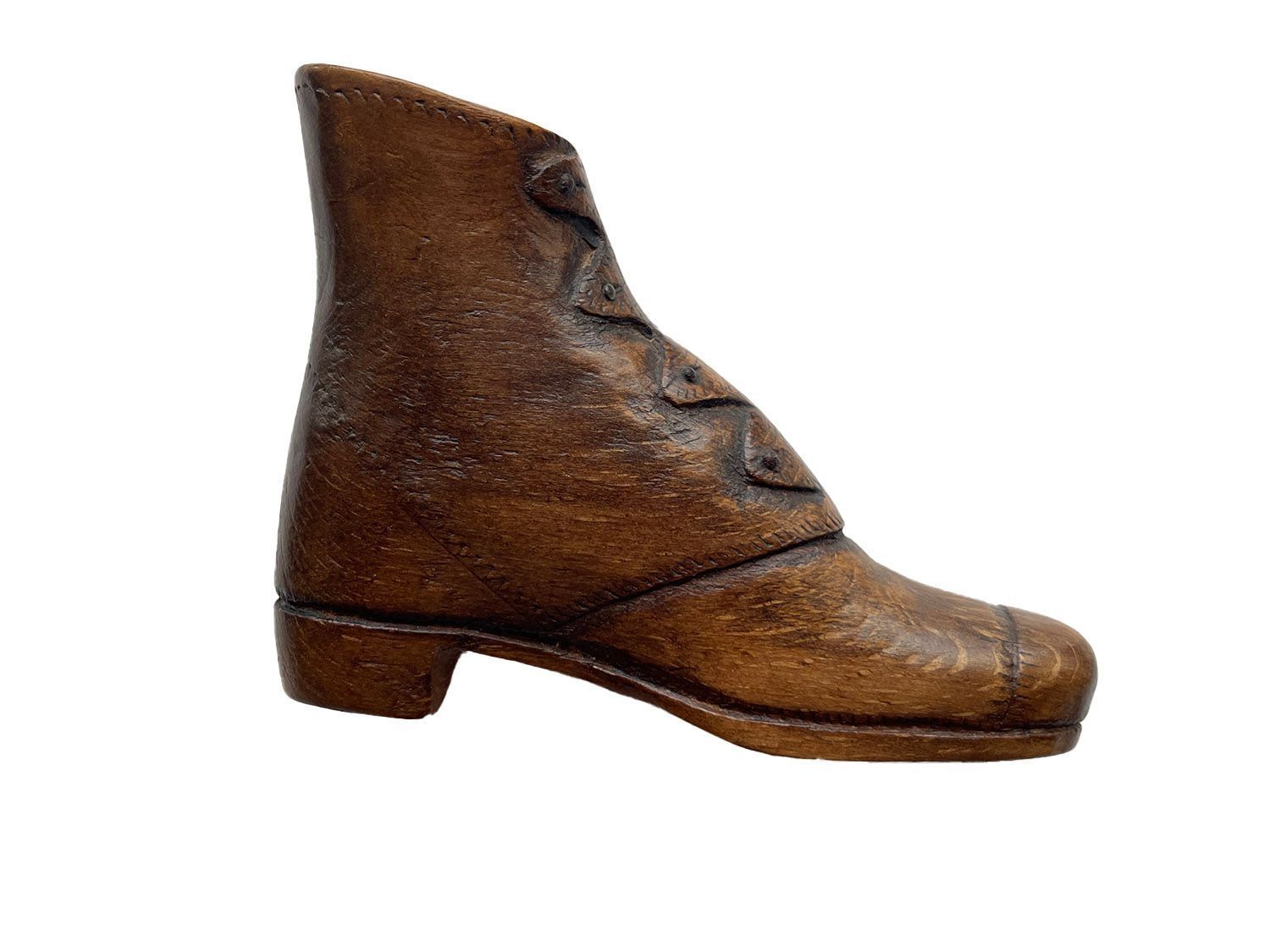 Wooden carved model of an ankle boot, showing button overlap fastening.Cataloged By