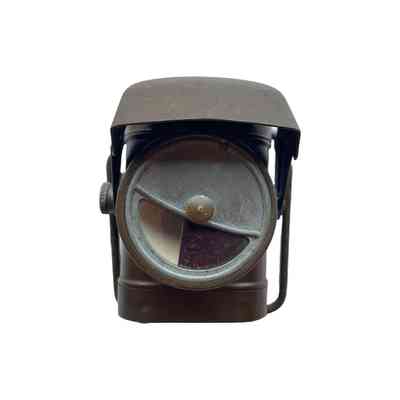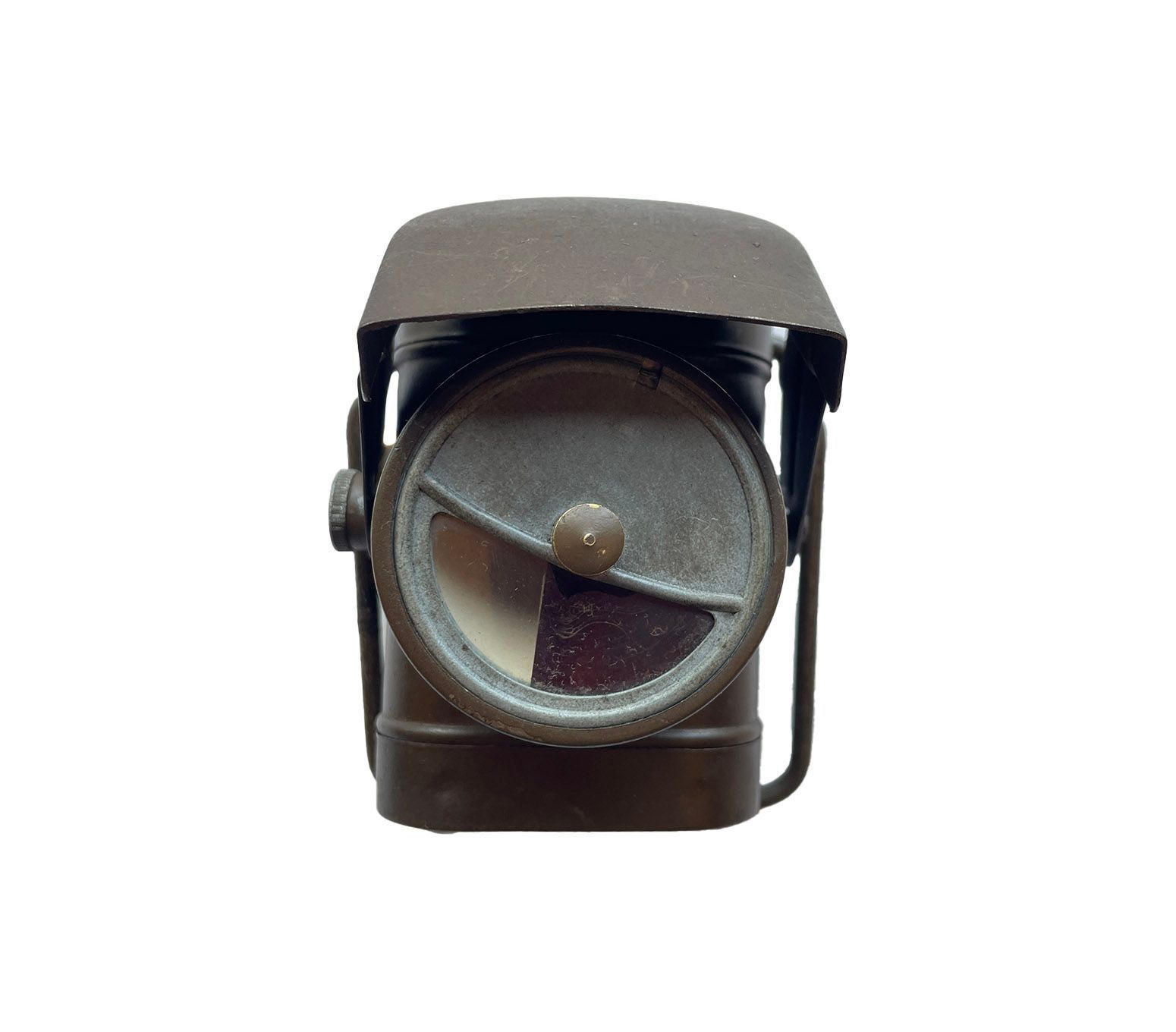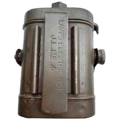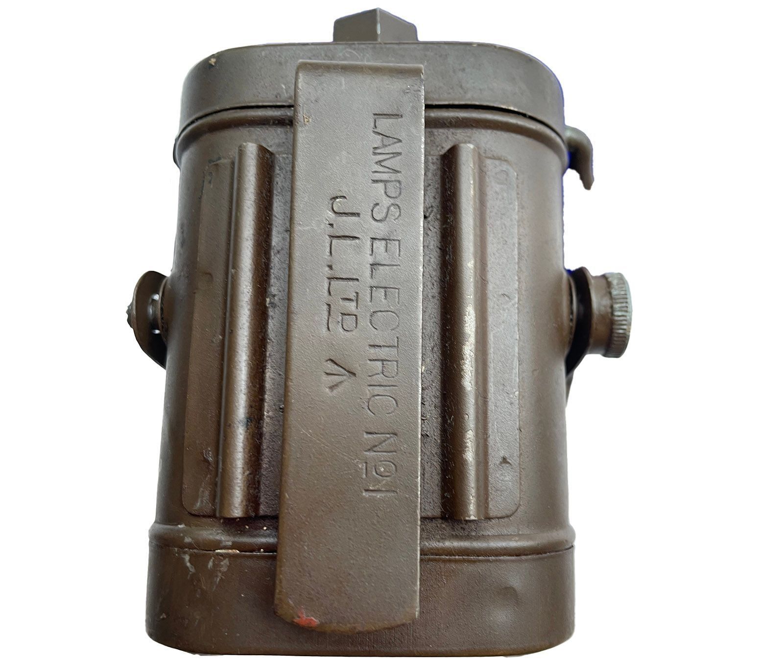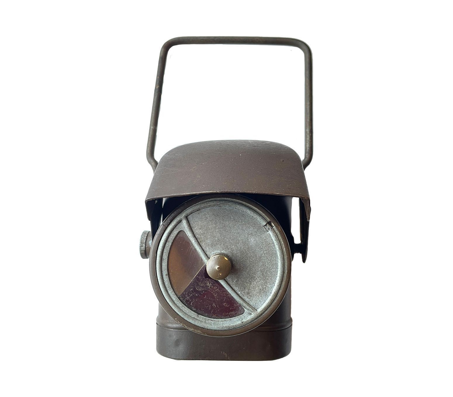 Khaki coloured metal lamp with handle, pull over black out shield to cover the lens, a sturdy clip at the back, and swivelling shutter in front of the light to black out the torch light.Context