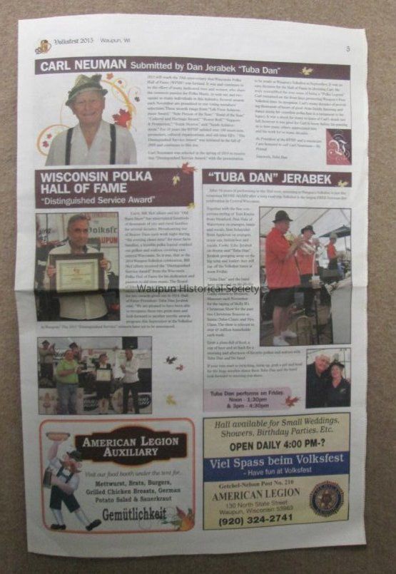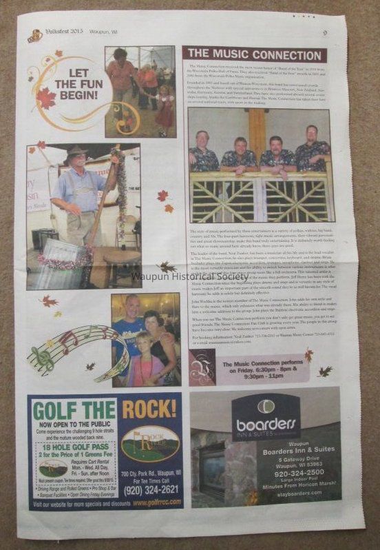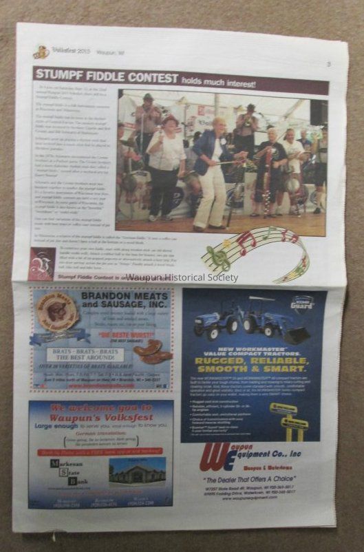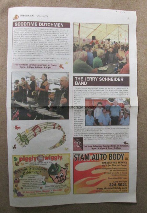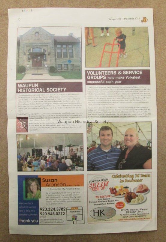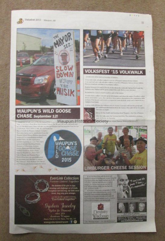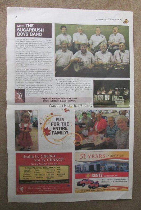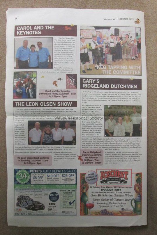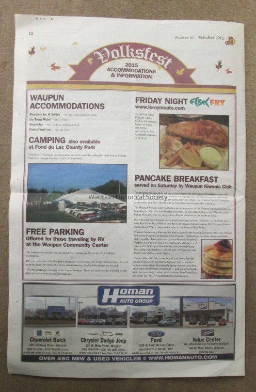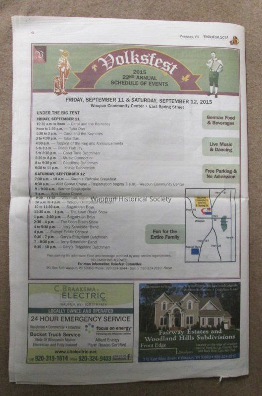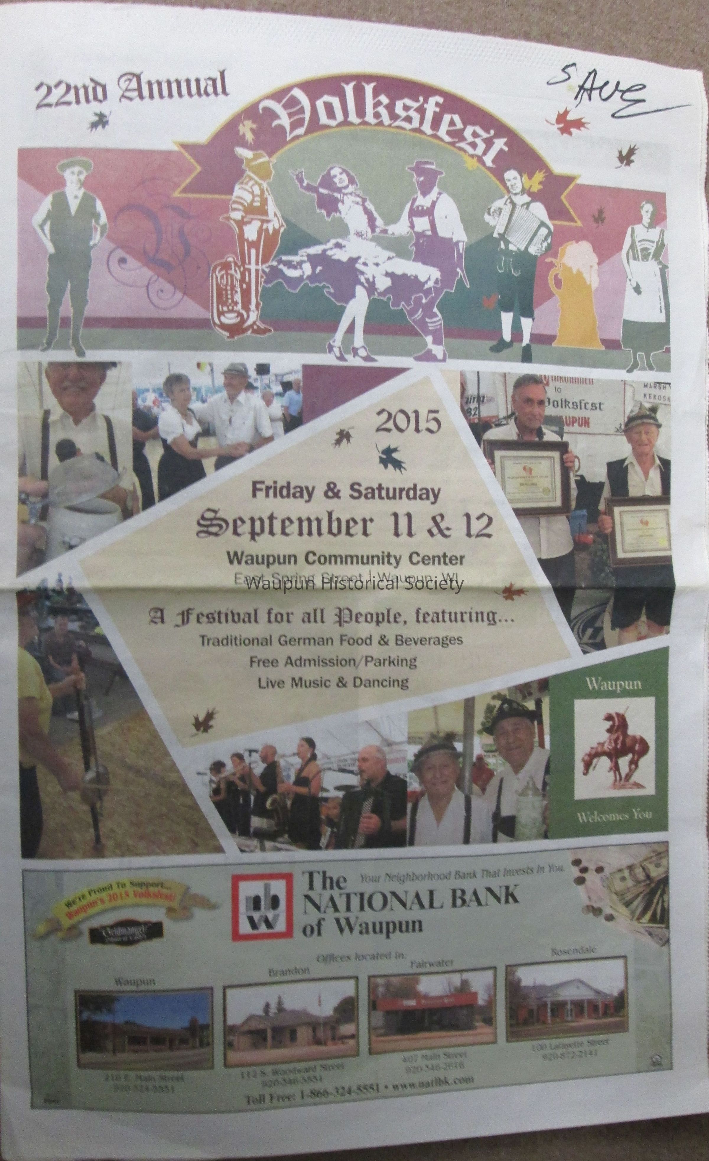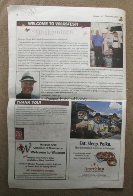 The twelve page news paper features Waupun's 22nd Annual Volksfest Festival. Featuring German food, music and dancing, the publication highlights entertainment, accomodations, events and sponsors.