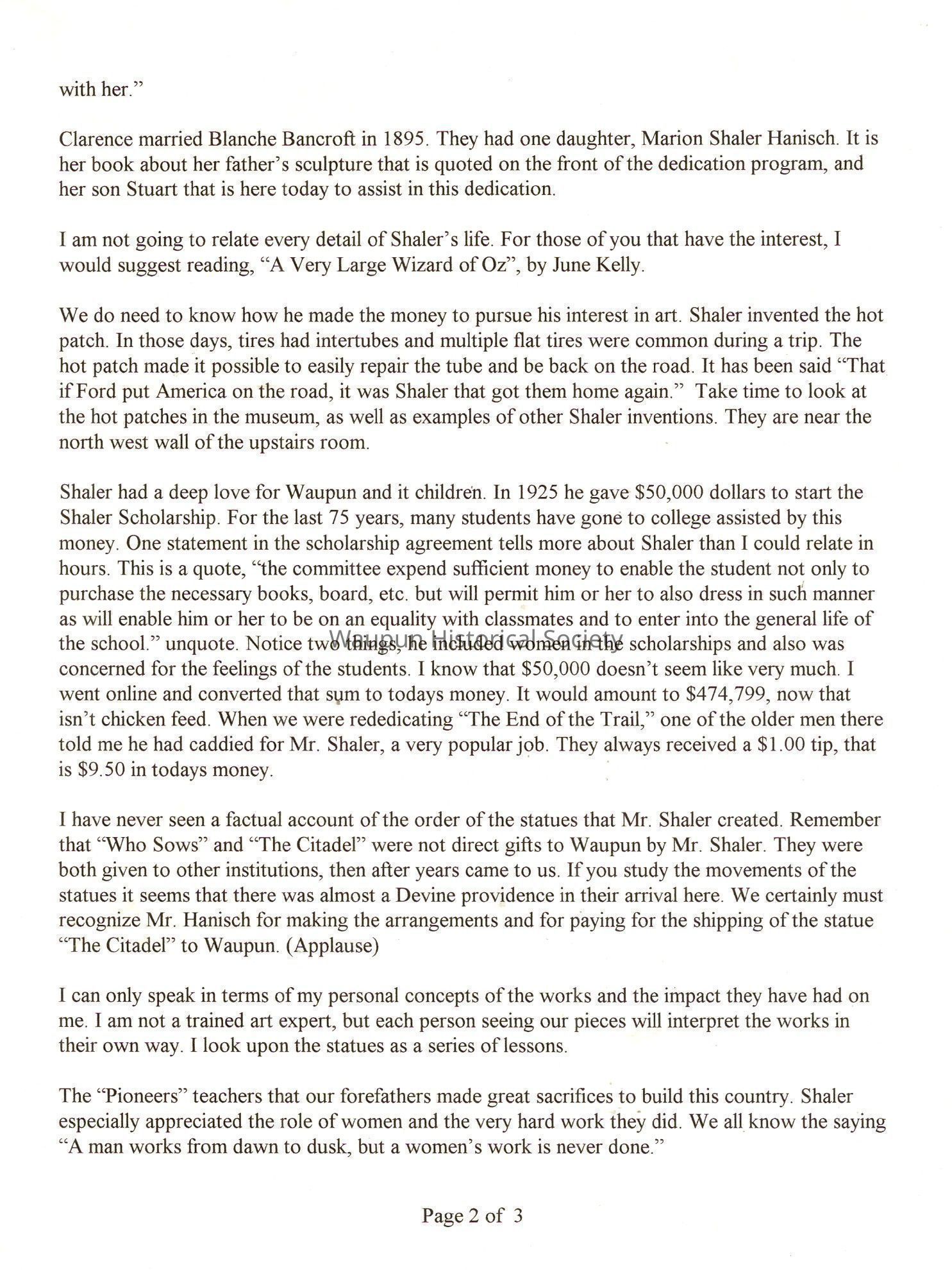 I have never seen a factual account of the order of the statues that Mr. Shaler created. Remember that "Who Sows" and "The Citadel" were not direct gifts to Waupun by Mr. Shaler. They were both given to other institutions, then after years came to us. If you study the movements of the statues it seems that there was almost a Devine providence in their arrival here. We certainly must recognize Mr. Hanisch for making the arrangements and for paying for the shipping of the statue "The Citadel" to Waupun. (Applause)