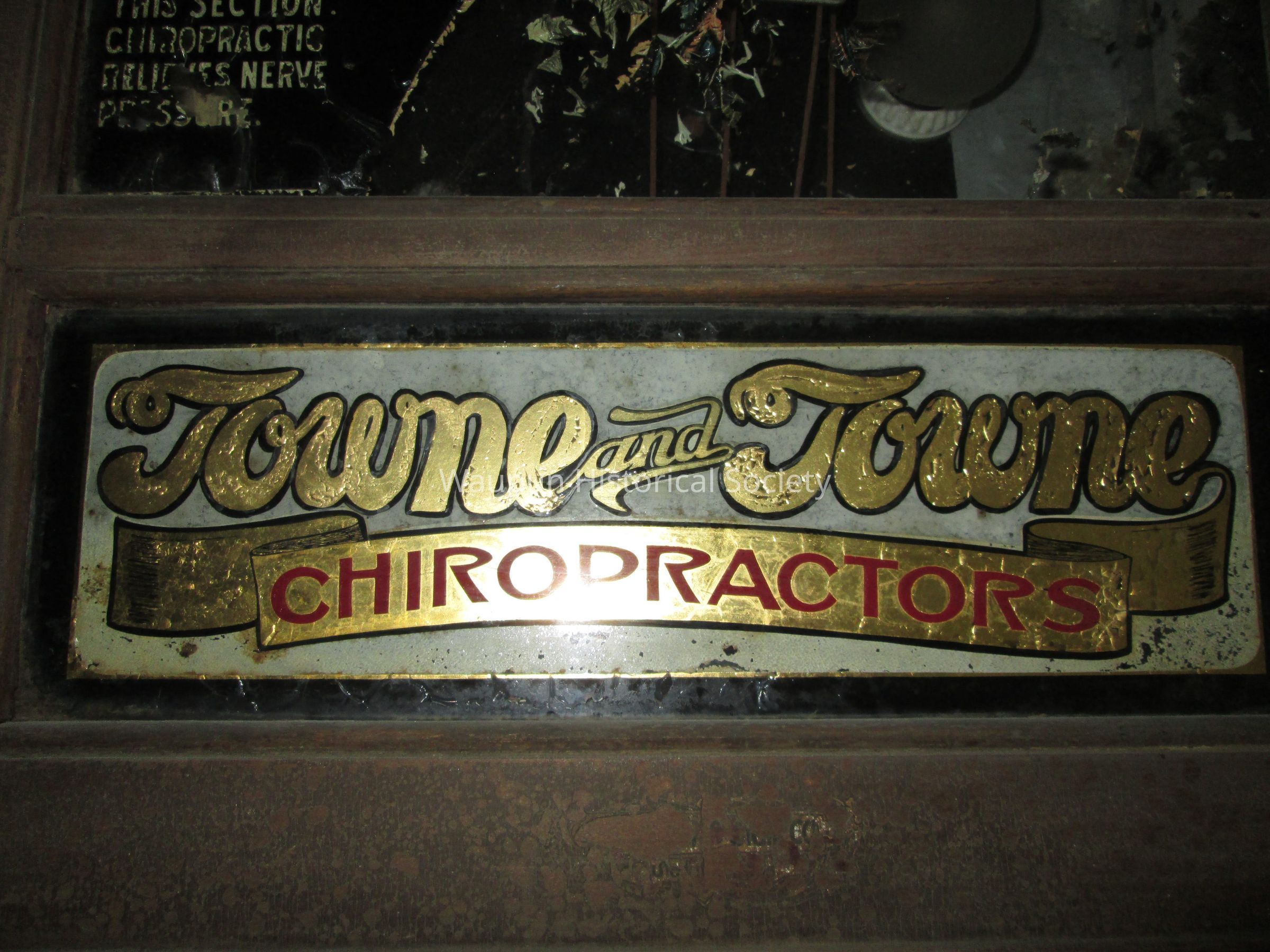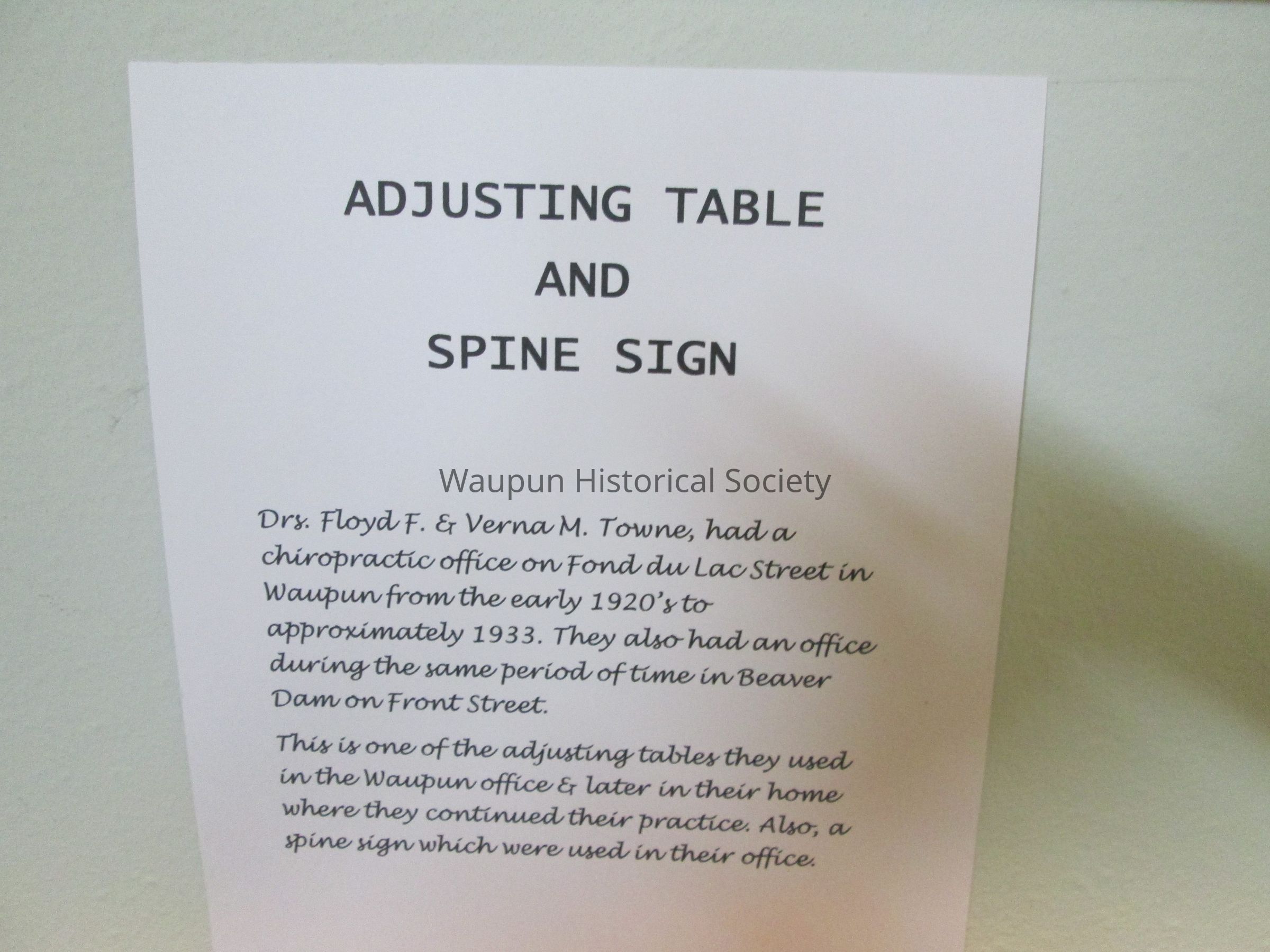 Chiropractic spine sign used in the office of Drs. Floyd F. & Verna M. Towne of Waupun, Wis. from the early 1920's to approximately 1933, and later used in their home where they continued their practice.