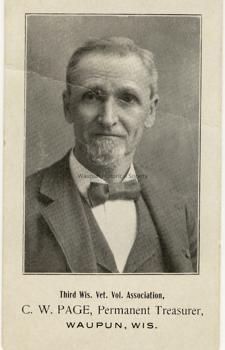 This is a photo of C.W. Page who lived at 534 E Franklin St. Below the picture it reads: Third Wis. Vet. Vol. Association, C.W. Page, Permanent Treasurer, Waupun, WIAcquisition