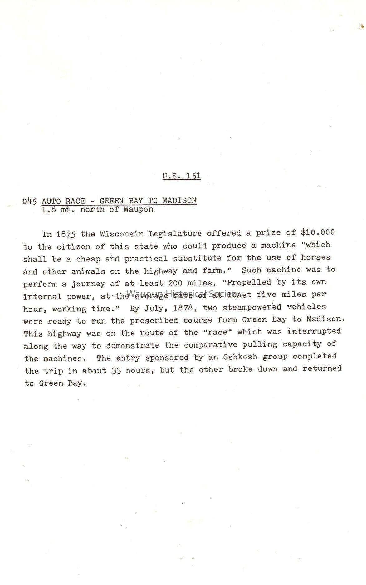 In 1875 the Wisconsin Legislature offered a prize of $10,000 to the citizen of this state who could produce a machine "which shall be a cheap and practical substitute for the use of horses and other animals on the highway and farm." Such machine was to perform a journey of at least 200 miles, "Propelled by its own internal power, at-the average rate of at least five miles per hour, working time." By July, 1878, two steampowered vehicles were ready to run the prescribed course form Green Bay to Madison. This highway was on the route of the "race" which was interrupted along the way to demonstrate the comparative pulling capacity of the machines. The entry sponsored by an Oshkosh group completed the trip in about 33 hours, but the other broke down and returned to Green Bay.