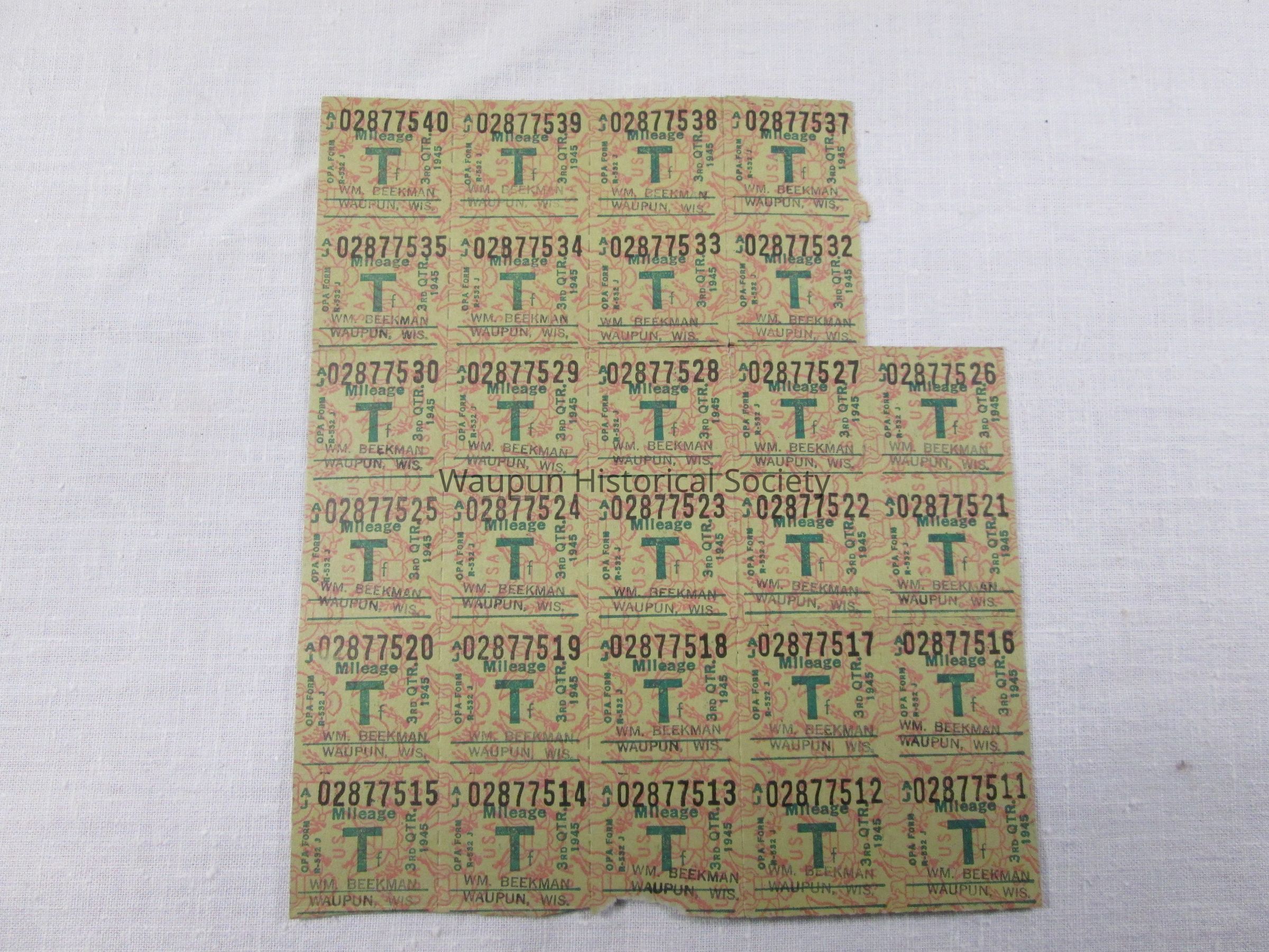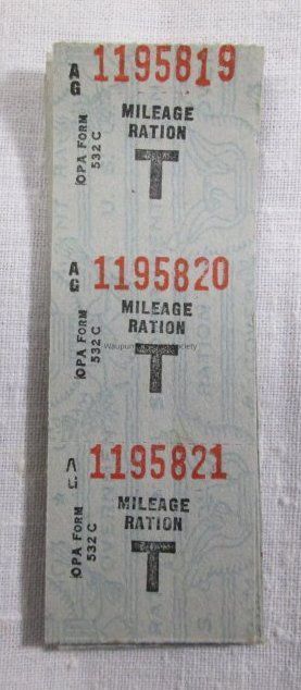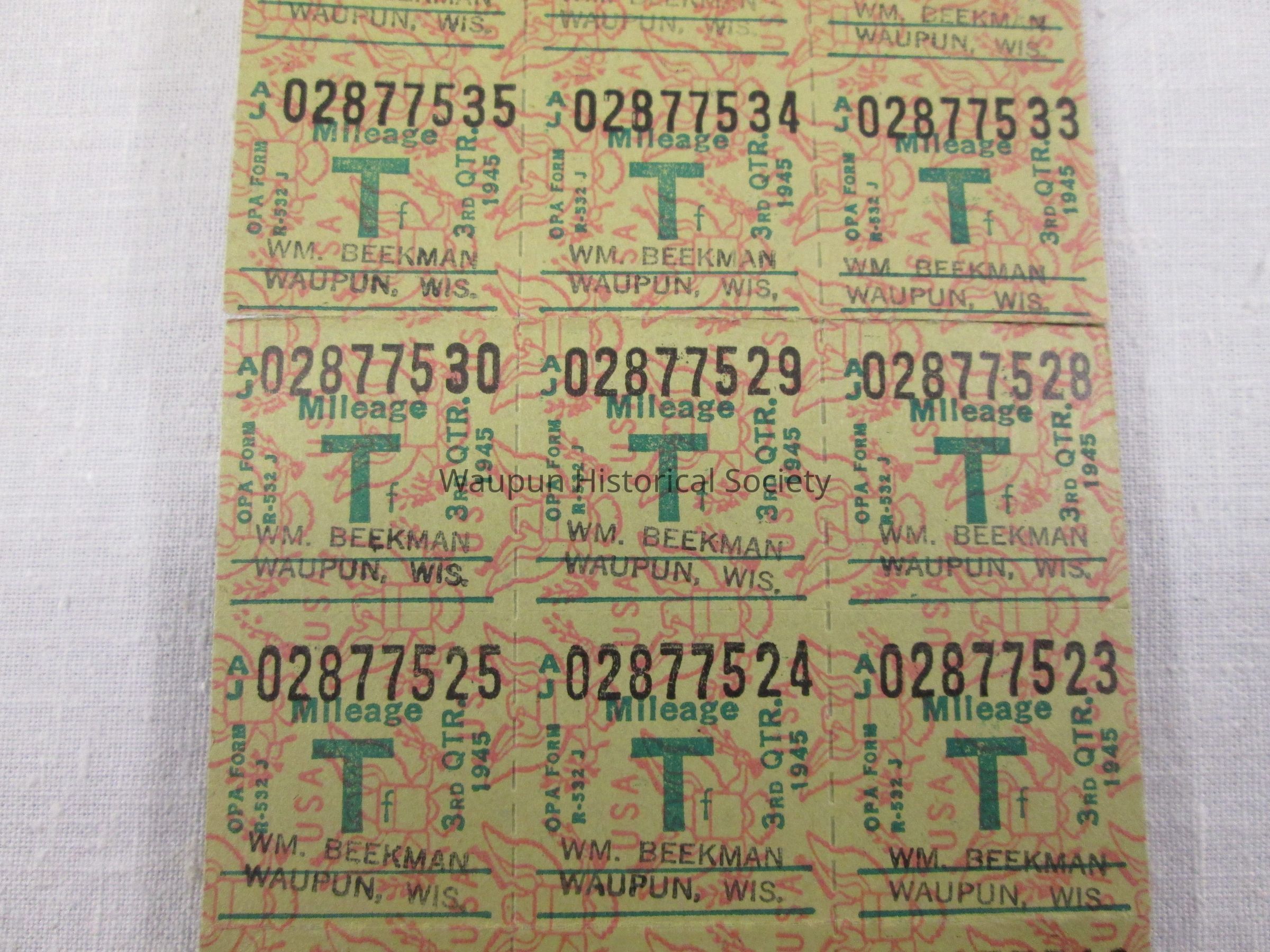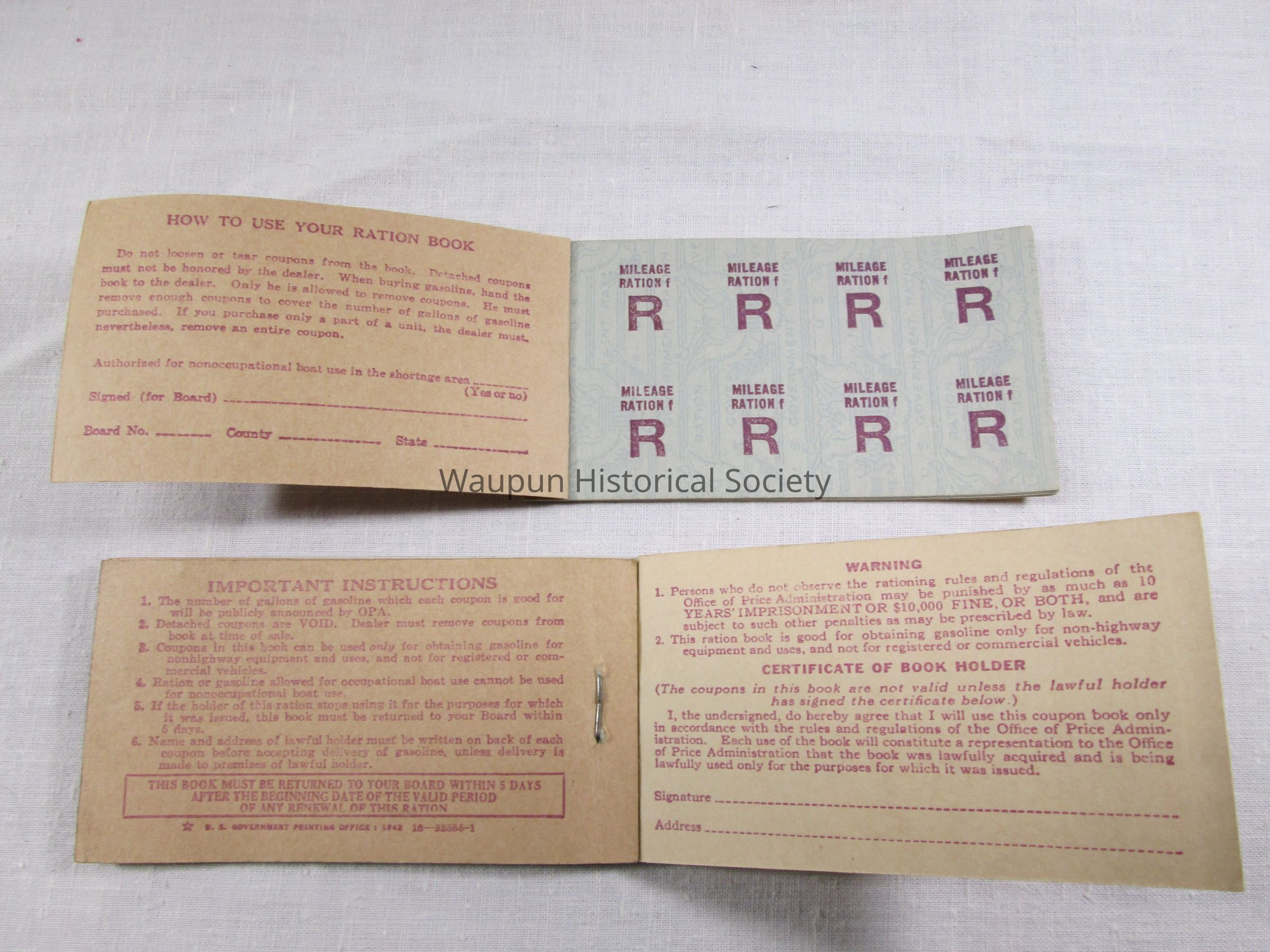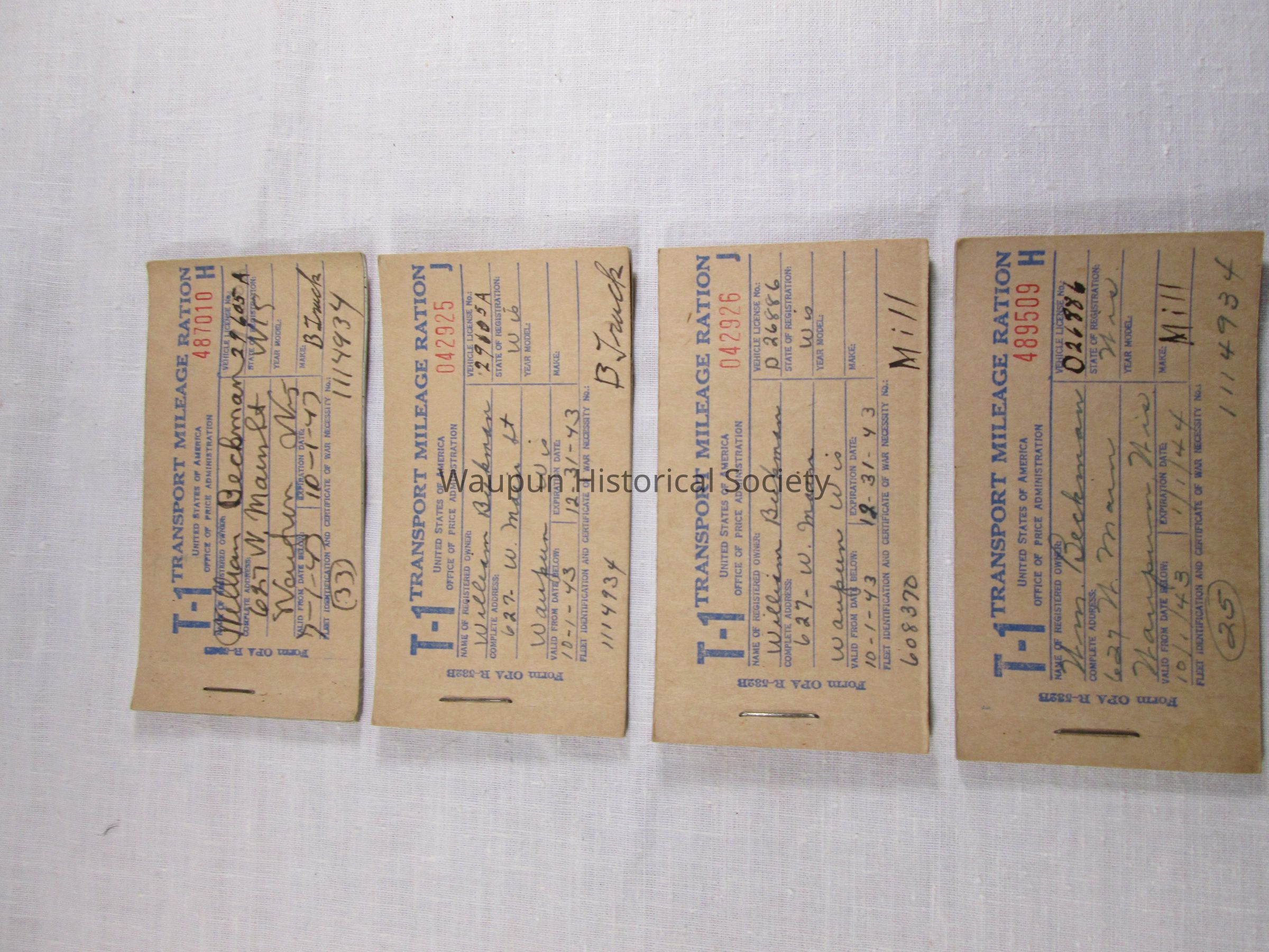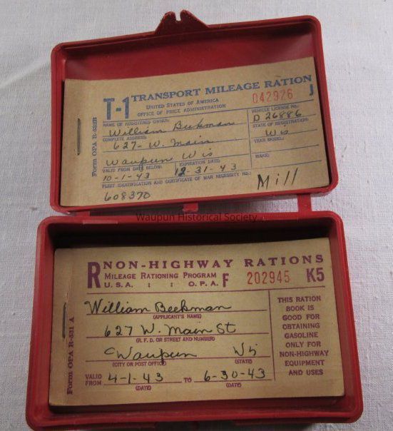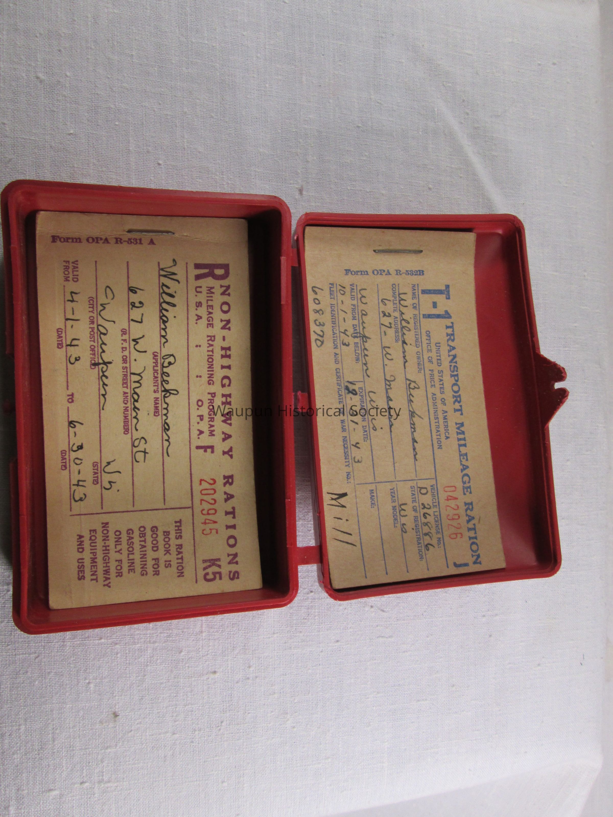 Red hinged plastic box containing books of ration tickets, 3 Nonhighway R Rations books, 4 T-1 Transport Mileage Ration books, Mileage Ration Identification Folder with instructions for use of rations, Rations Identification Card, Seven A17 Mileage Rations with Identification Card attached and 18 Mileage T Ration. One B Milage Ration Sticker.Acquisition