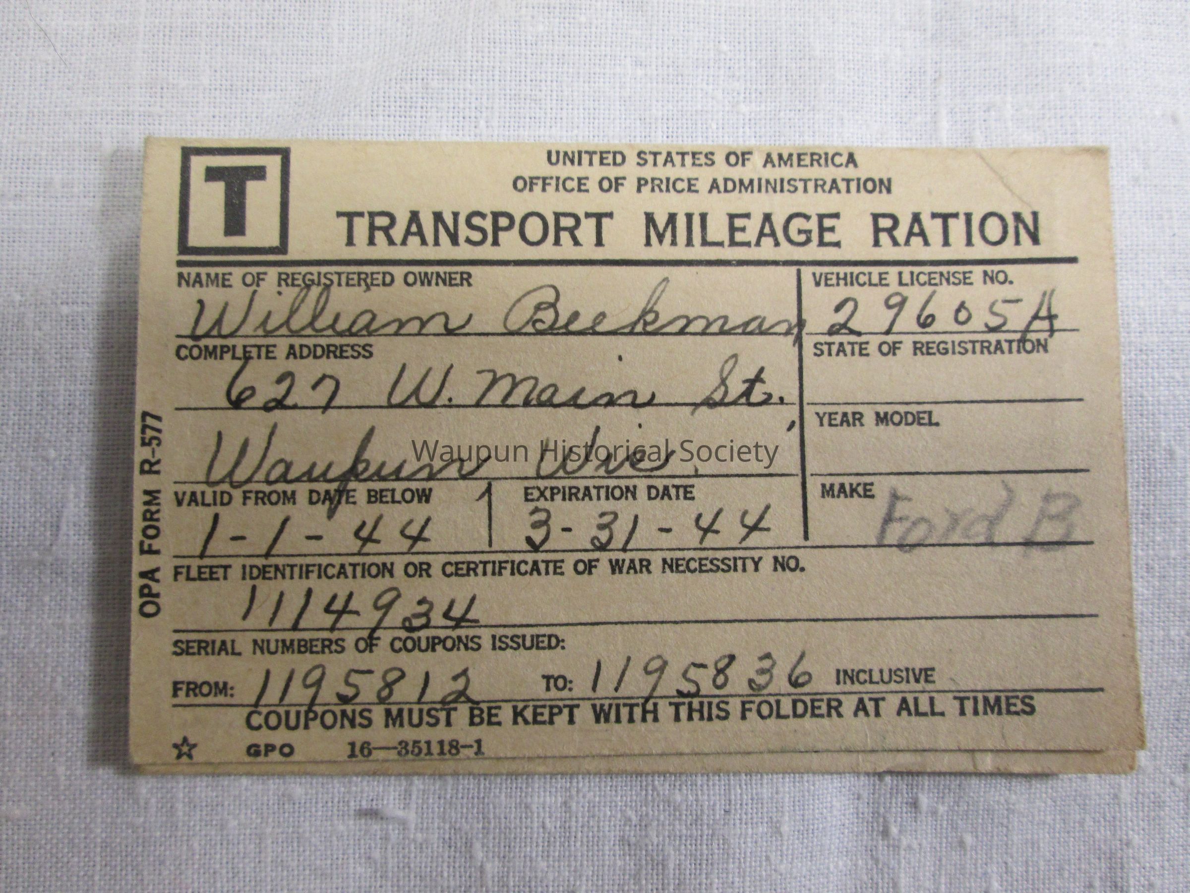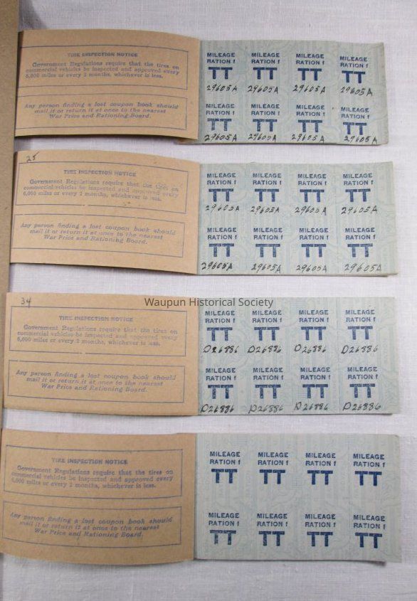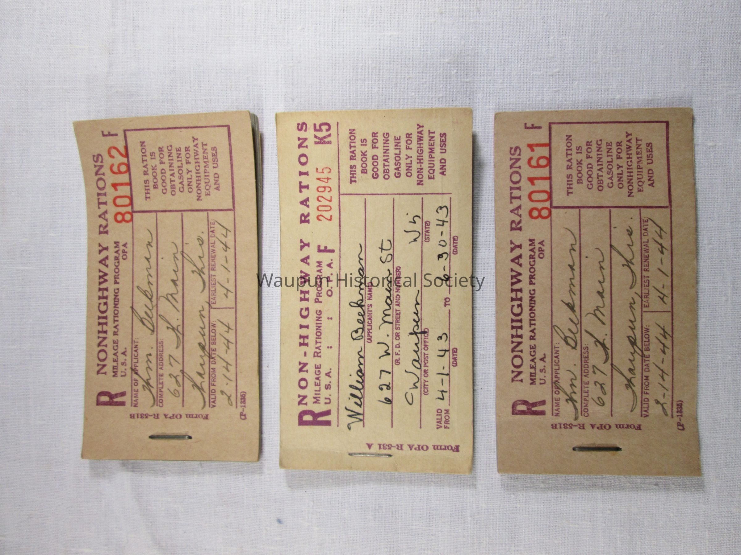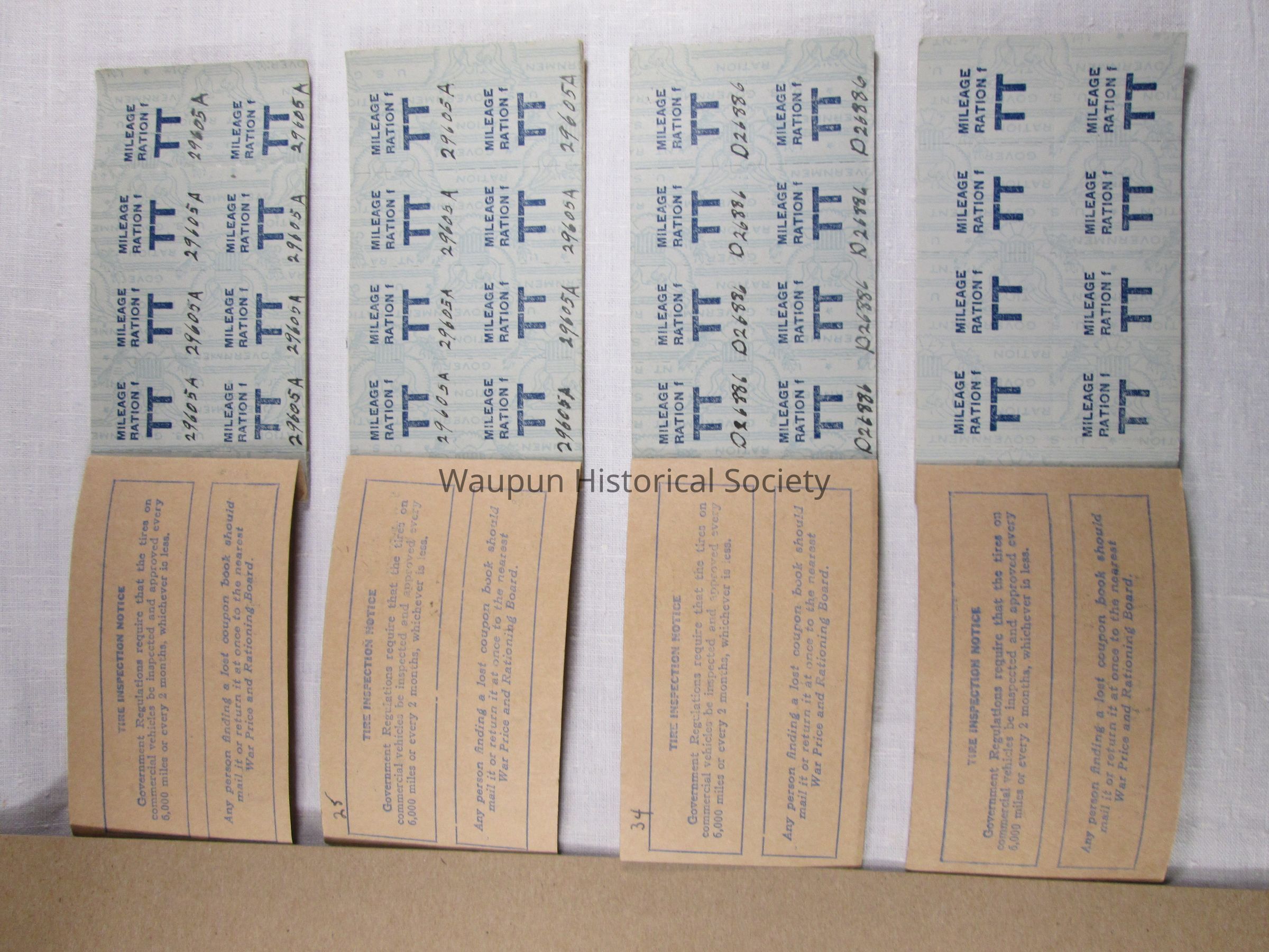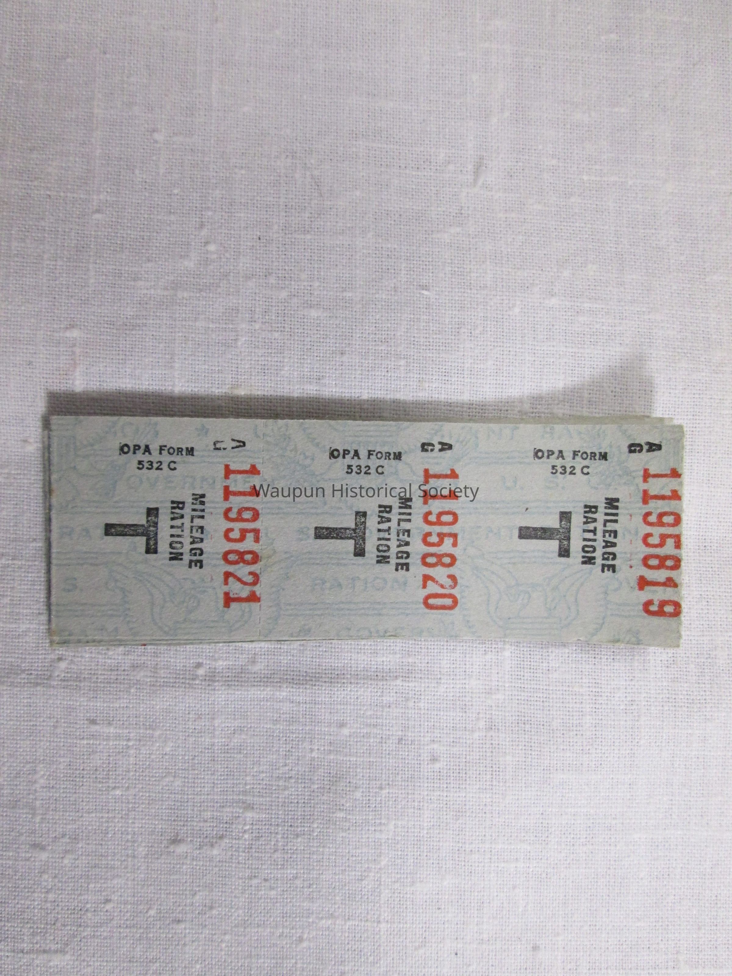 Red hinged plastic box containing books of ration tickets, 3 Nonhighway R Rations books, 4 T-1 Transport Mileage Ration books, Mileage Ration Identification Folder with instructions for use of rations, Rations Identification Card, Seven A17 Mileage Rations with Identification Card attached and 18 Mileage T Ration. One B Milage Ration Sticker.Acquisition