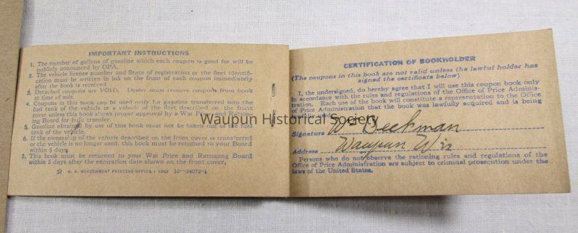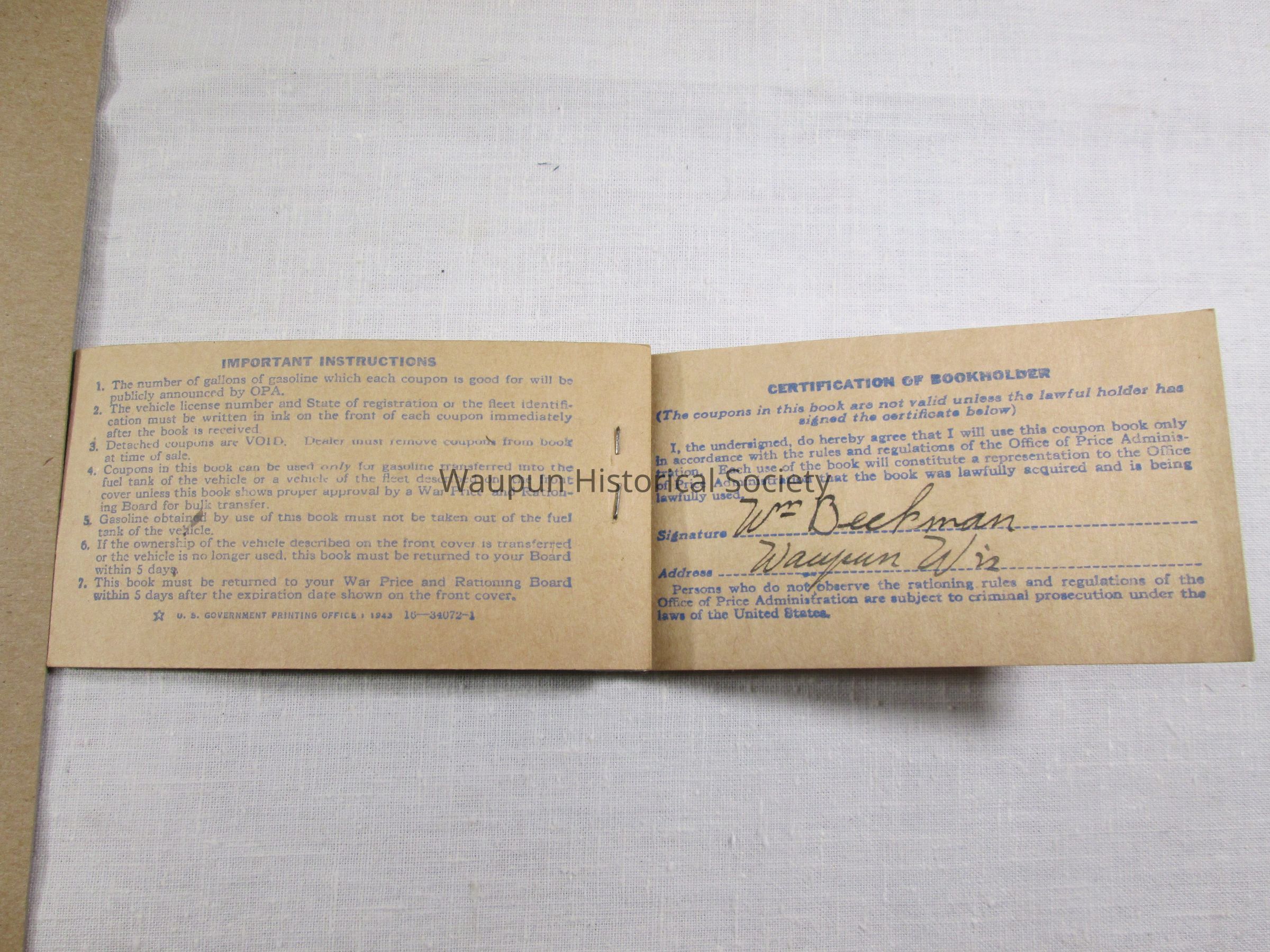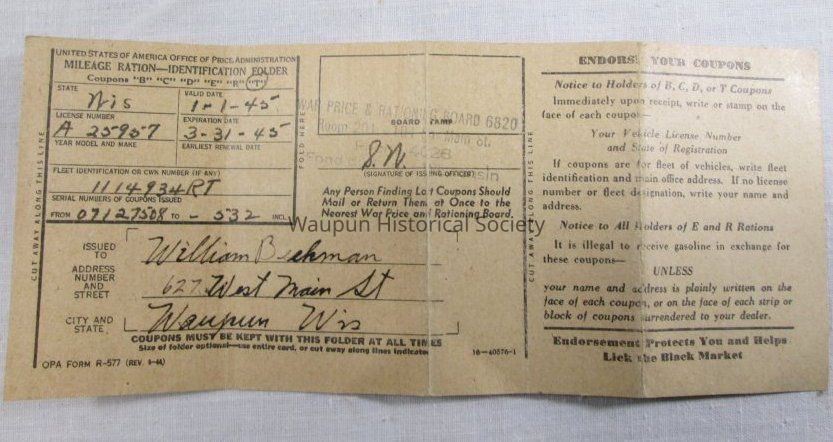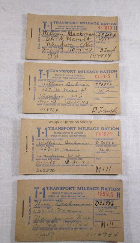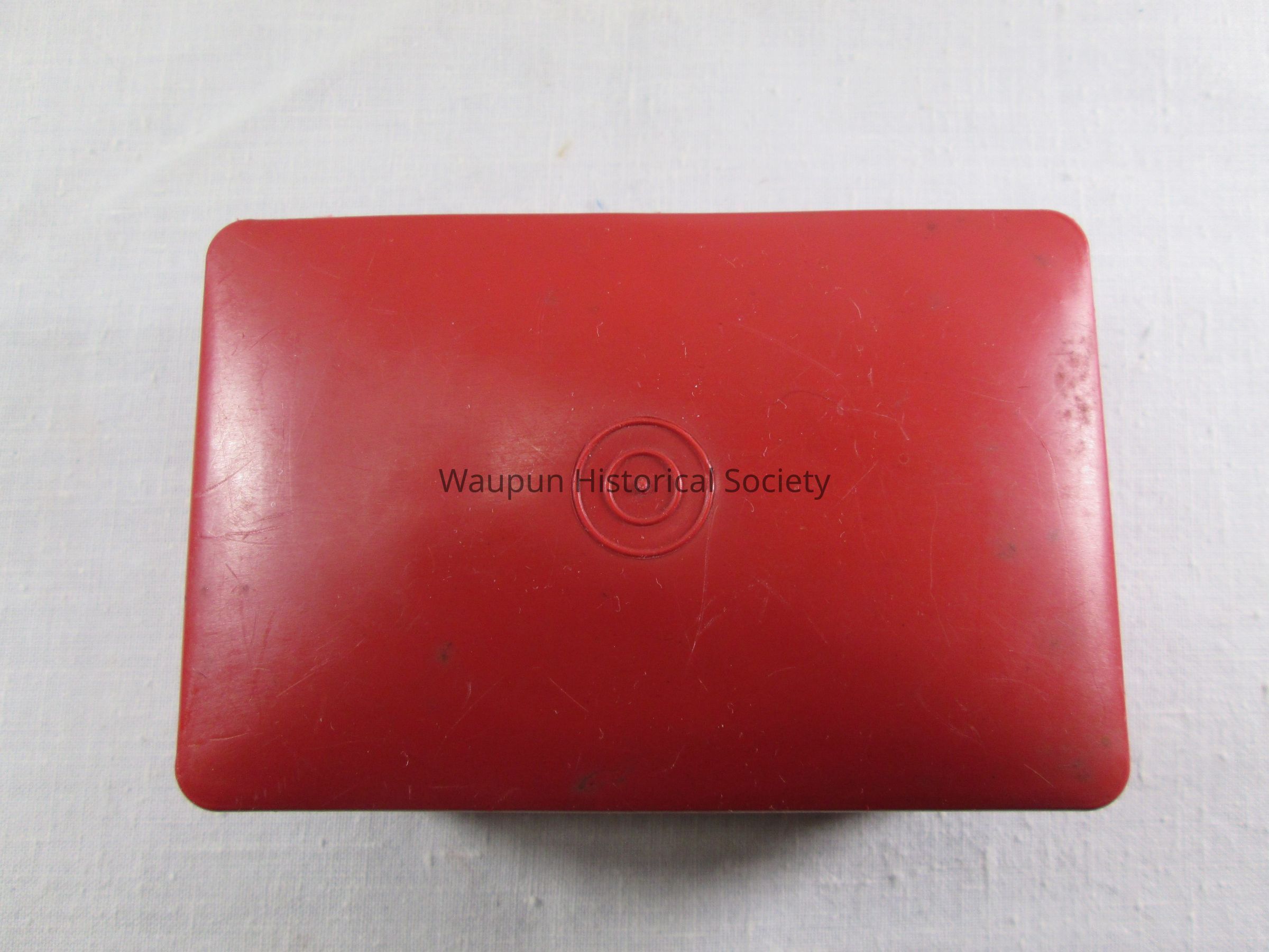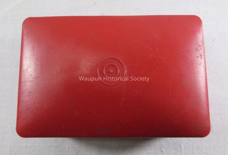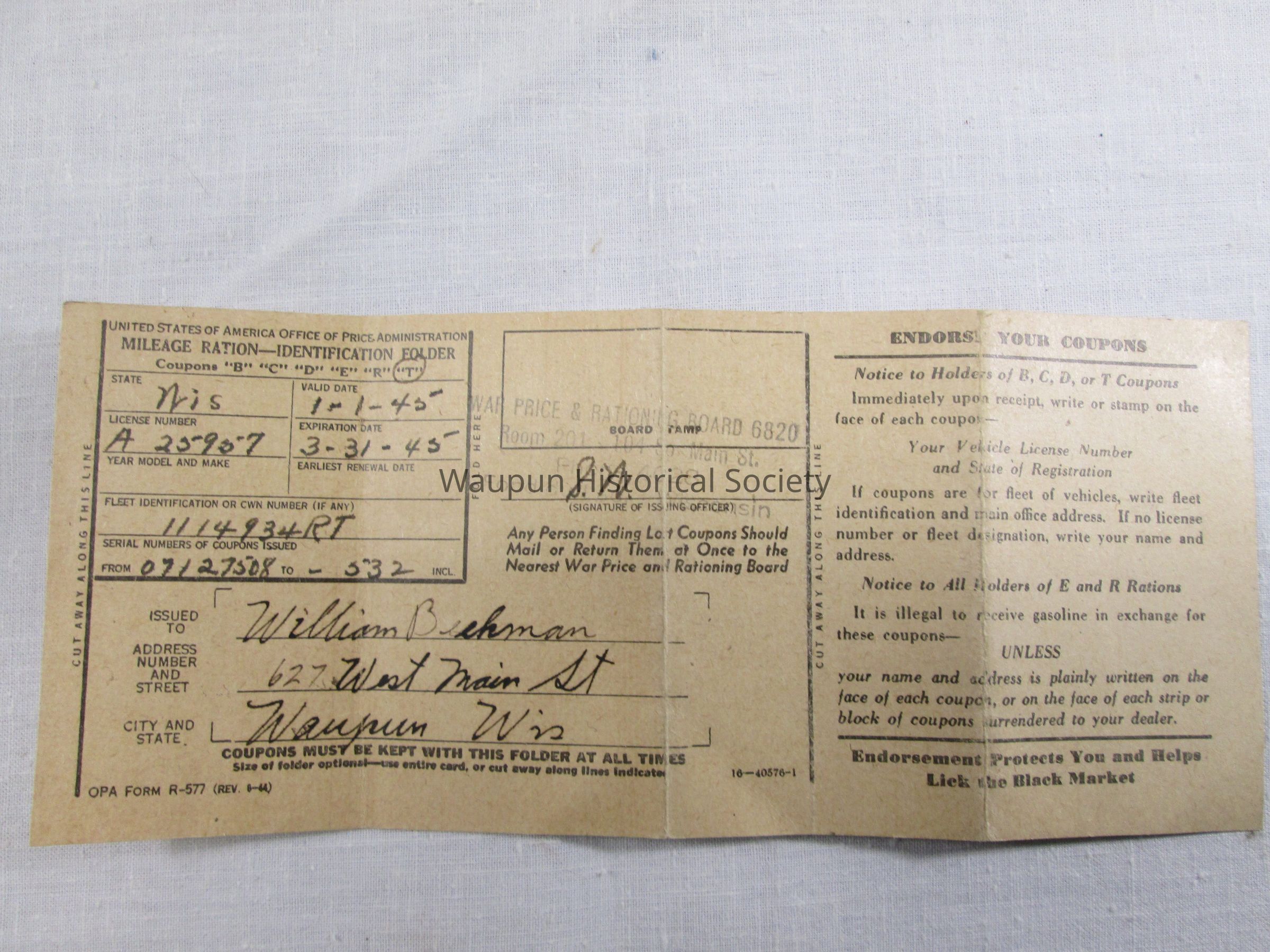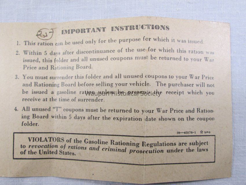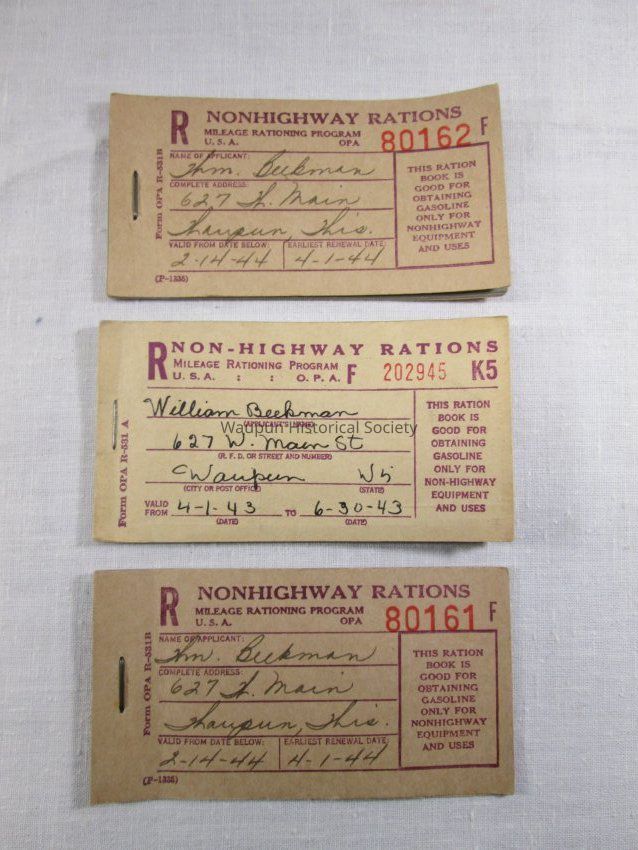 Red hinged plastic box containing books of ration tickets, 3 Nonhighway R Rations books, 4 T-1 Transport Mileage Ration books, Mileage Ration Identification Folder with instructions for use of rations, Rations Identification Card, Seven A17 Mileage Rations with Identification Card attached and 18 Mileage T Ration. One B Milage Ration Sticker.Acquisition