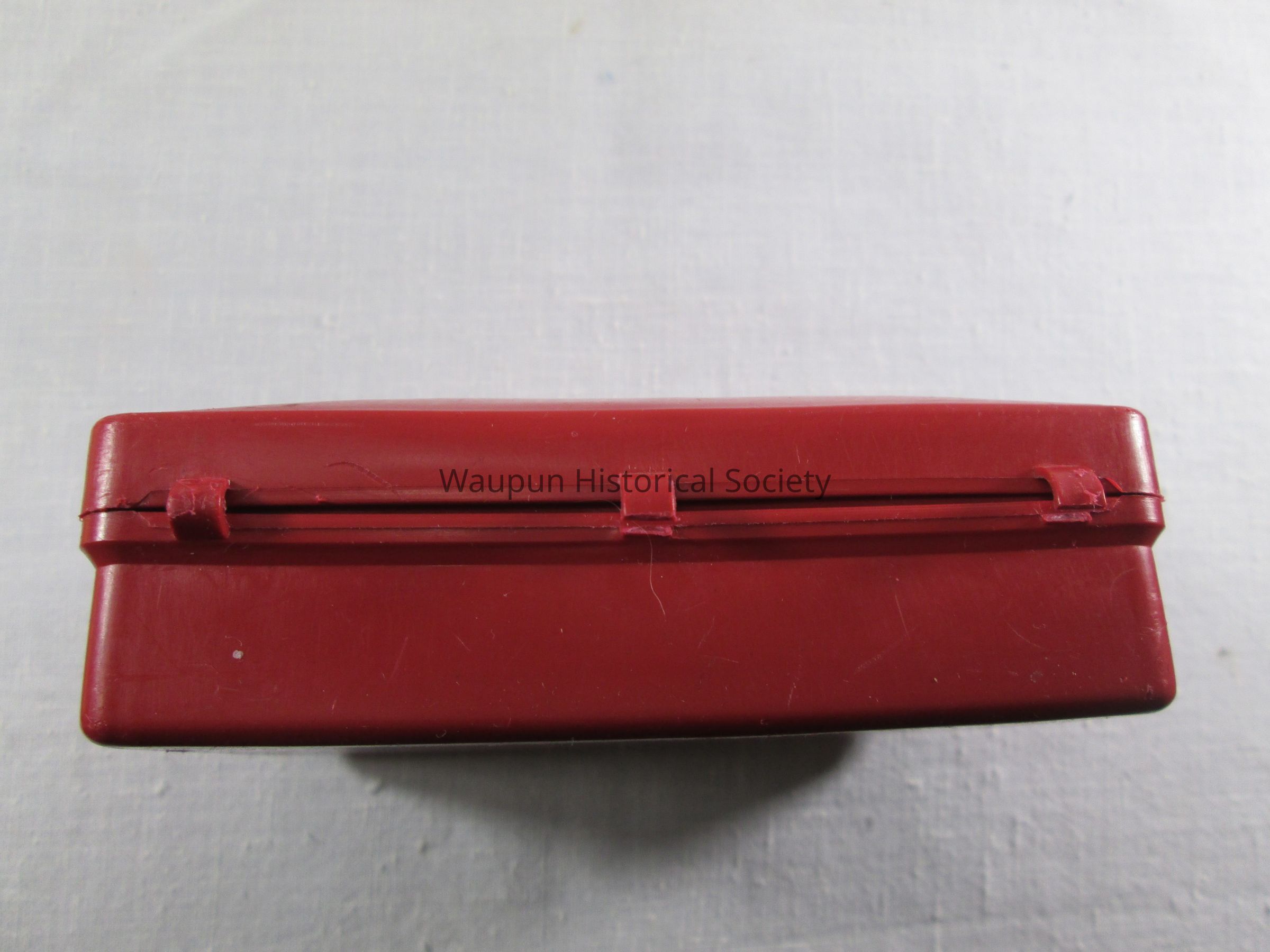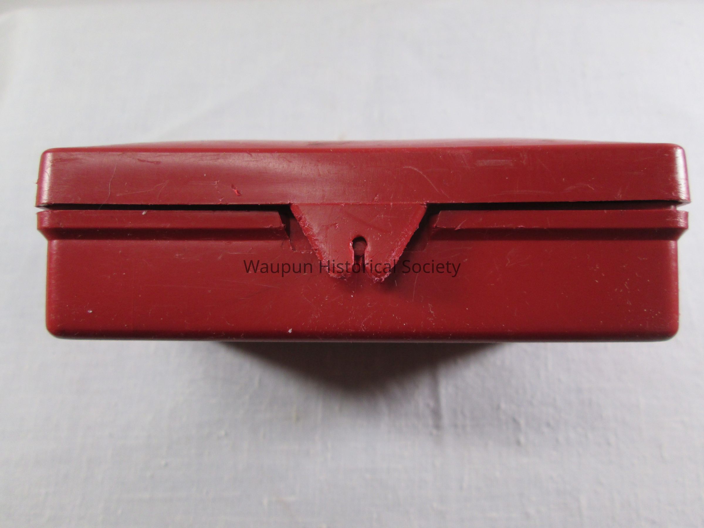 Red hinged plastic box containing books of ration tickets.Entry/Object ID