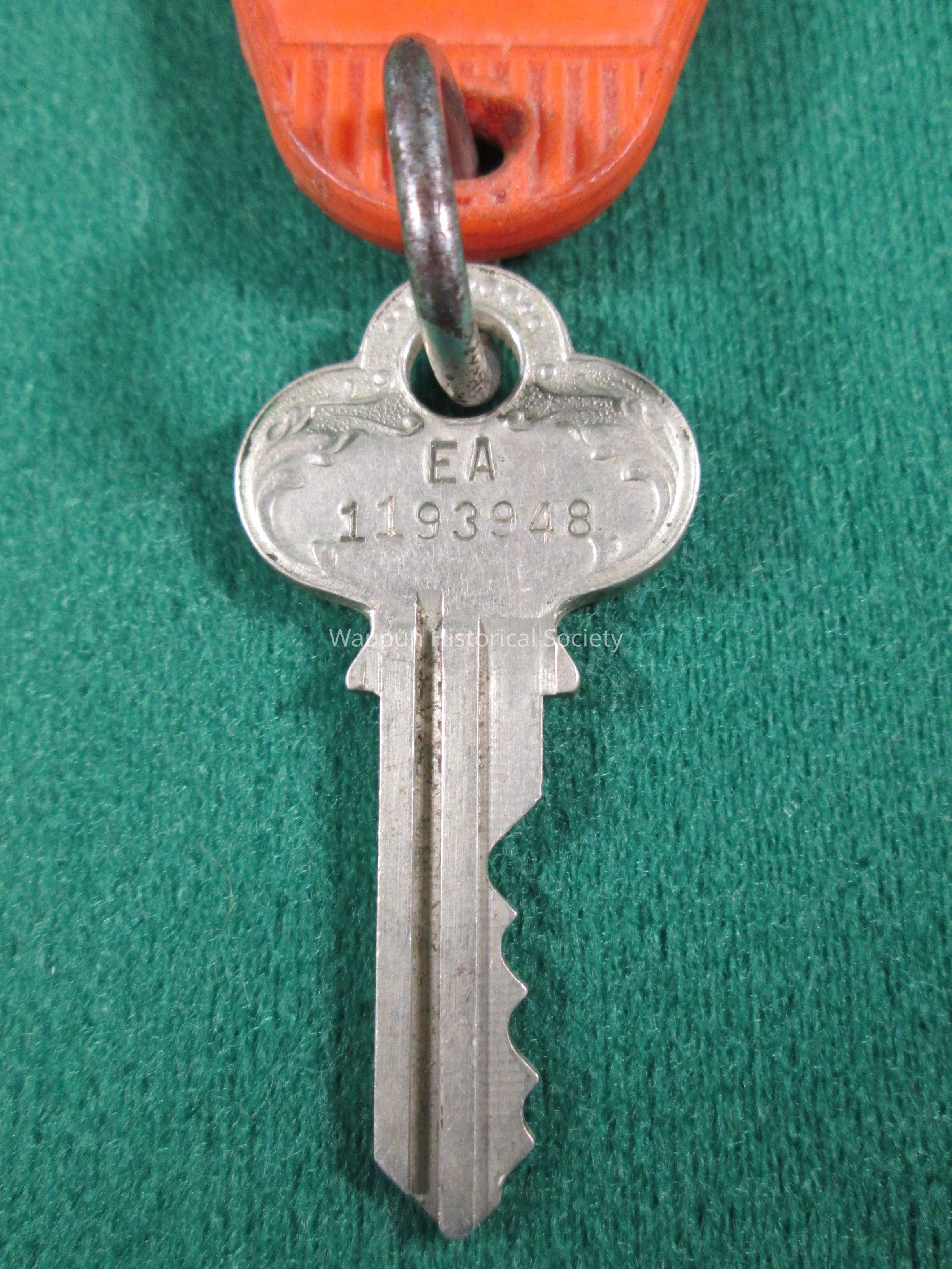 Key attached to orange key fob. The key is brass in color with floral detailing that surrounds the name P&F CORBIN, New Britain, CT.. The reverse side shows the same floral detail with the letters EA and the number 1193948 directly below the letters.