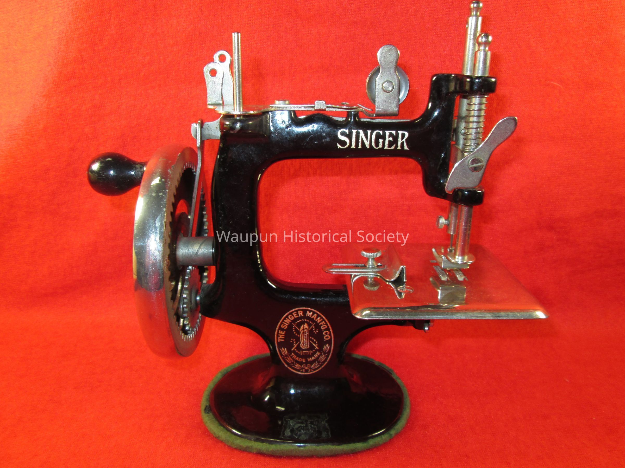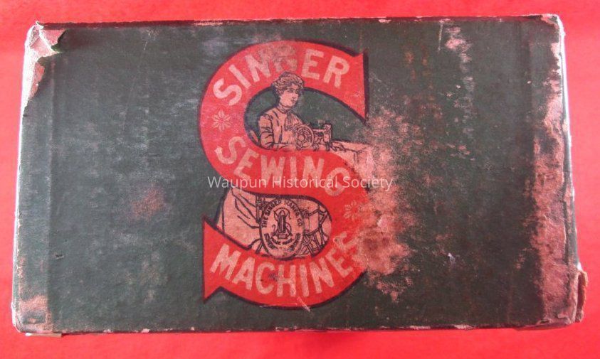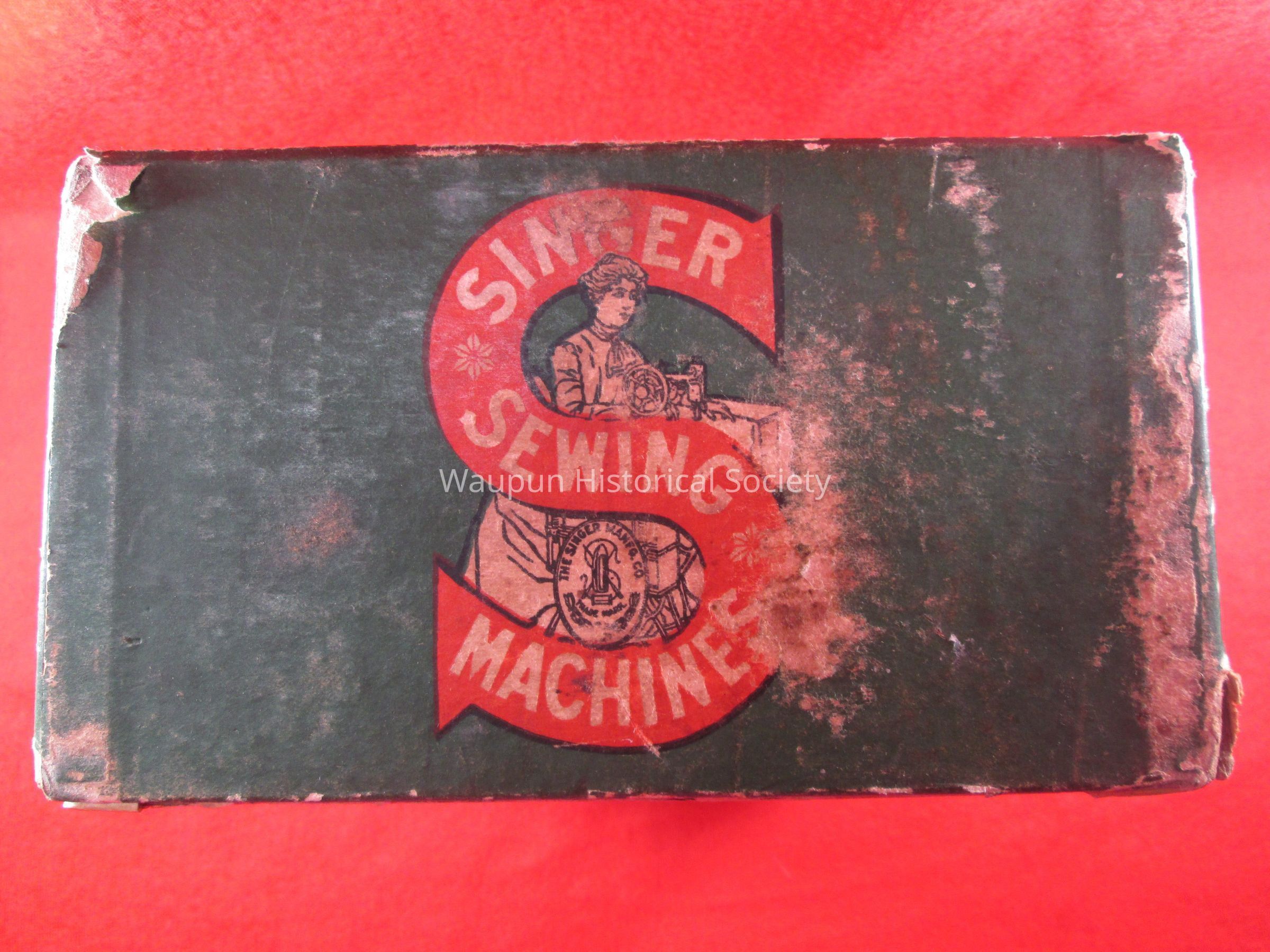 The side of the box has a Red S with the words, Singer Sewing Machine and and a picture of a lady sitting at a sewing machine.Acquisition