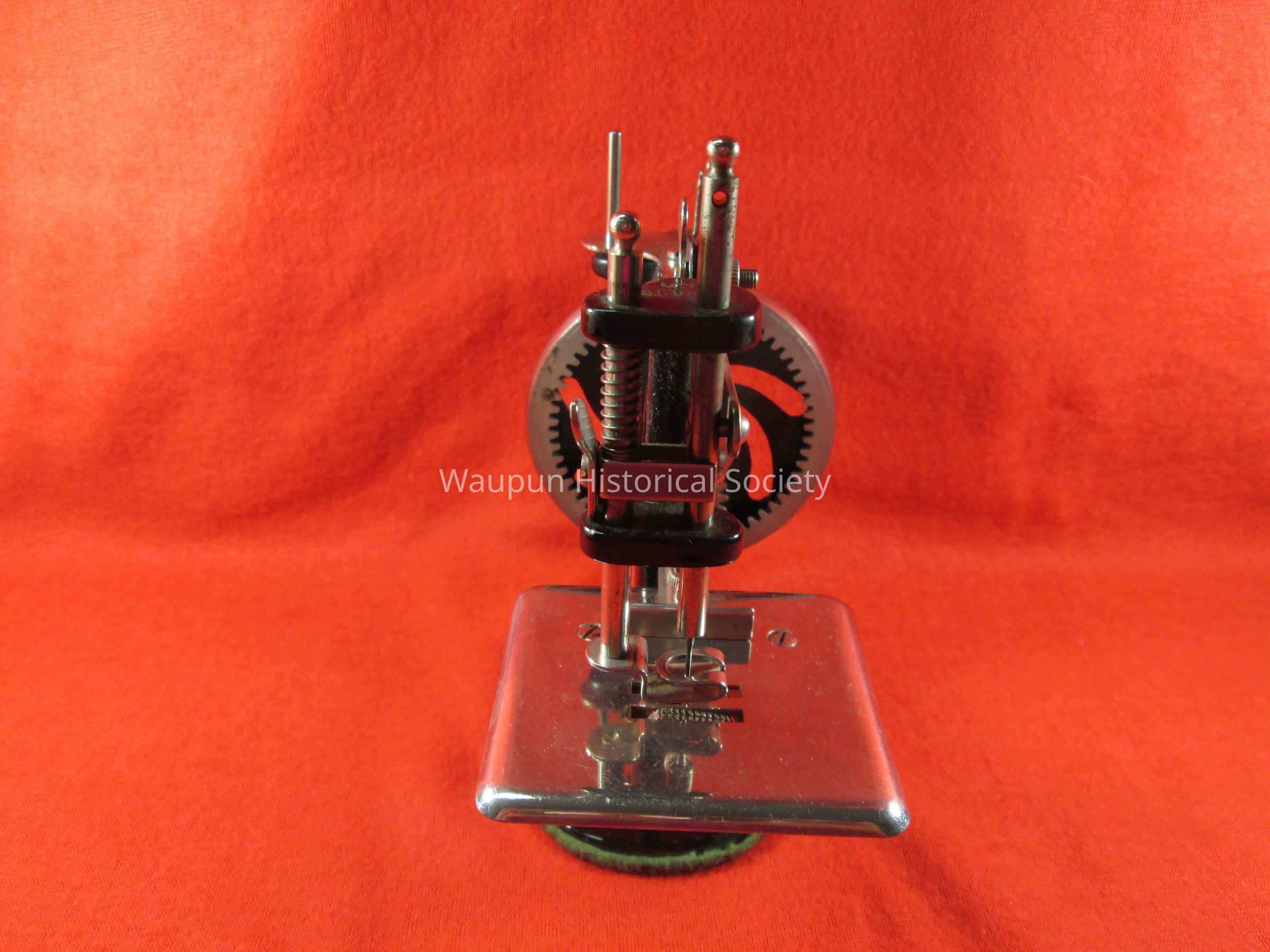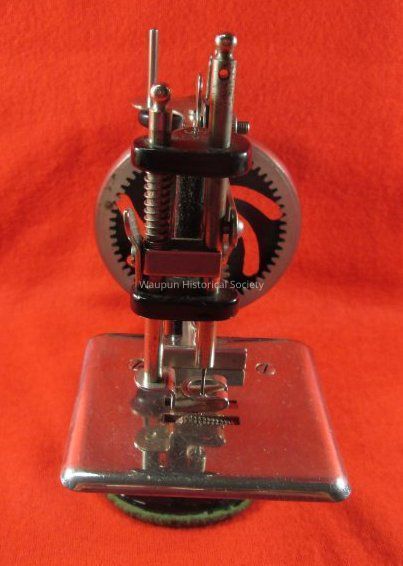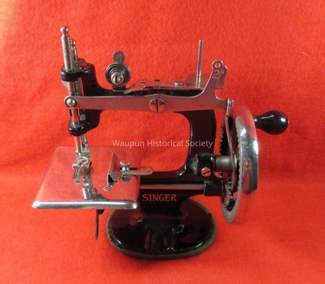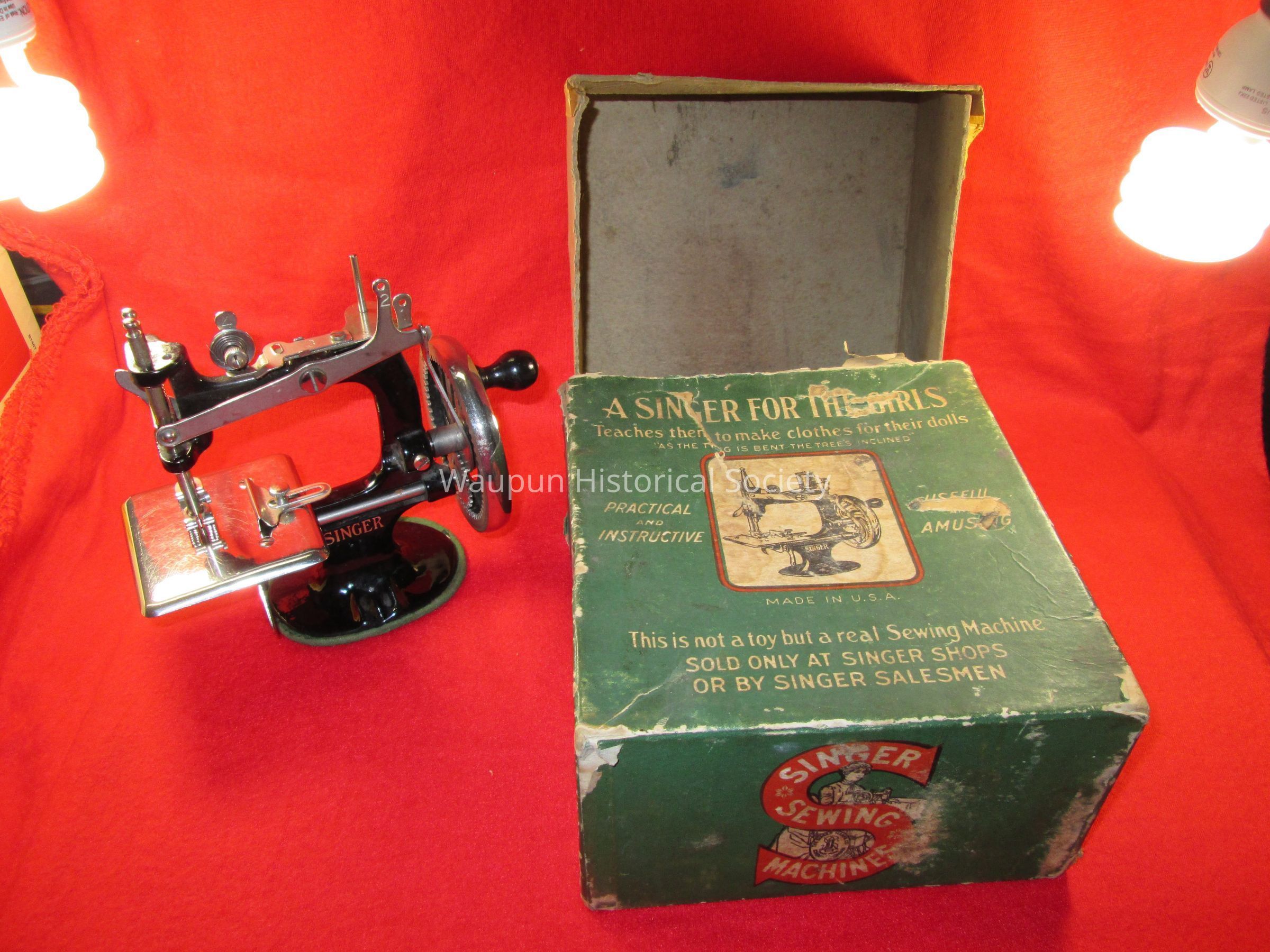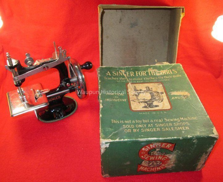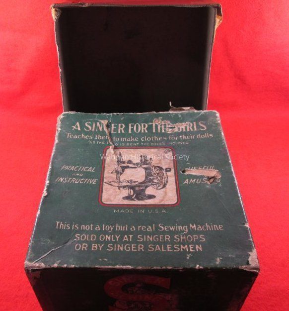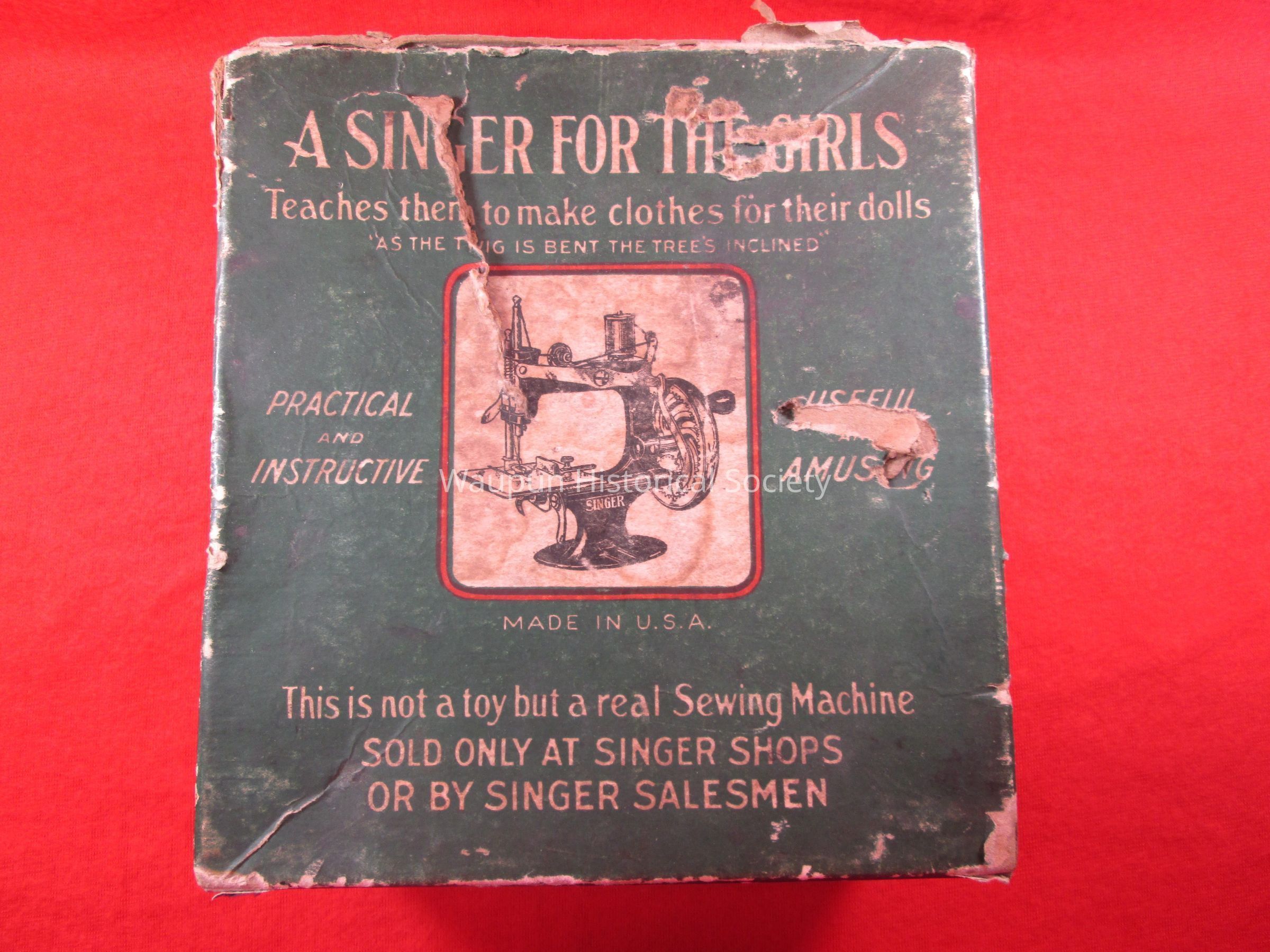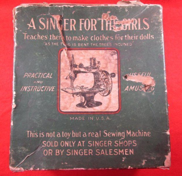 A Singer Sewing Machine w/Box for the girls to teach them how to make clothes for their dolls. This is not a toy but a real Sewing Machine sold only at Singer Shops or by Singer Salesmen. The box is very torn and tattered. It has a green background and lettering is cream color. A picture of a sewing machine is in center of a square with red boarder.