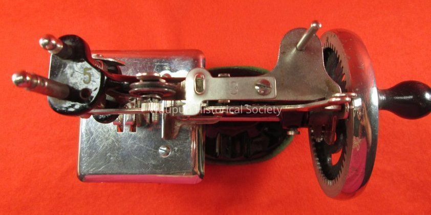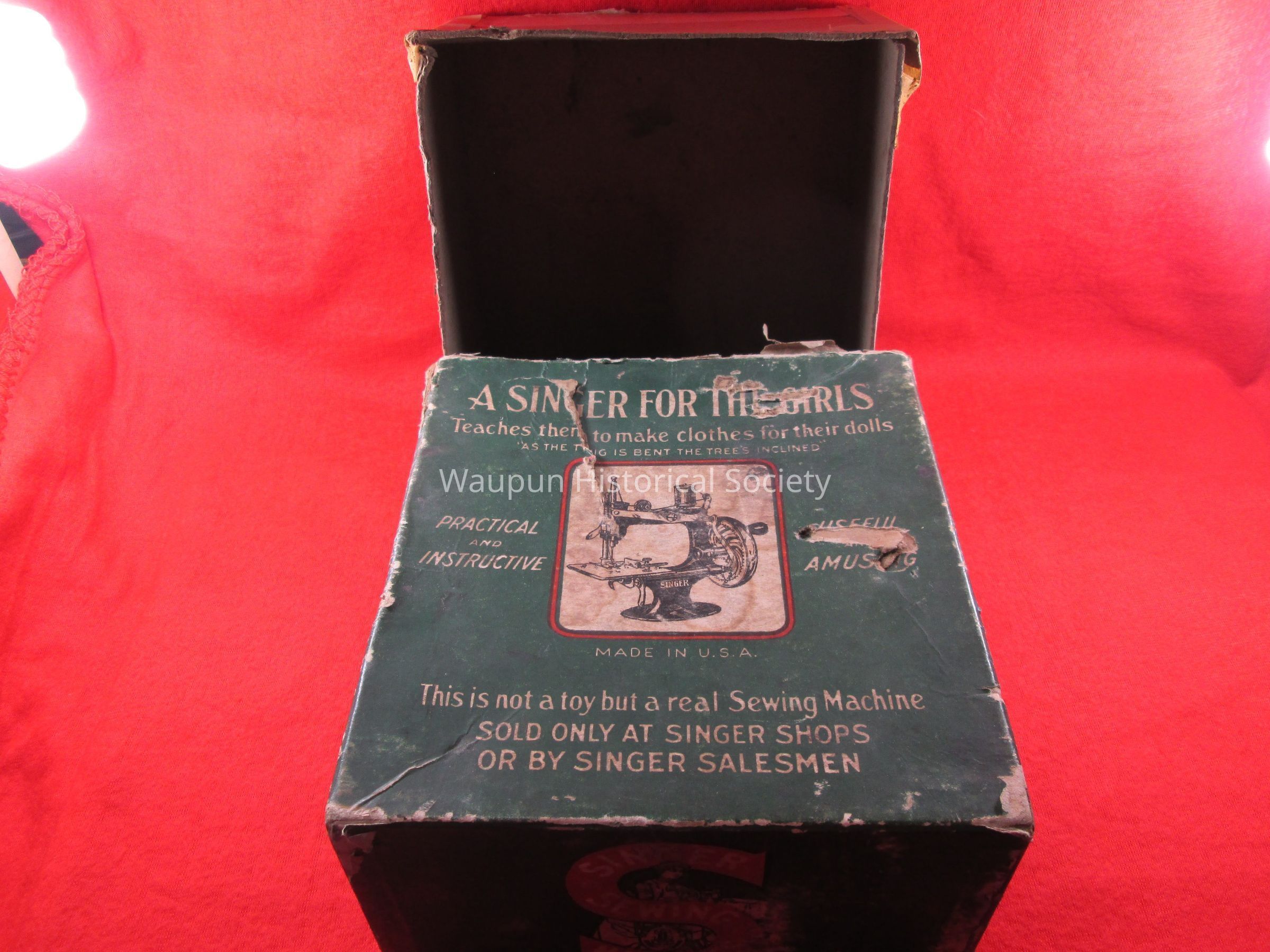 "As The Twig is Bent the Tree's Inclined" is printed on top of box. Practical and Instructive, Useful and Amusing, Made in U. S. A. also typed on top. This is not a toy but a real Sewing Machine Sold Only At Singer Shops or By Singer Salesmen.