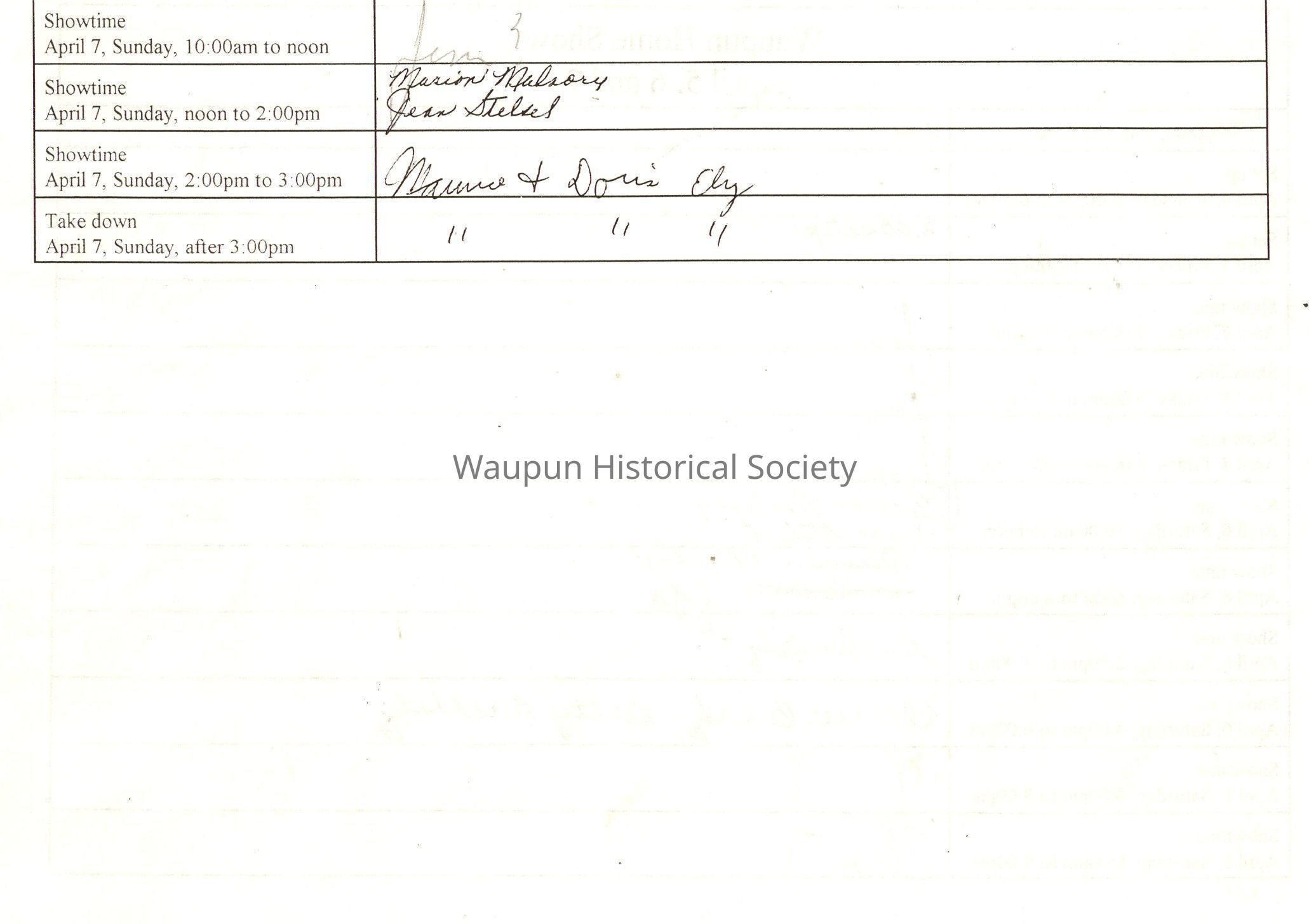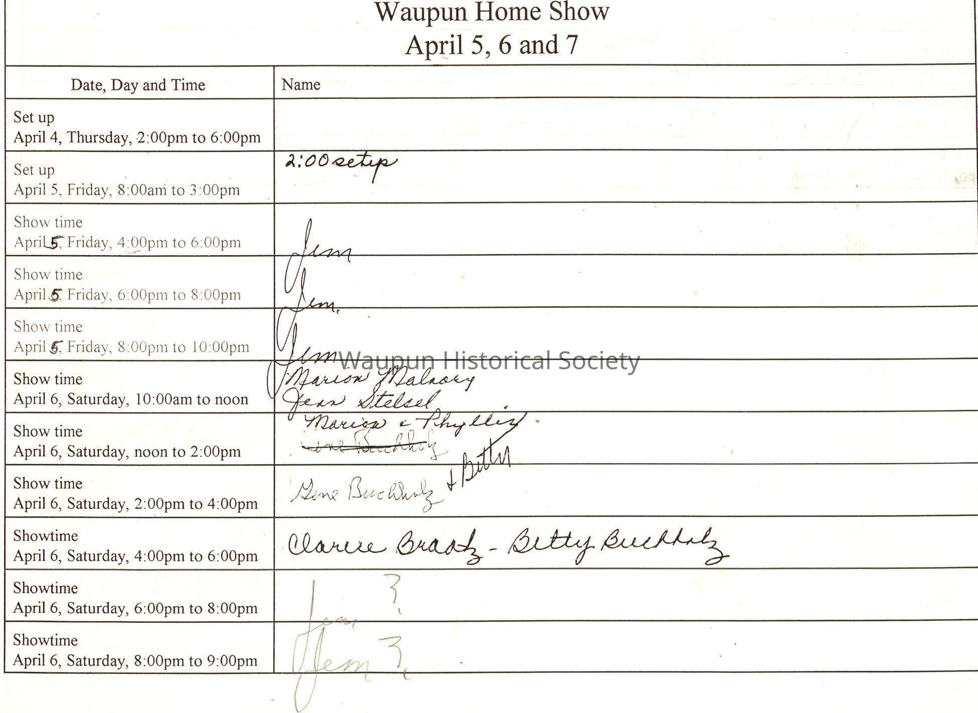 The 26th Annual Waupun Home & Sport Show, Waupun Heritage Museum volunteer work schedule for April 5, 6 & 7, 2002.