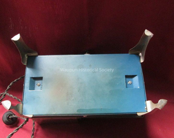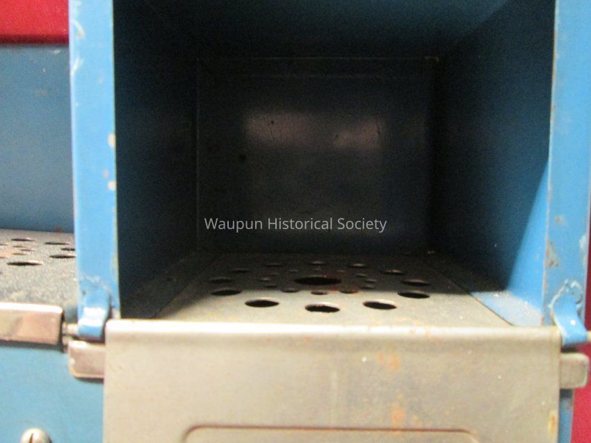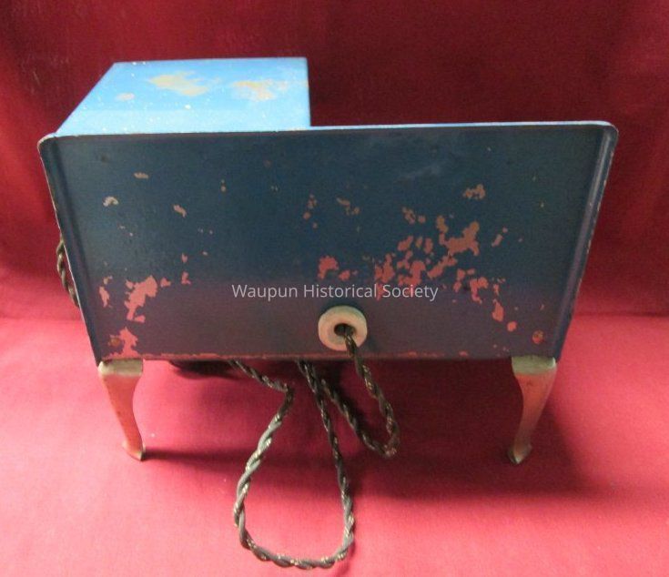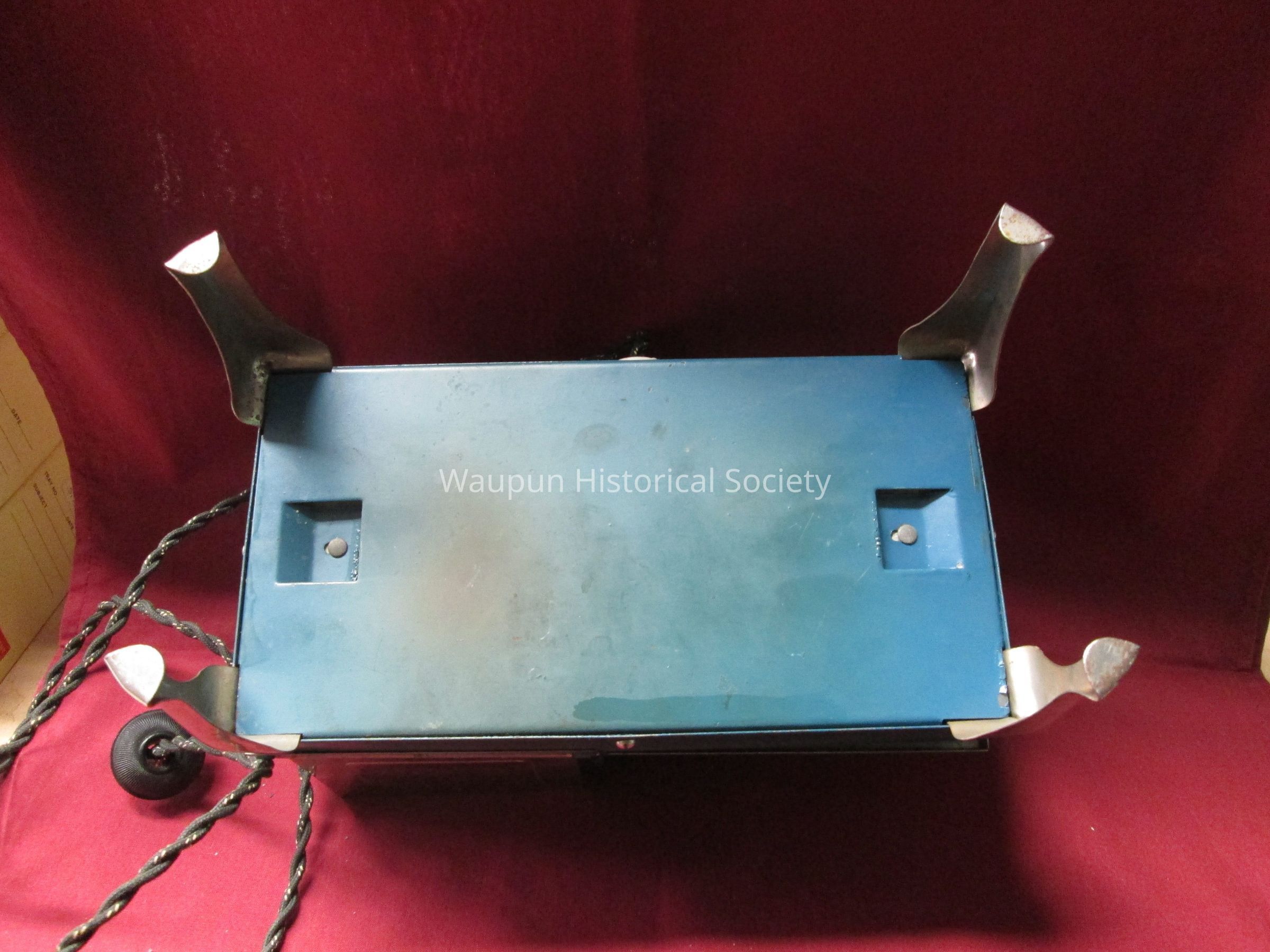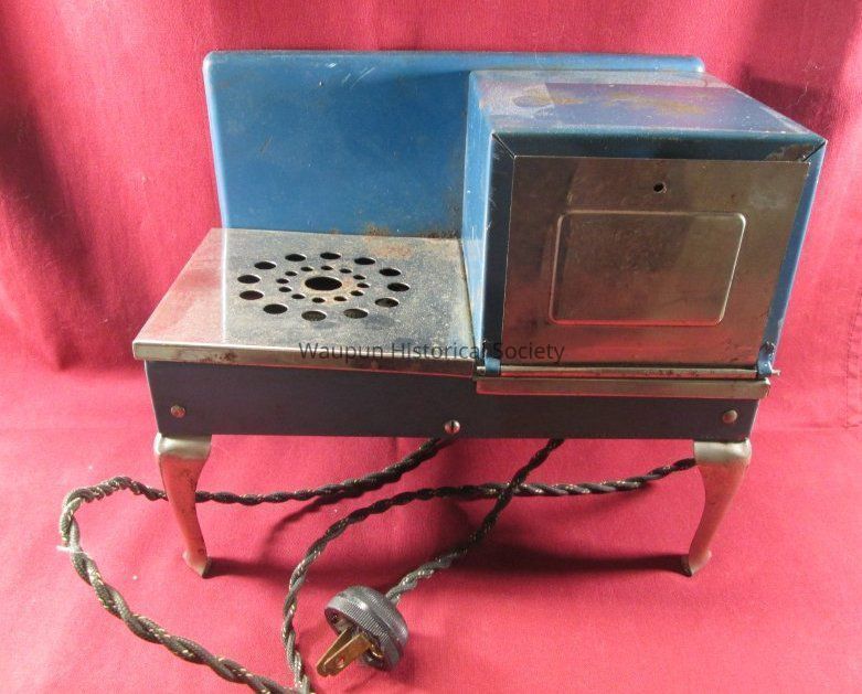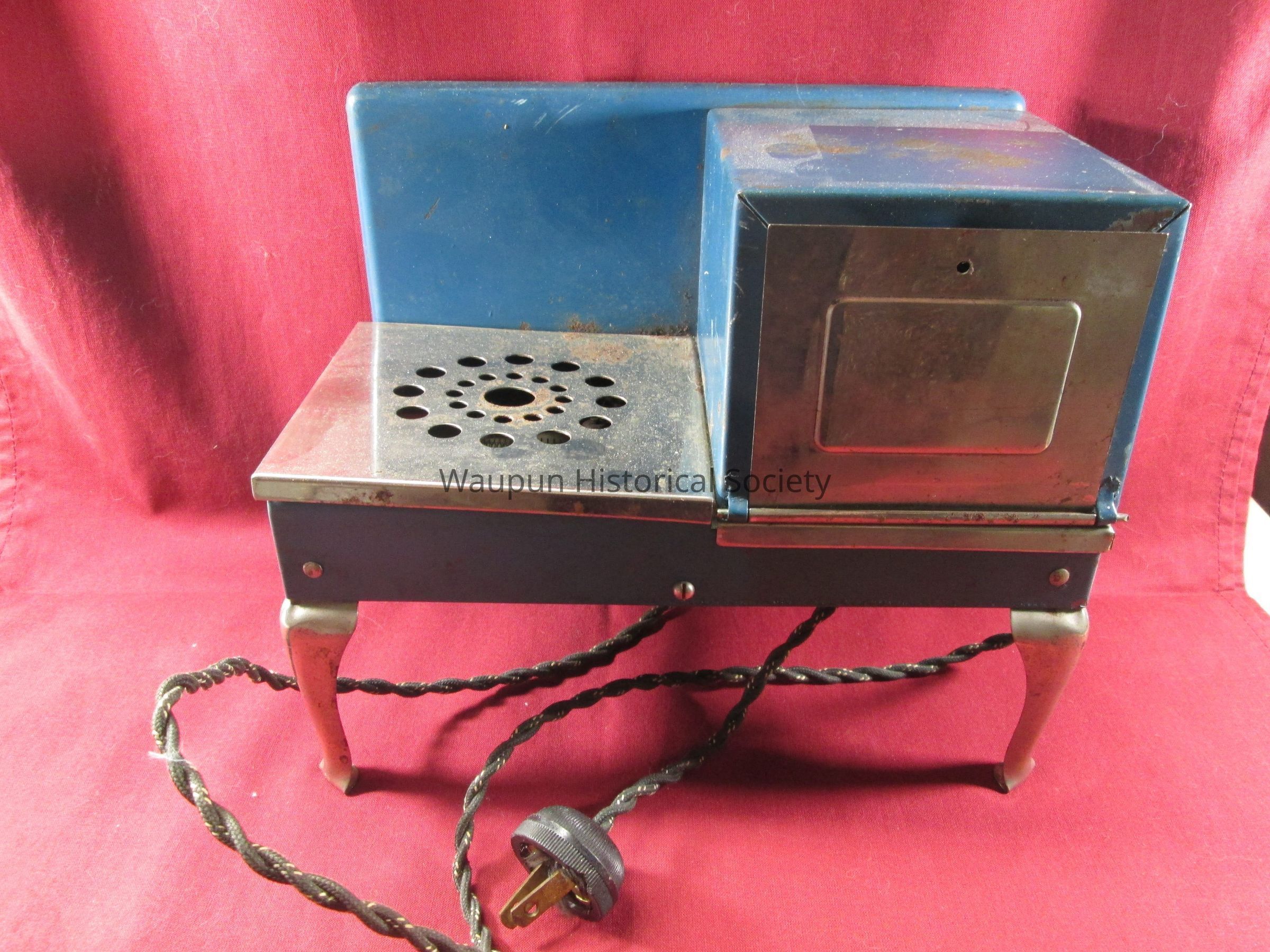Electric hot plate with two hot plates. It looks like a miniature stove. It is blue in color and has 4 legs, a hot plate with a door and a cord to plug it in.