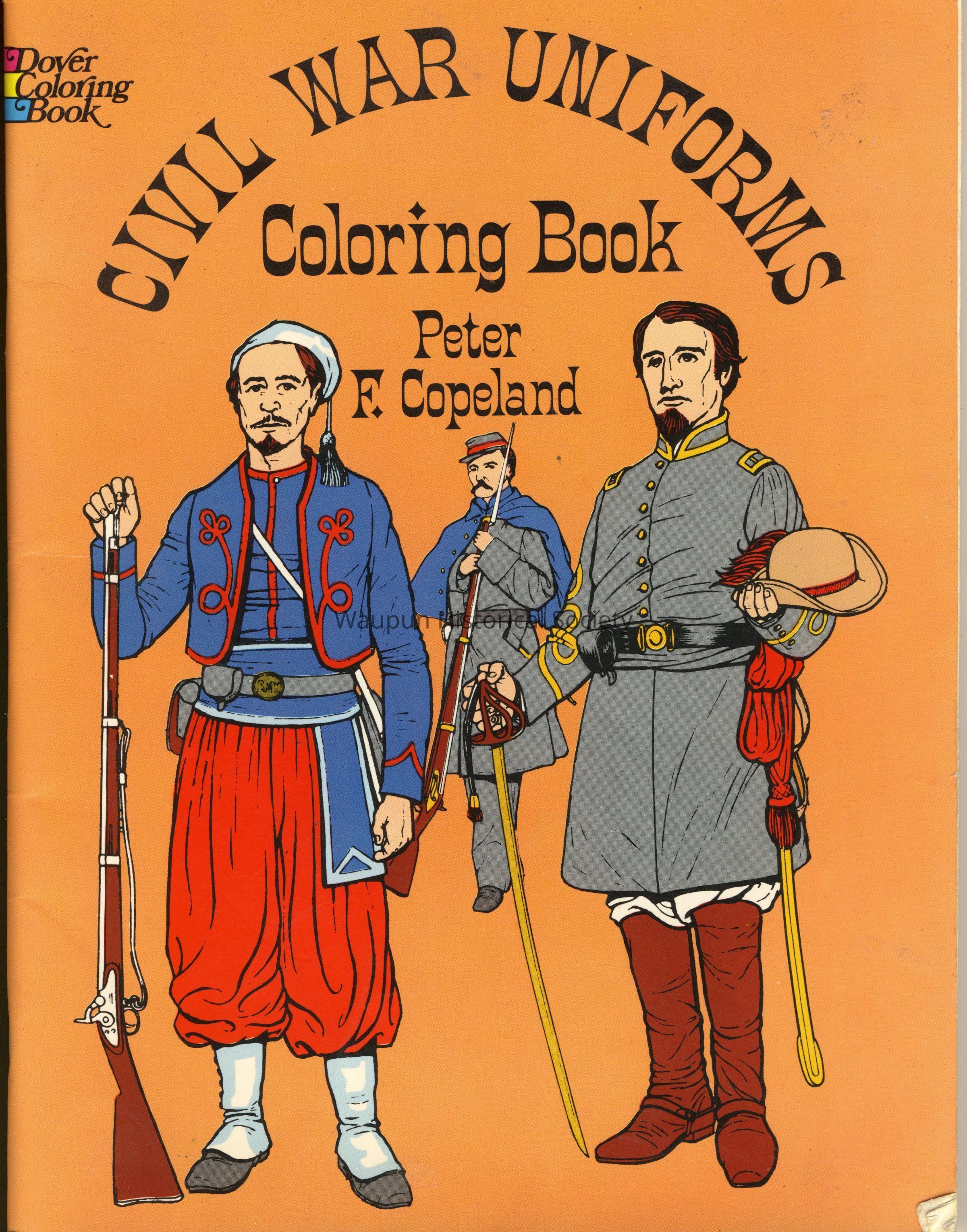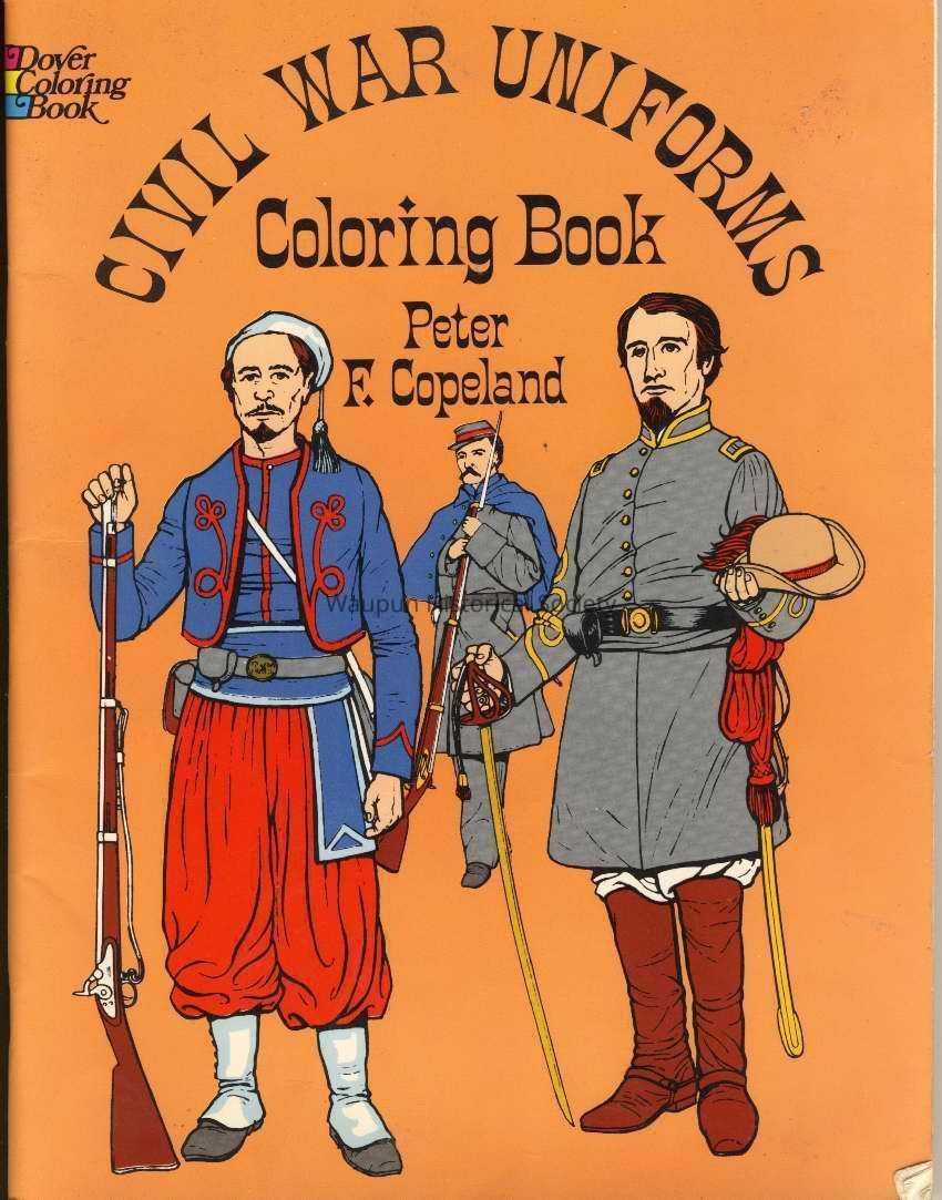 Civil War Coloring Book. This book is designed as a coloring book for children, however, on both the front and back covers, both inside and out, it shows the uniforms in full color. It's a good example of the many different uniforms used during the war.