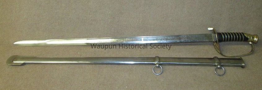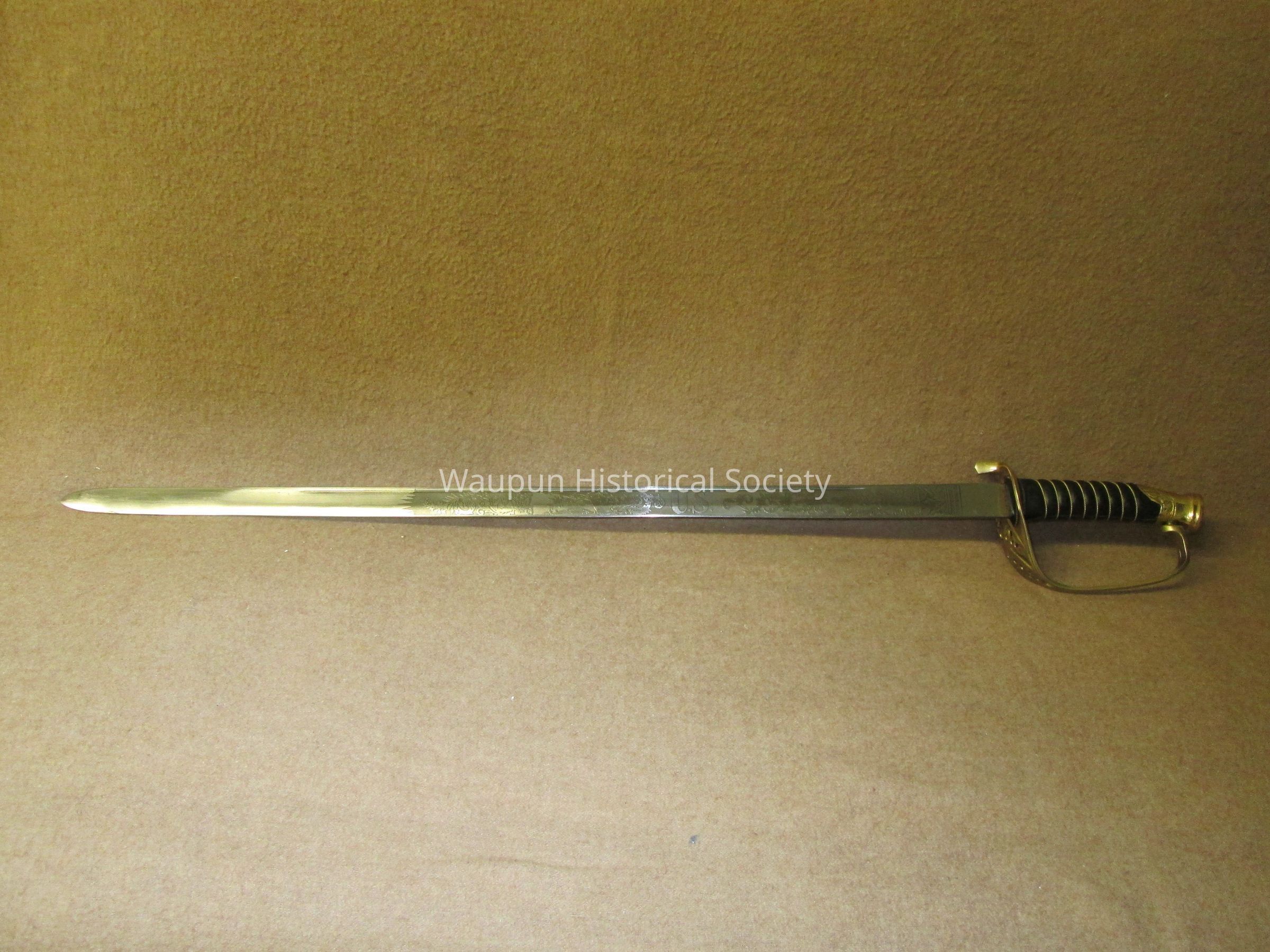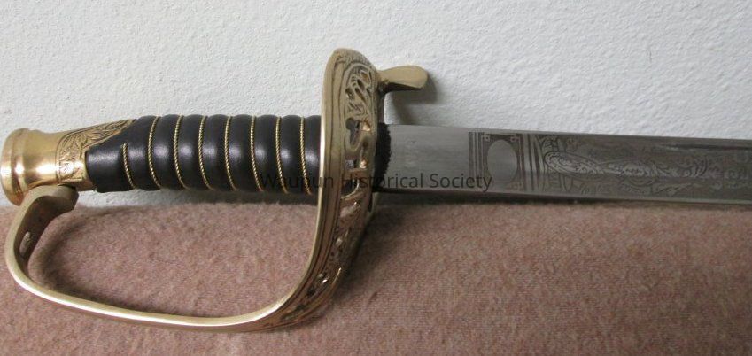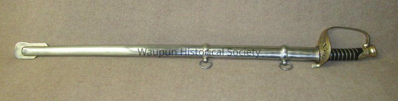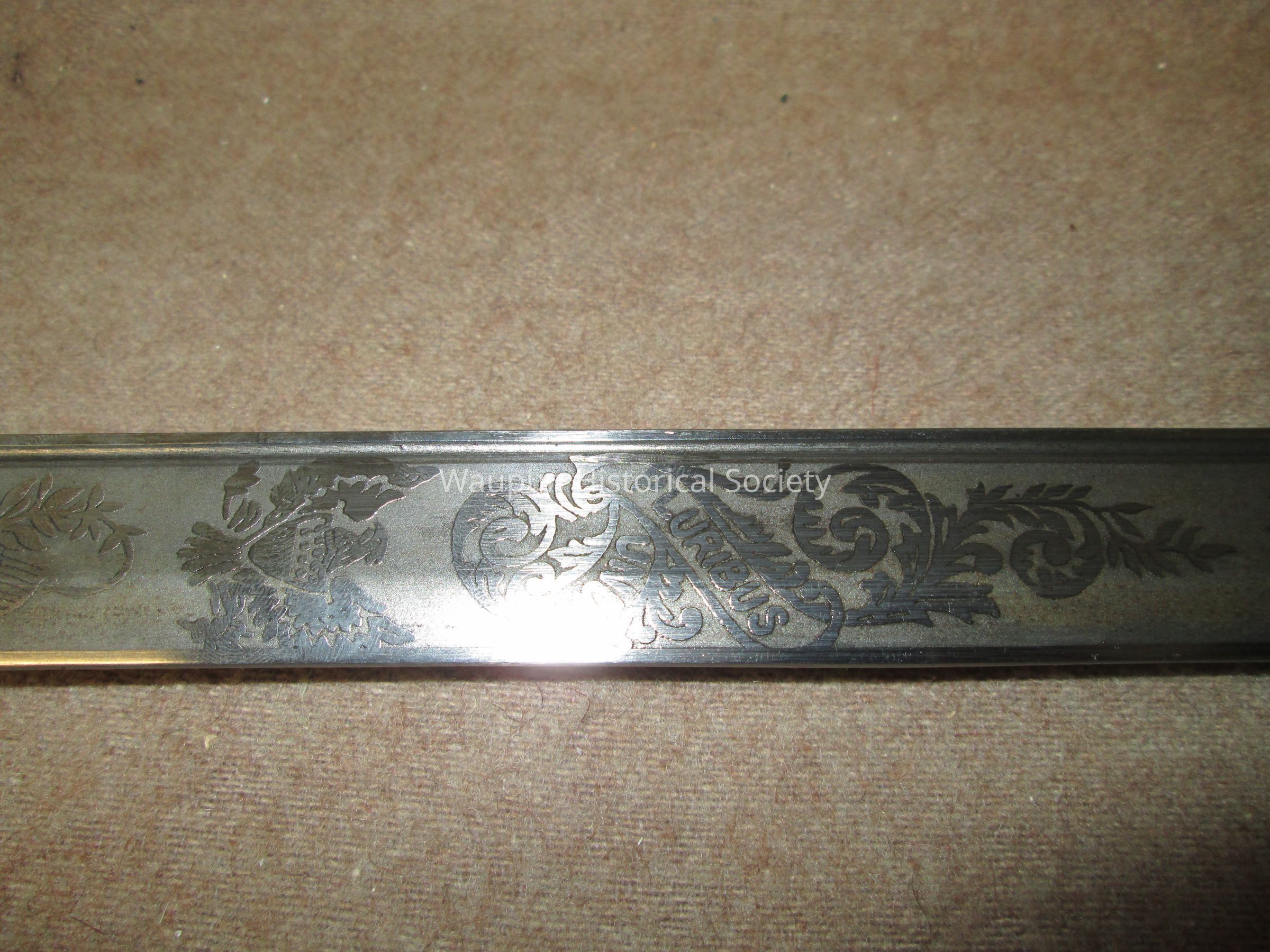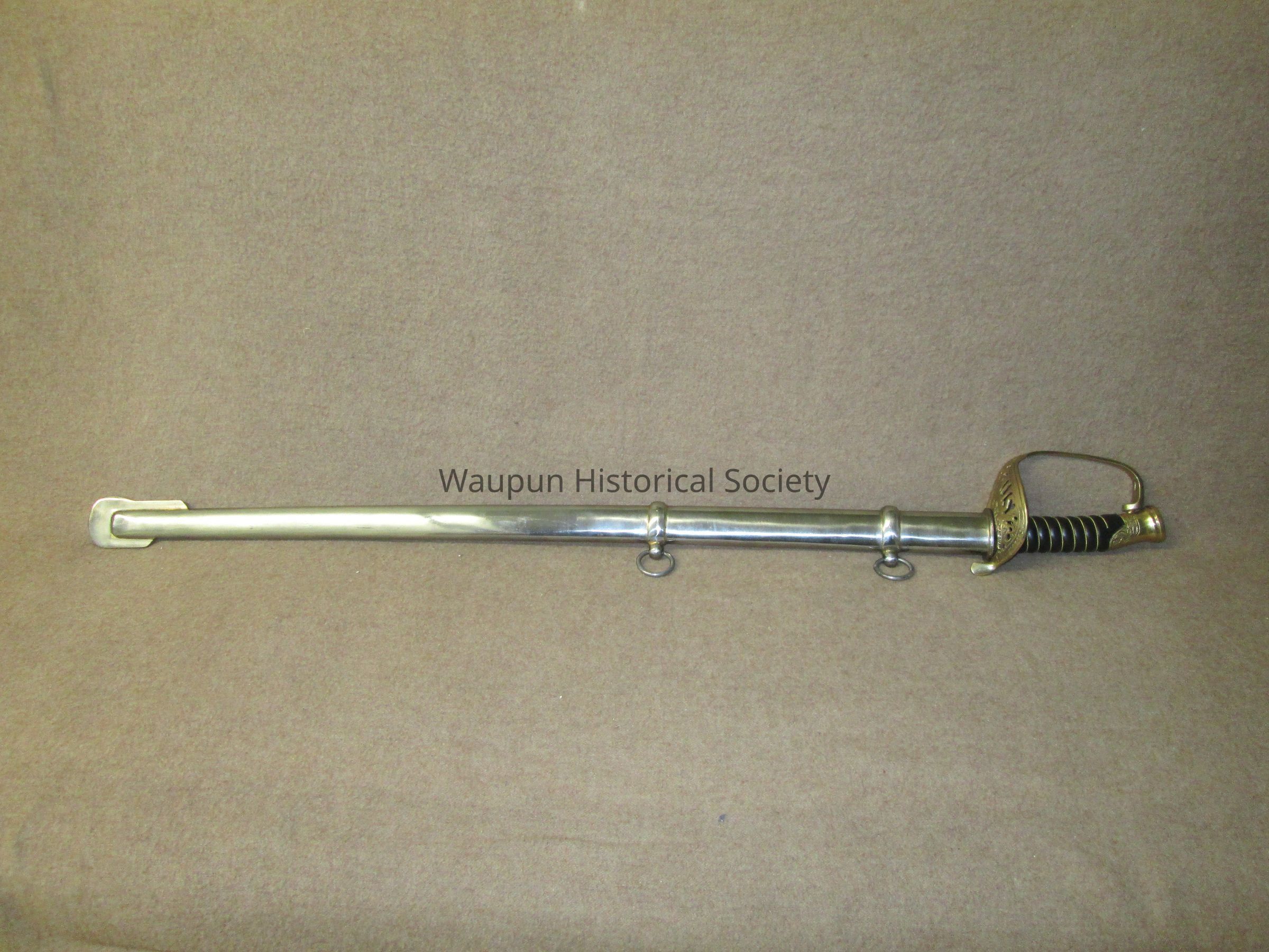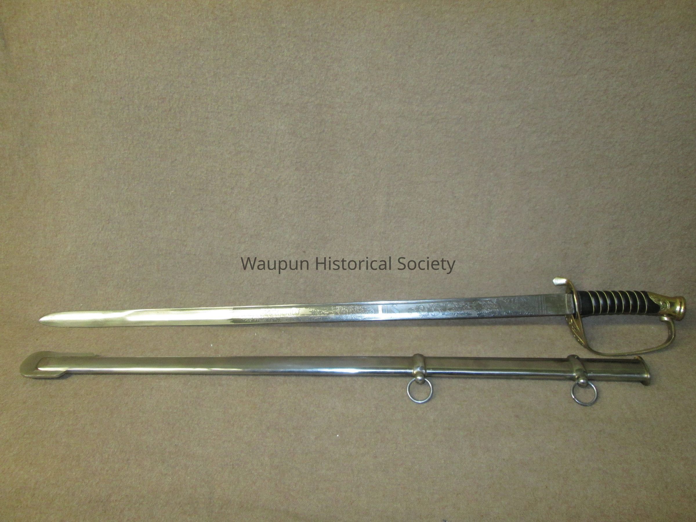 Reproduction of Civil War sword and metal scabbard. The shaft of the sword is engraved with the word Pluribus and US and other ornate decorations. This was given on loan due to the fact that original Civil War sword as stolen when the musuem was robbed several years ago.Acquisition