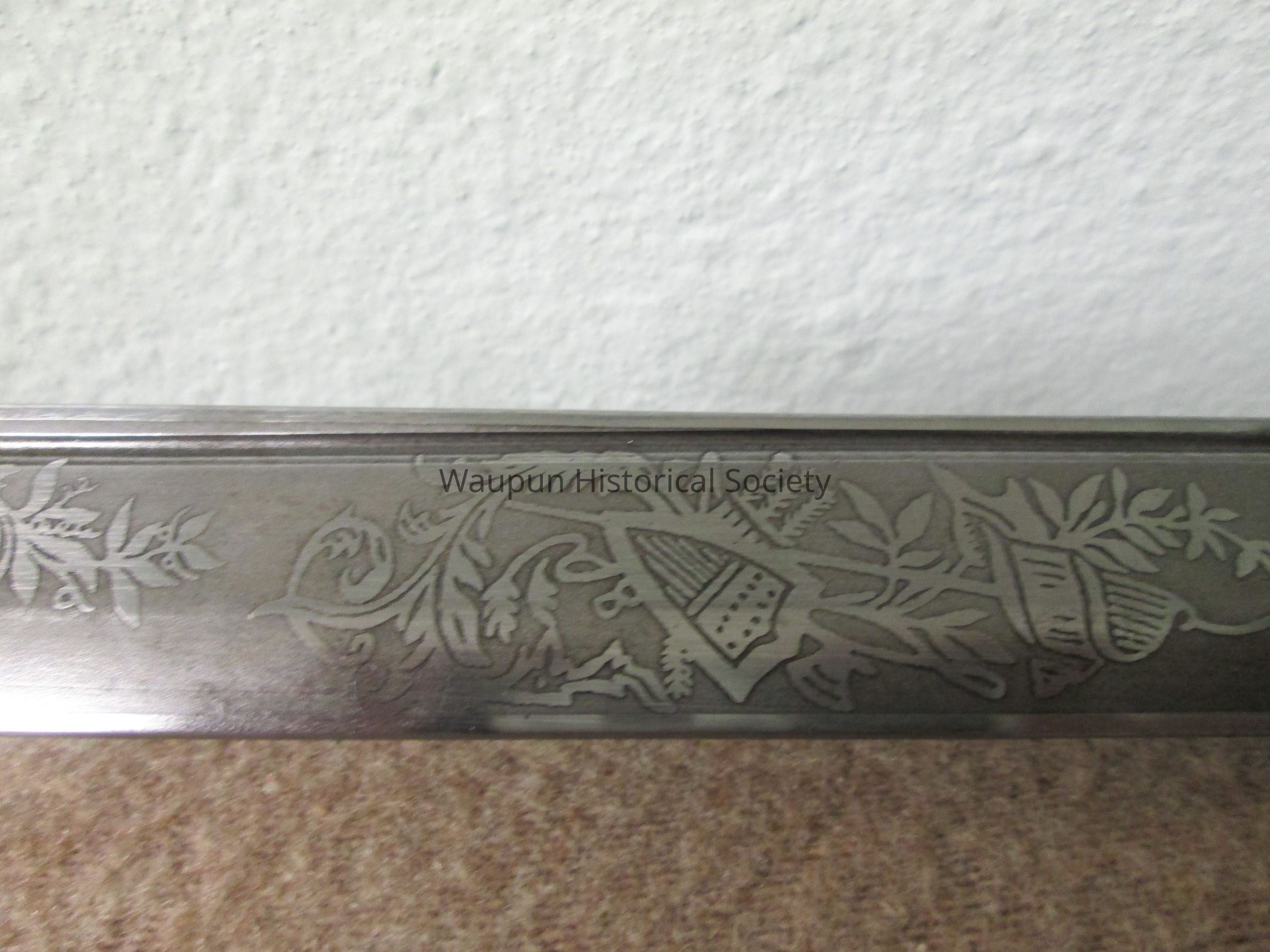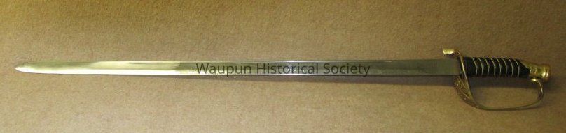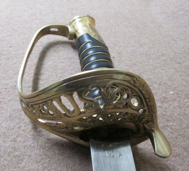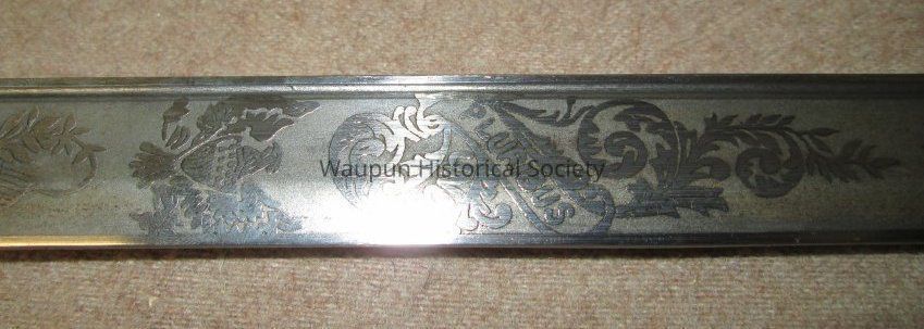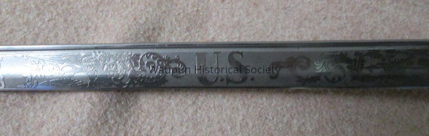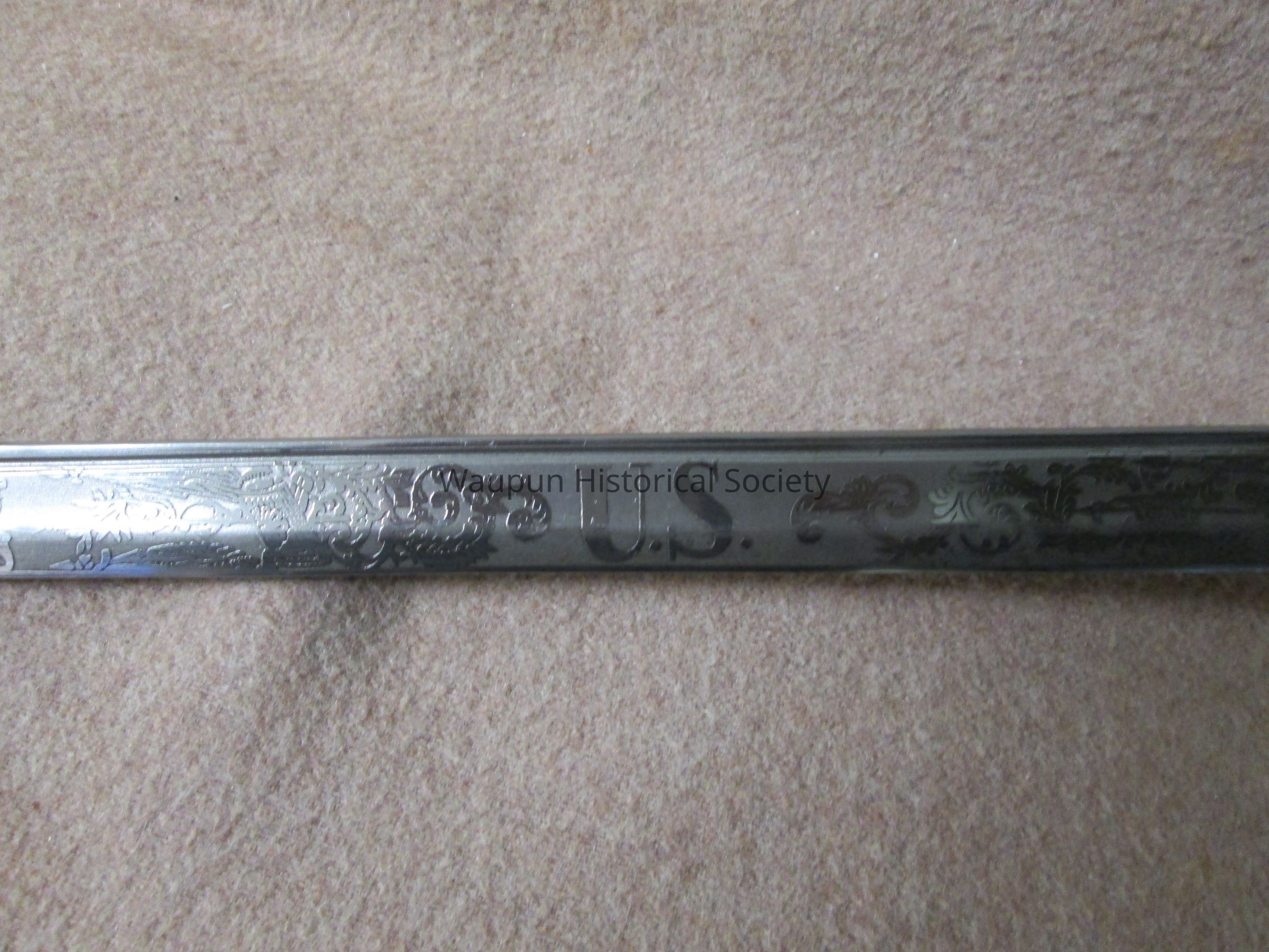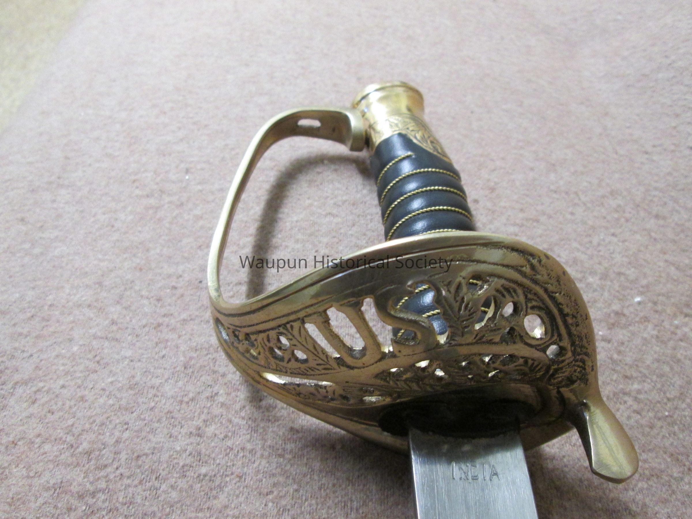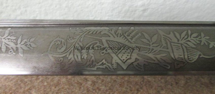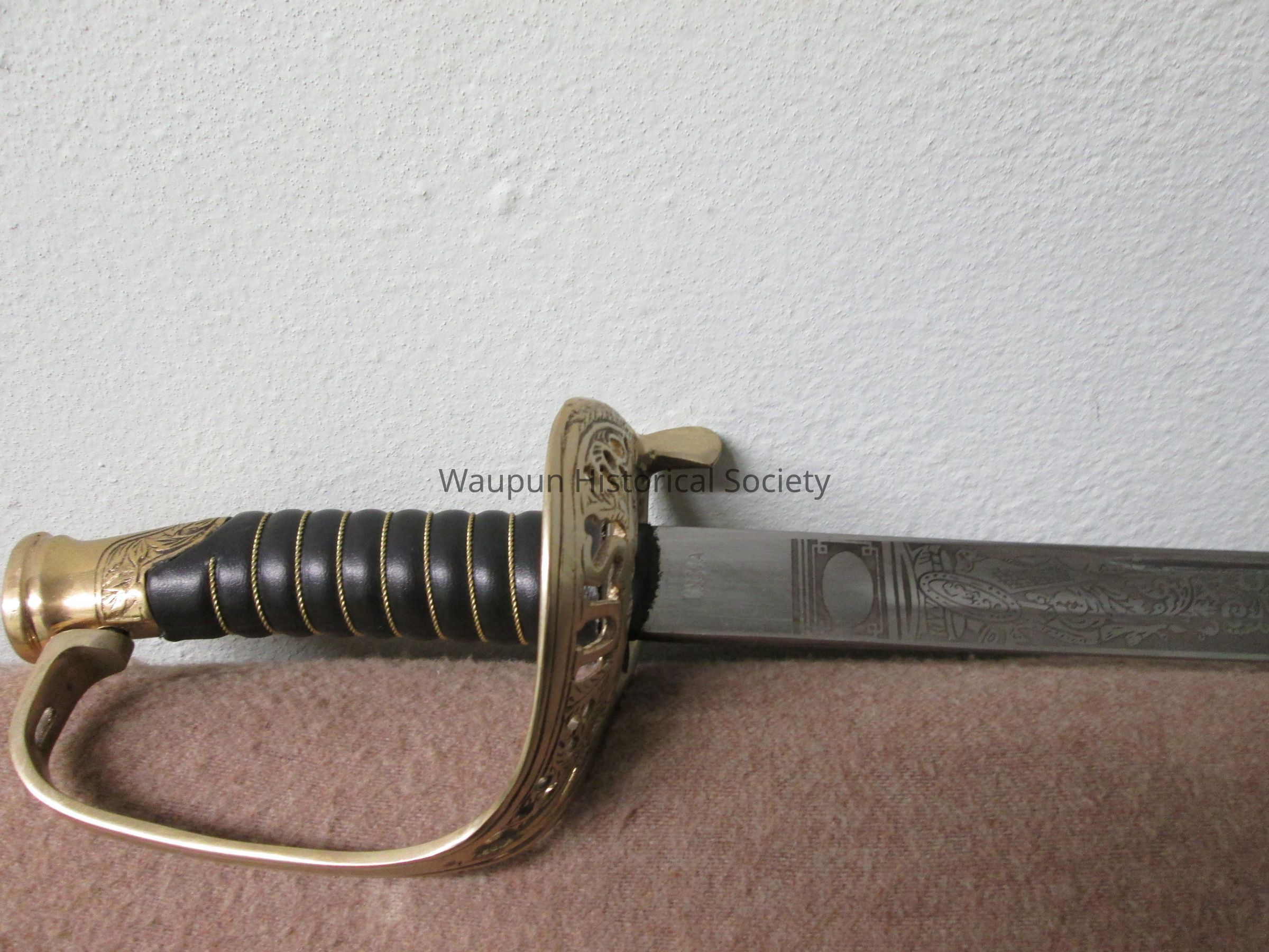 Reproduction of Civil War sword and metal scabbard. The shaft of the sword is engraved with the word Pluribus and US and other ornate decorations. This was given on loan due to the fact that original Civil War sword as stolen when the musuem was robbed several years ago.Acquisition