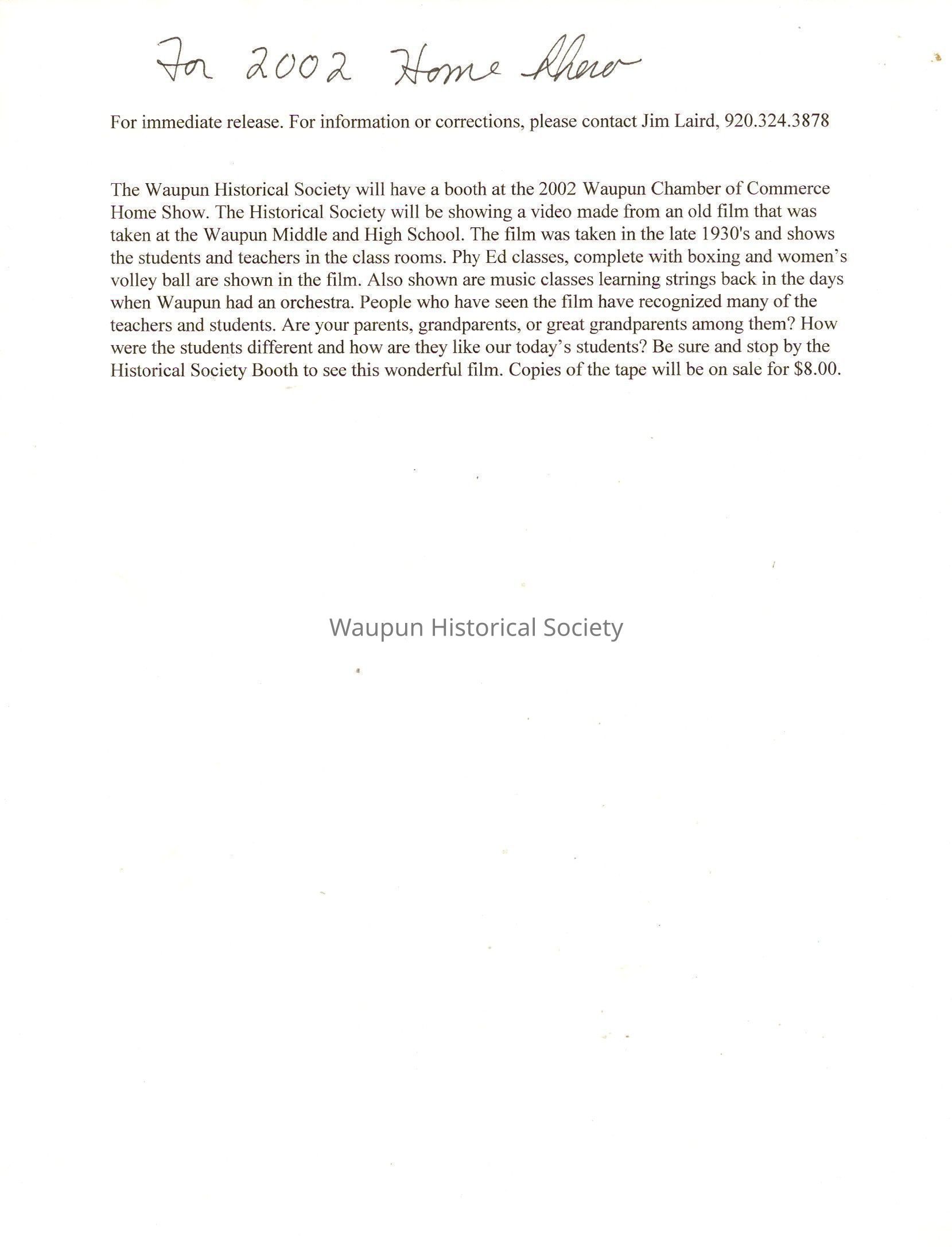The Waupun Historical Society will have a booth at the 2002 Waupun Chamber of Commerce Home Show. The Historical Society will he showing a video made from an old film that was taken at the Waupun Middle and High School. The film was taken in the late 1930's and shows the students and teachers in the class rooms. Phy Ed classes, complete with boxing and women's volley ball are shown in the film. Also shown are music classes learning strings back in the days when Waupun had an orchestra. People who have seen the film have recognized many of the teachers and students. Are your parents, grandparents, or great grandparents among them? How were the students different and how are they like our today's students? Be sure and stop by the Historical Society Booth to see this wonderful film. Copies of the tape will be on sale for $8.00.Acquisition