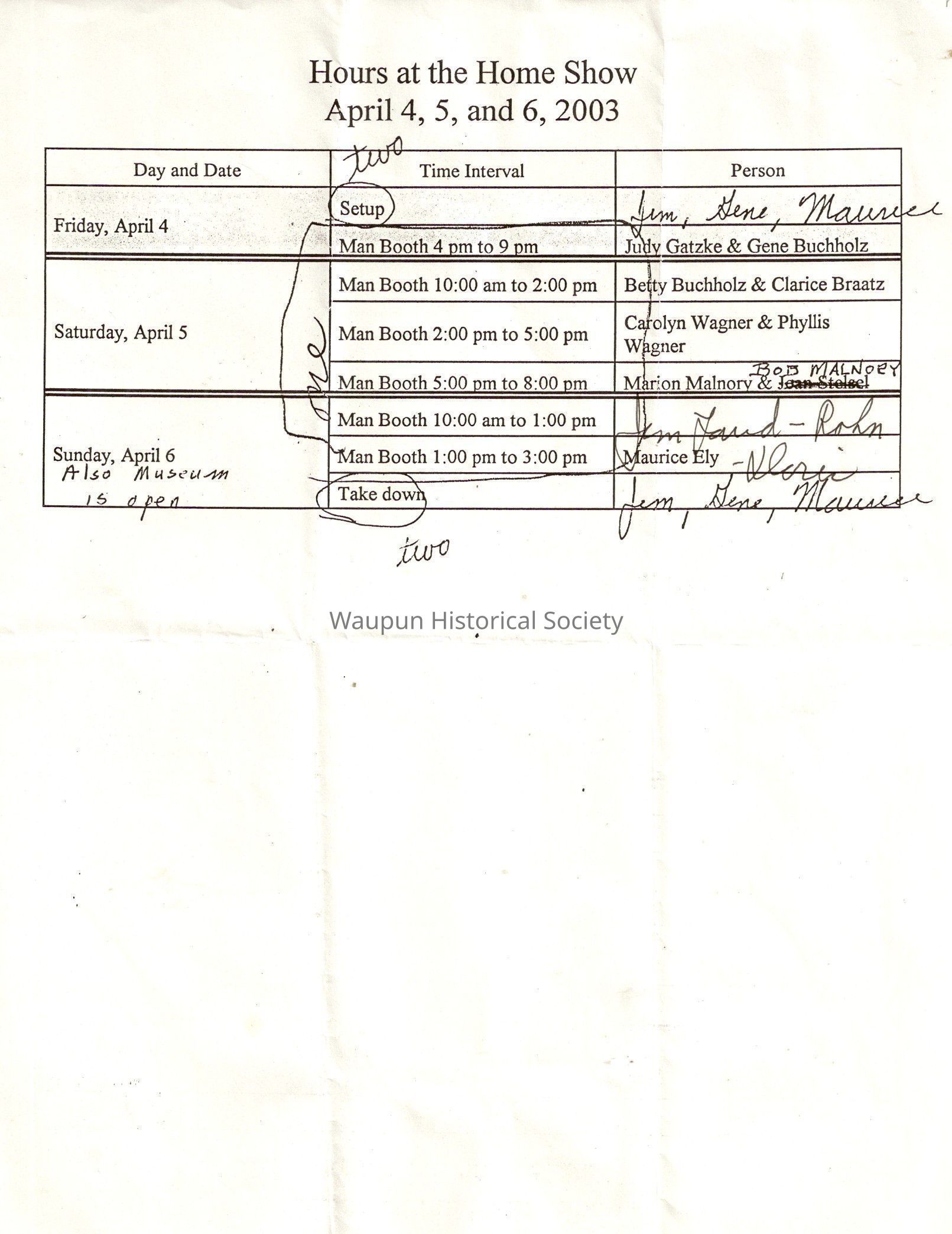 27th Annual Home and Sport Show Volunteer schedule.Entry/Object ID