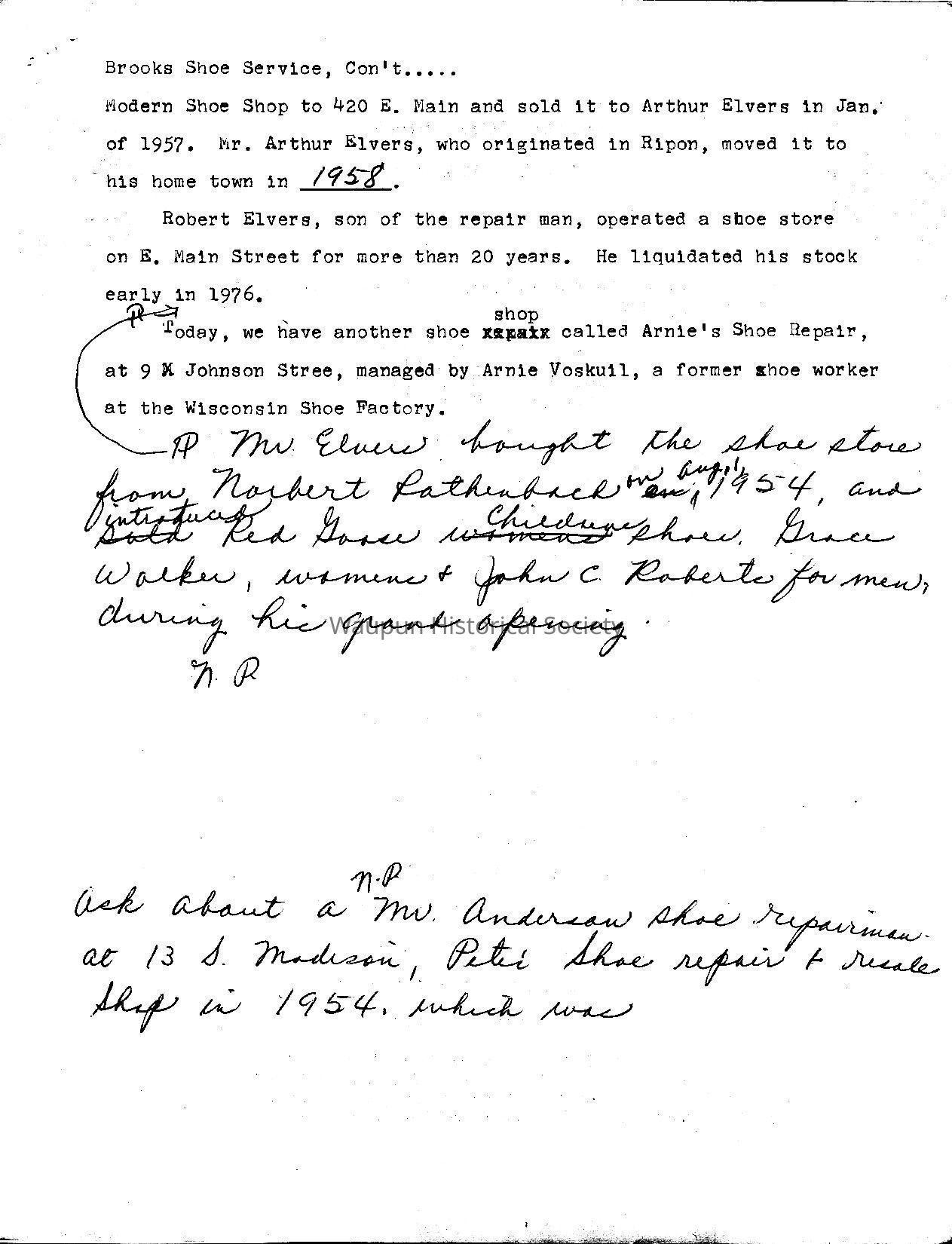 Art Salem had a shop on E. Main Street in the 1930's on the corner of Main and Carrington in the old theater building. He sold out to William Allan, Several years later in 1956, Mr. Allan moved the Modern Shoe Shop to 420 E. Main and sold it to Arthur Elvers in Jan. of 1957. Mr. Arthur Elvers, who originated in Ripon, moved it to his home town in 1958.