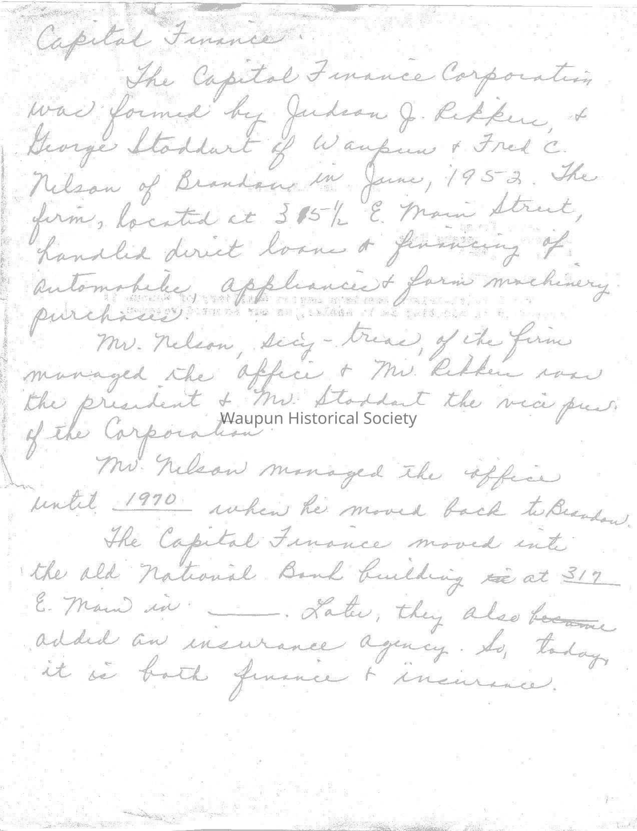 The Capital Finance Corporation was formed by Judson J. Rikkers & George Stoddart of Waupun & Fred C. Nelson of Brandon in June, 1952. The firm, located at 315 1/2 E. Main Street, handled direct loans & financing of automobiles, appliances & farm machinery purchases.