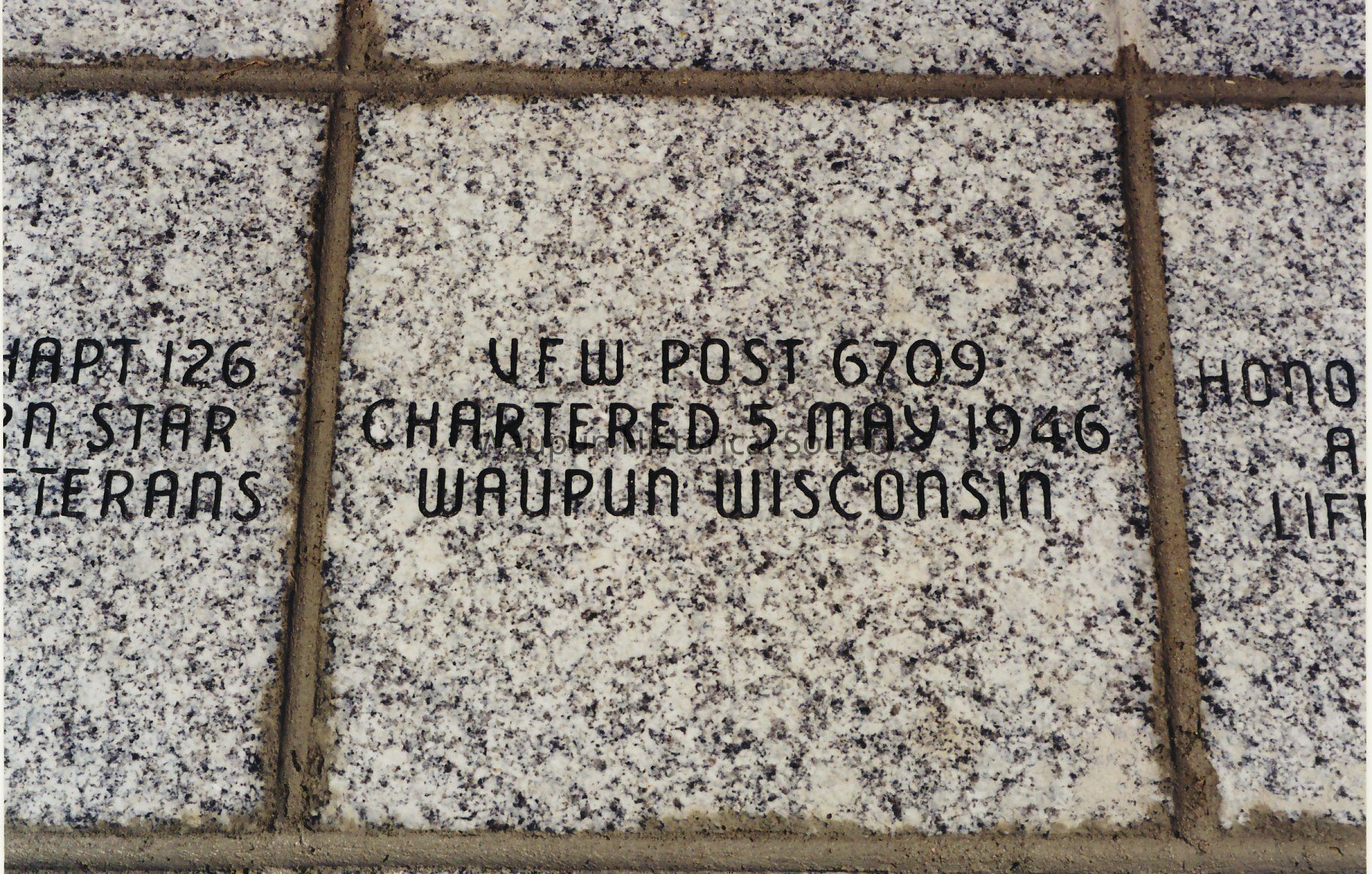 VFW Monument. Reads: V.F.W. Post 6709 Chartered 5 May 1946 Waupun, WisconsinAcquisition