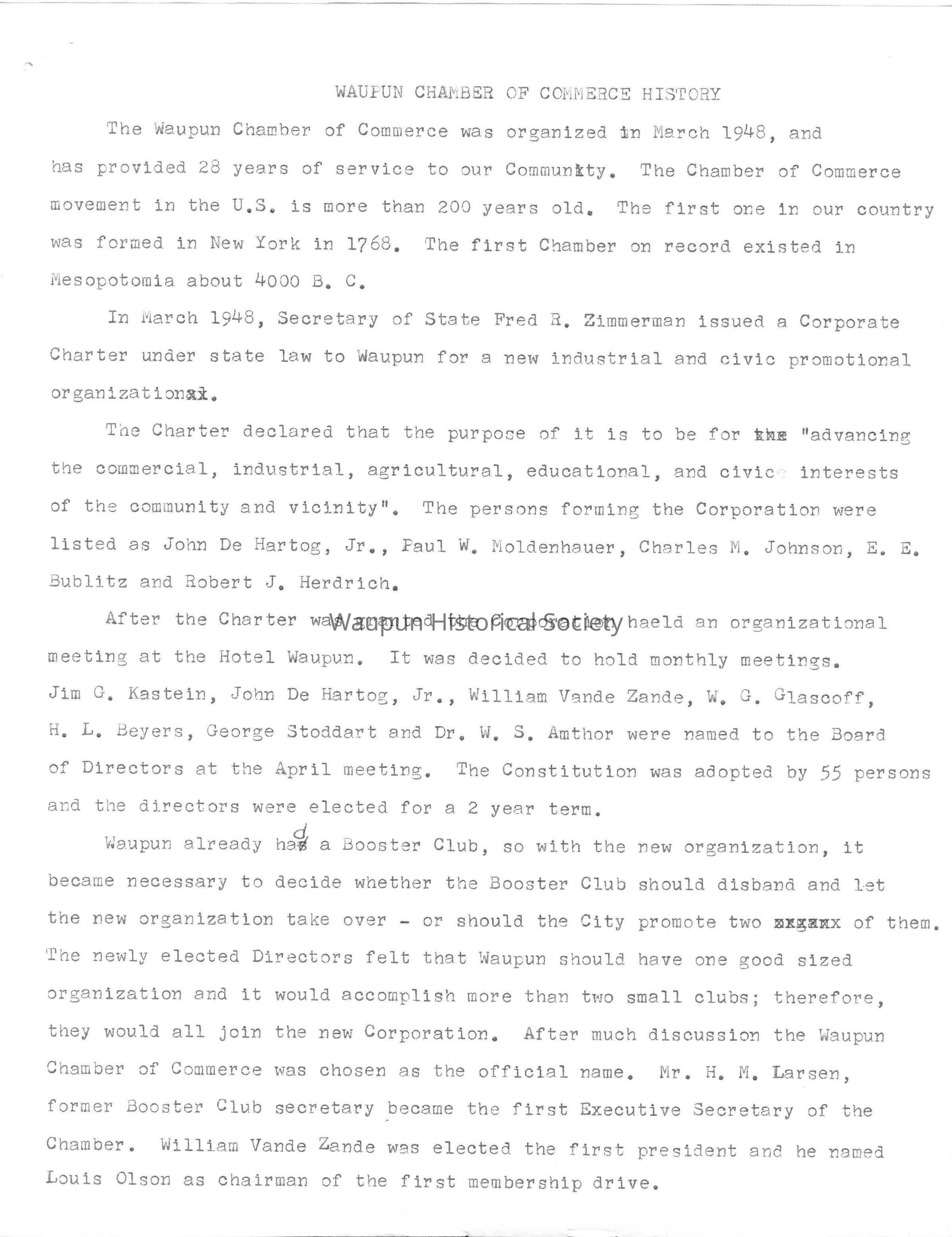 Historical information on Waupun Chamber of Commerce for 1976 Bicentennial Celebration in Waupun, WI