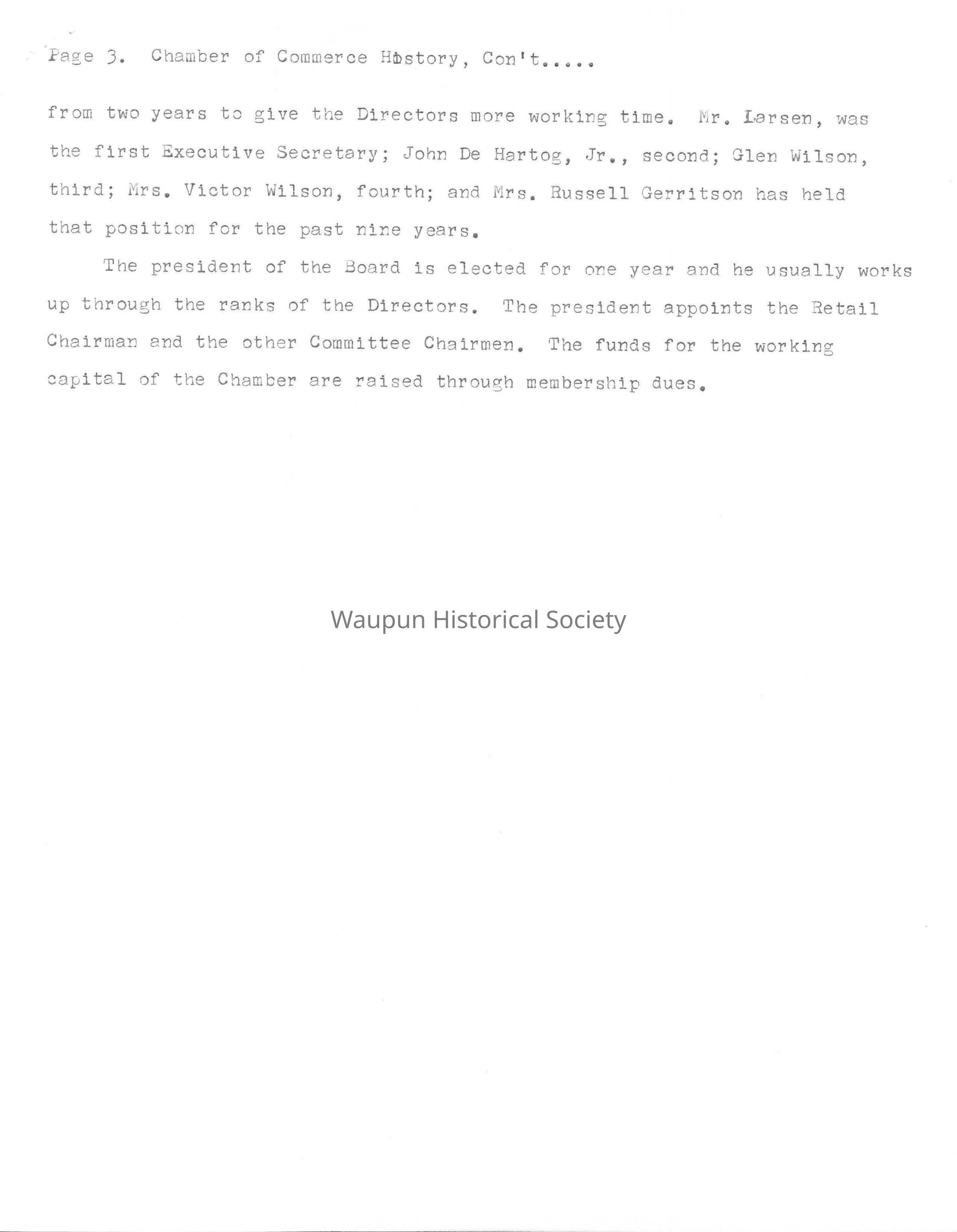Waupun already had a Booster Club, so with the new organization, it became necessary to decide whether the Booster Club should disband and let the new organization take over - or should the City promote two of them. The newly elected Directors felt that Waupun should have one good sized organization and it would accomplish more than two small clubs; therefore, they would all join the new Corporation. After much discussion the Waupun Chamber of Commerce was chosen as the official name. Mr. H. M. Larsen, former Booster Club secretary became the first Executive Secretary of the Chamber. William Vande Zande was elected the first president and he named Louis Olson as chairman of the first membership drive.