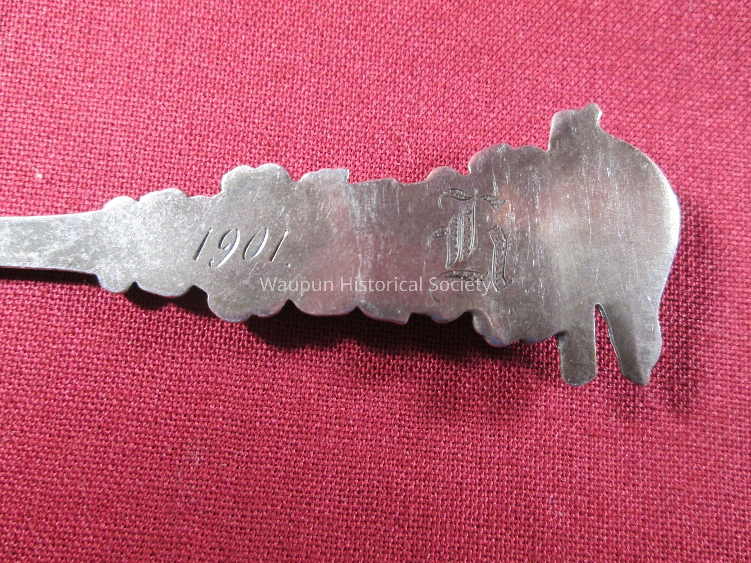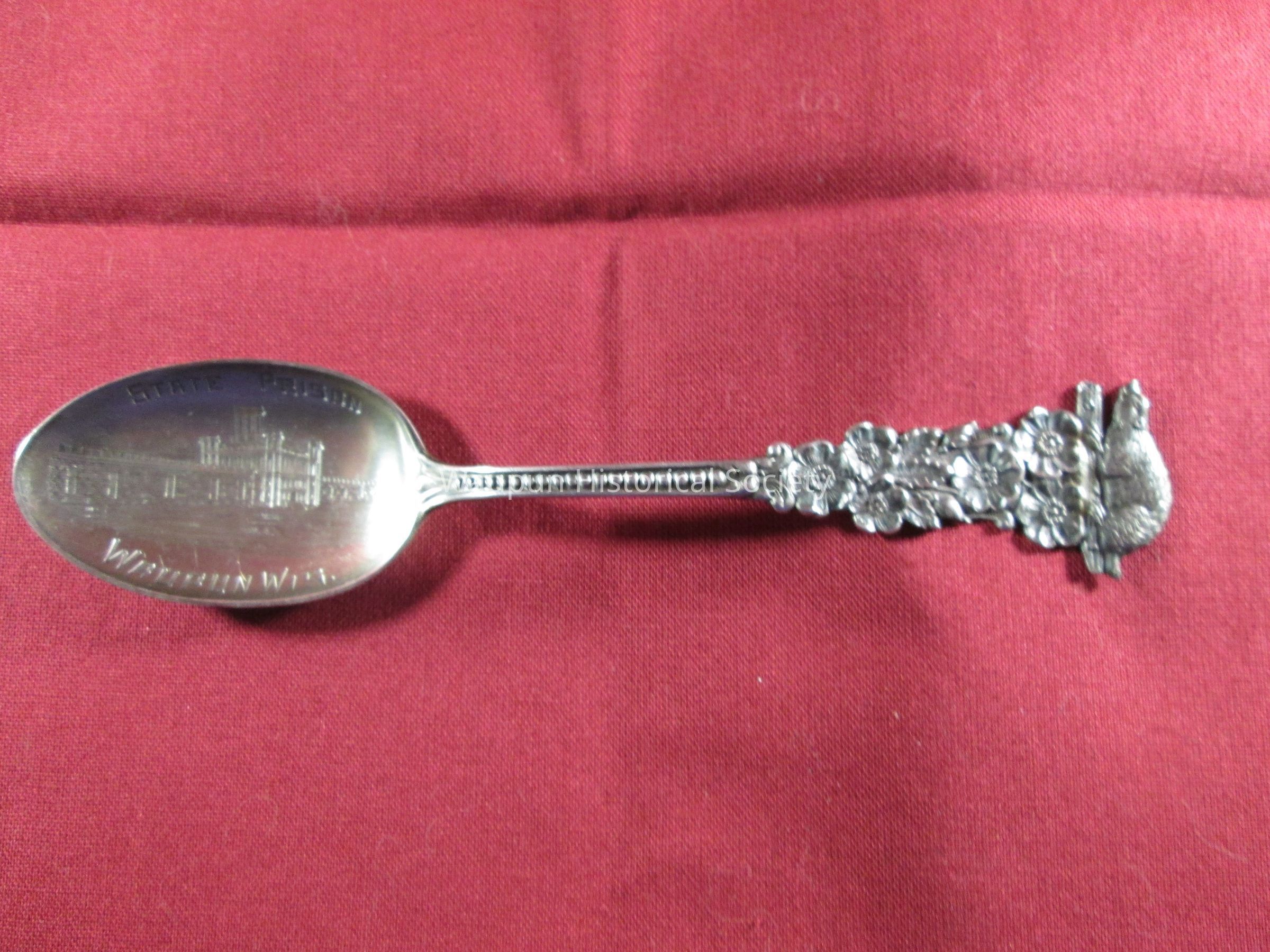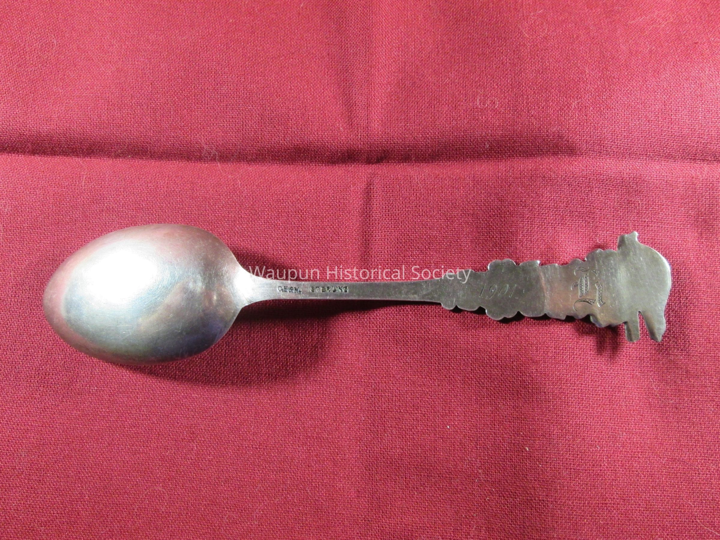 Spoon from collection. Sterling silver/gold wash with decorative handle. Engraved in the bowl of the spoon is a picture of the State Prison with the words "State Prison" and "Waupun Wis." The image of the prison is different from the previous spoon.The handle has a floral pattern with an image of a badger.The back side of the spoon has the word "sterling", the year 1901 and the letter "G" engraved on the handle.Acquisition