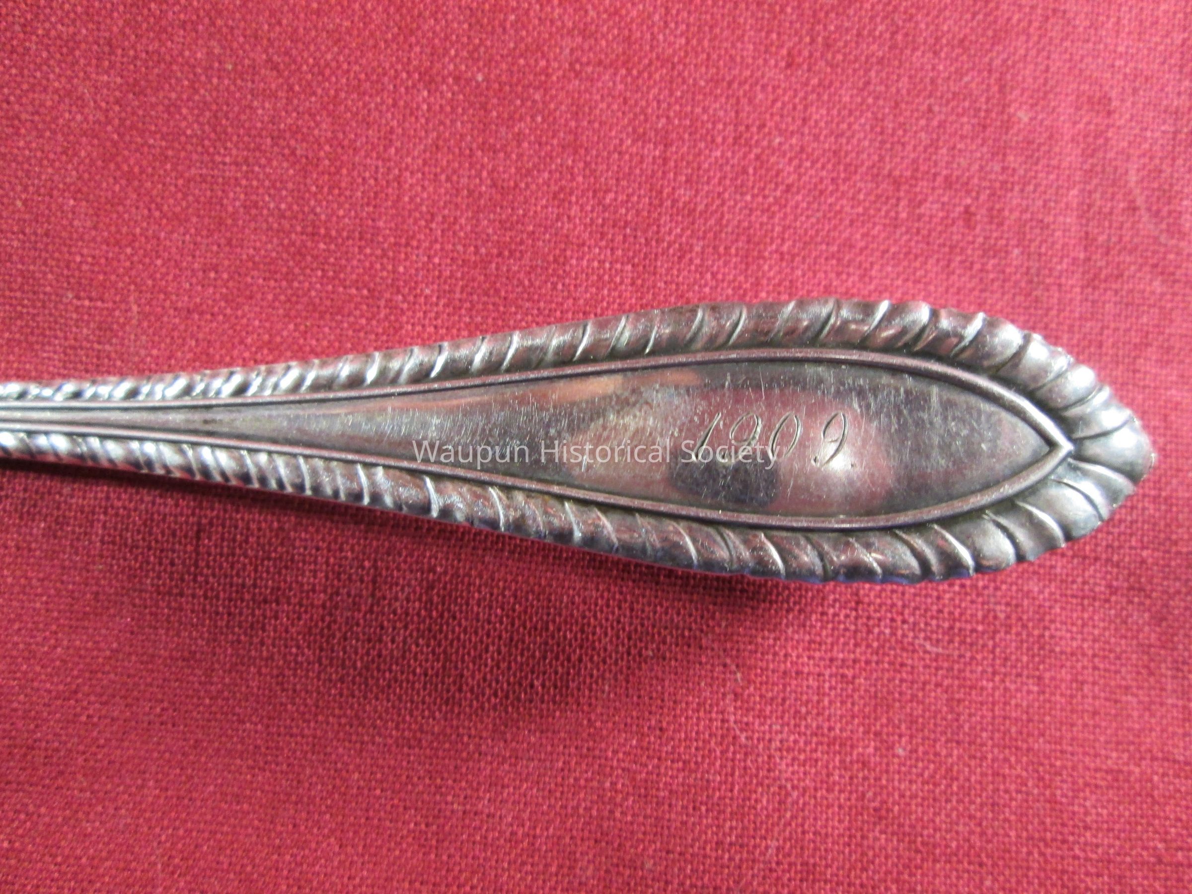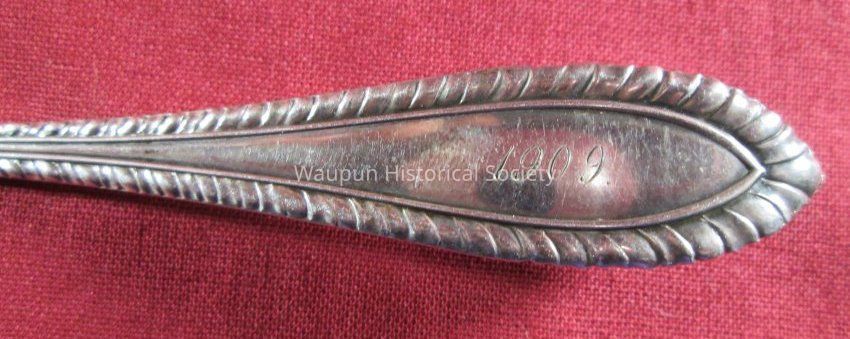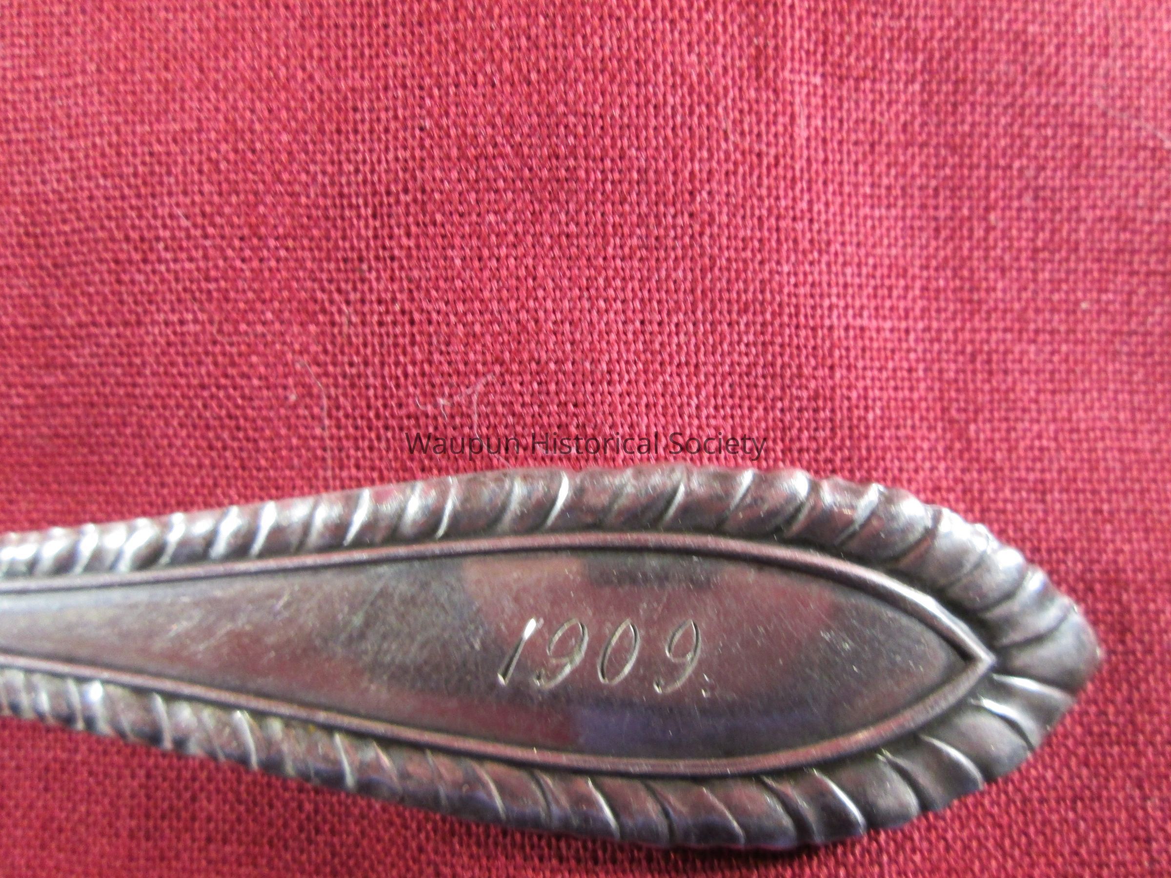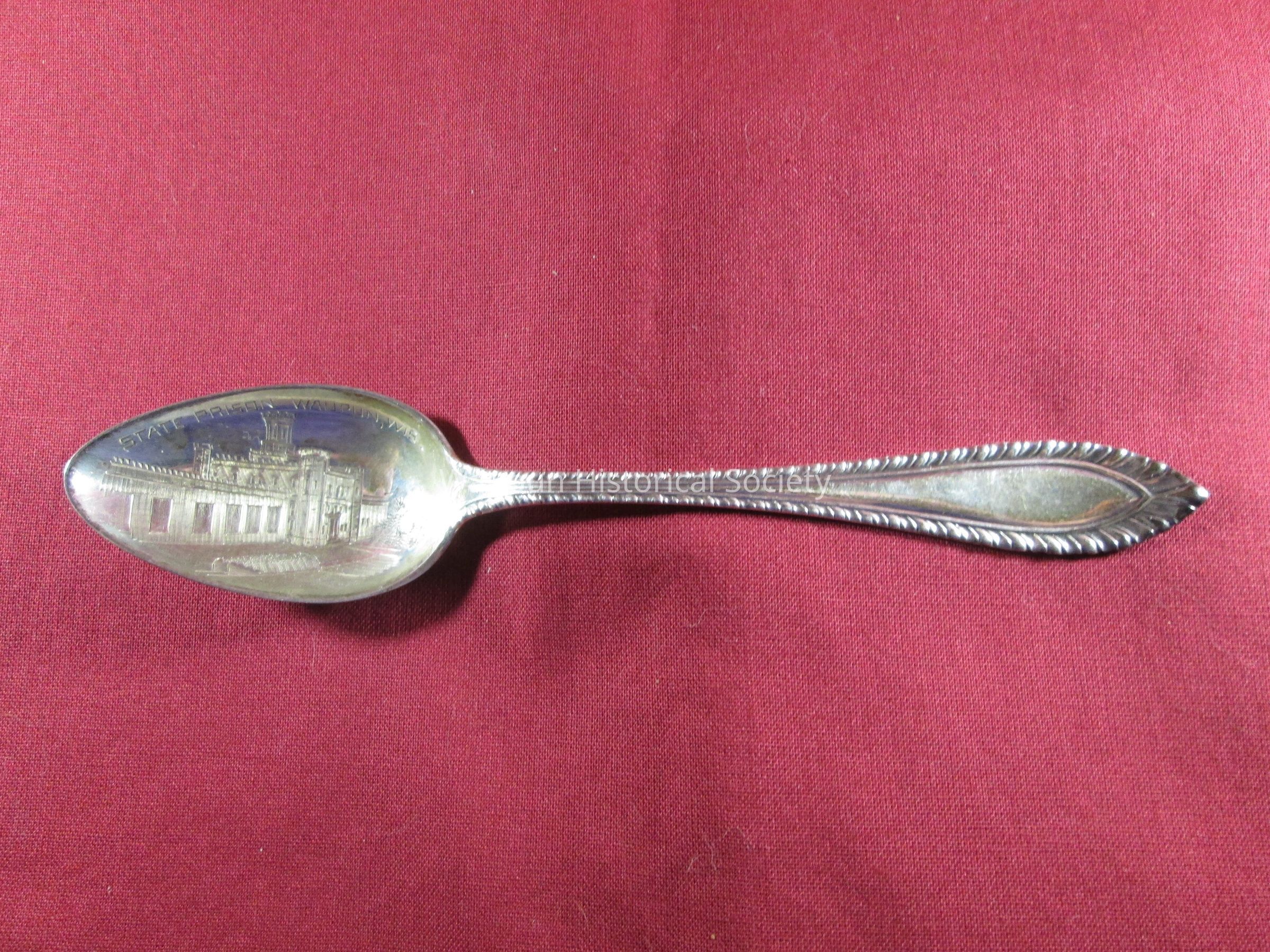 Spoon from collection. Sterling silver/gold wash with decorative handle. Engraved in the bowl of the spoon is a picture of the State Prison with the words "State Prison" and "Waupun Wis". The image of the prison is different from the previous spoon. The back side of the spoon has the date of 1909 engraved on the handle.Acquisition