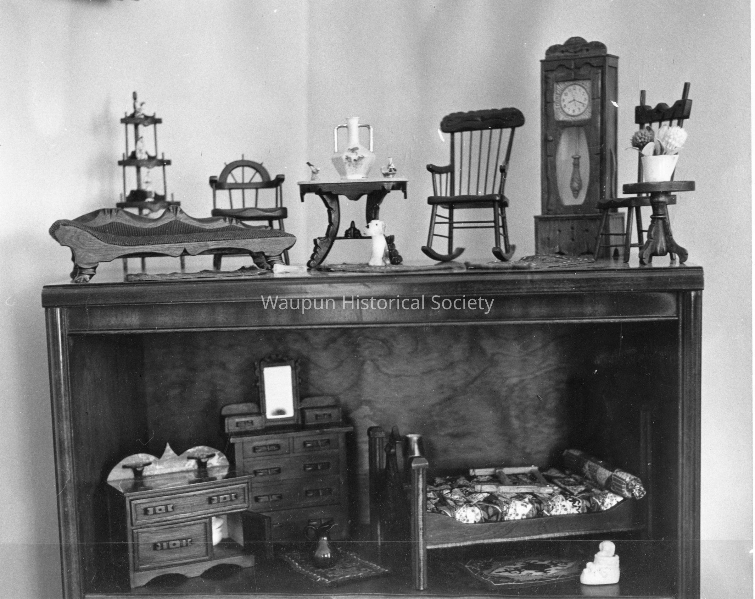 Photo found at Museum. Pictured is a collection of miniature doll furniture hand made by Earl Newton Wilcox, grandson of Seymour Wilcox.