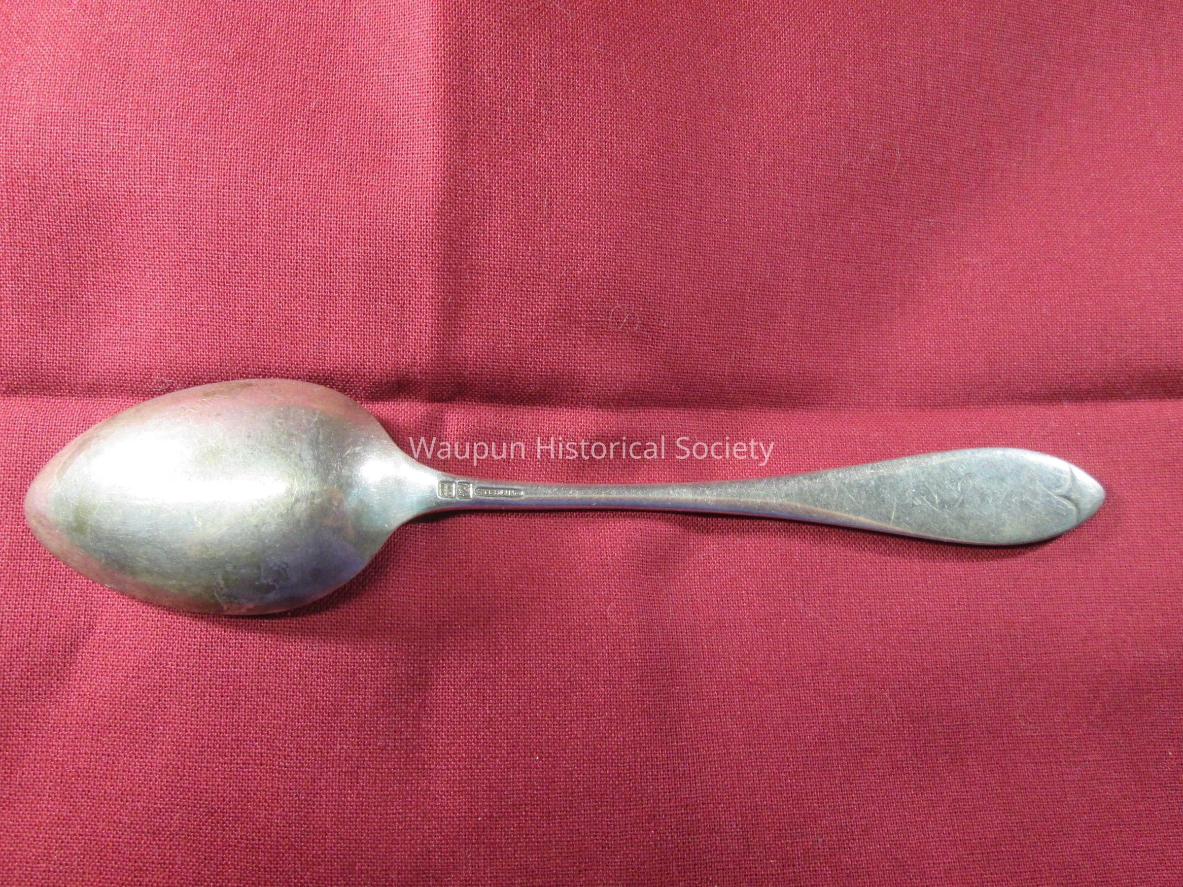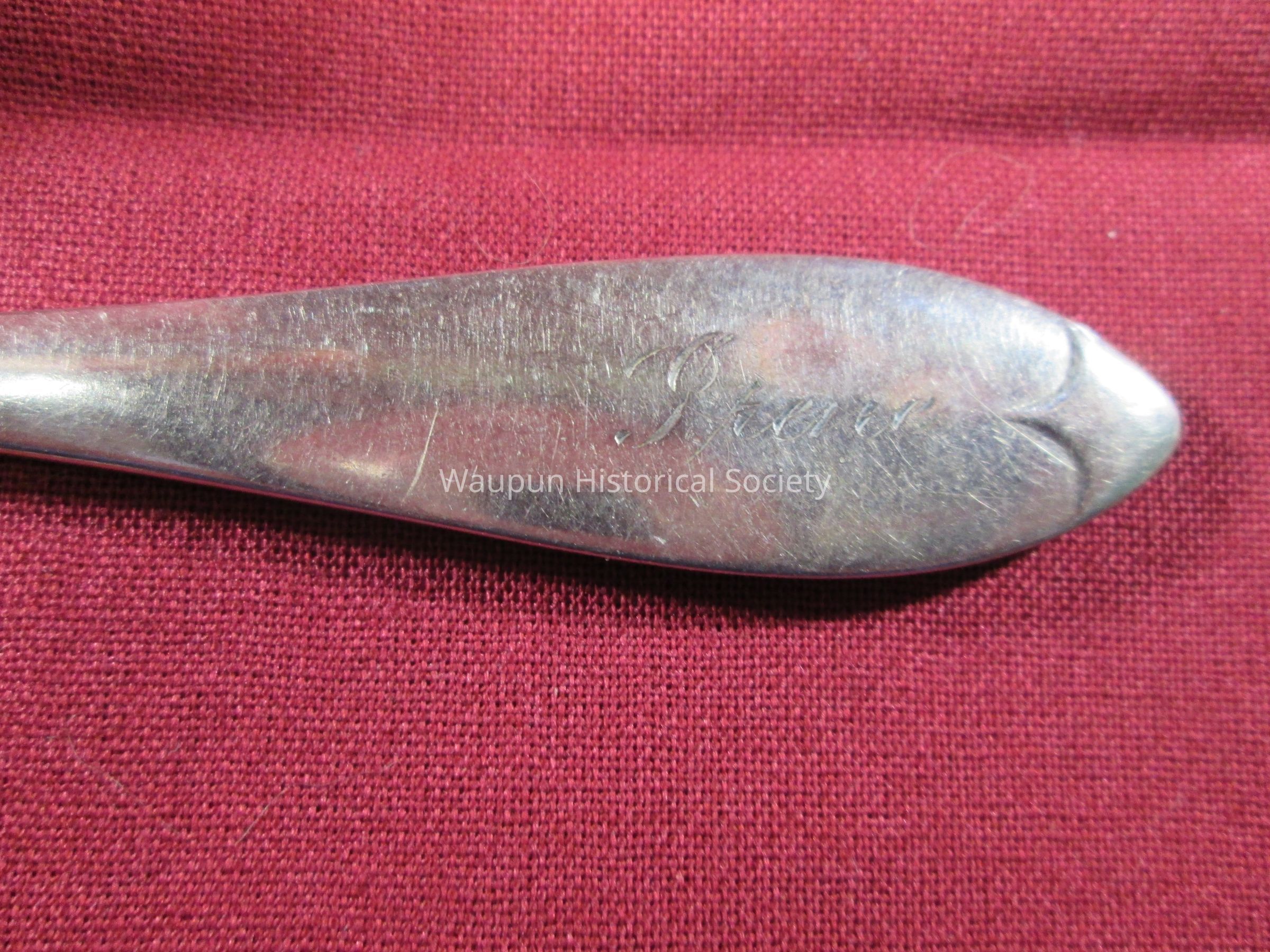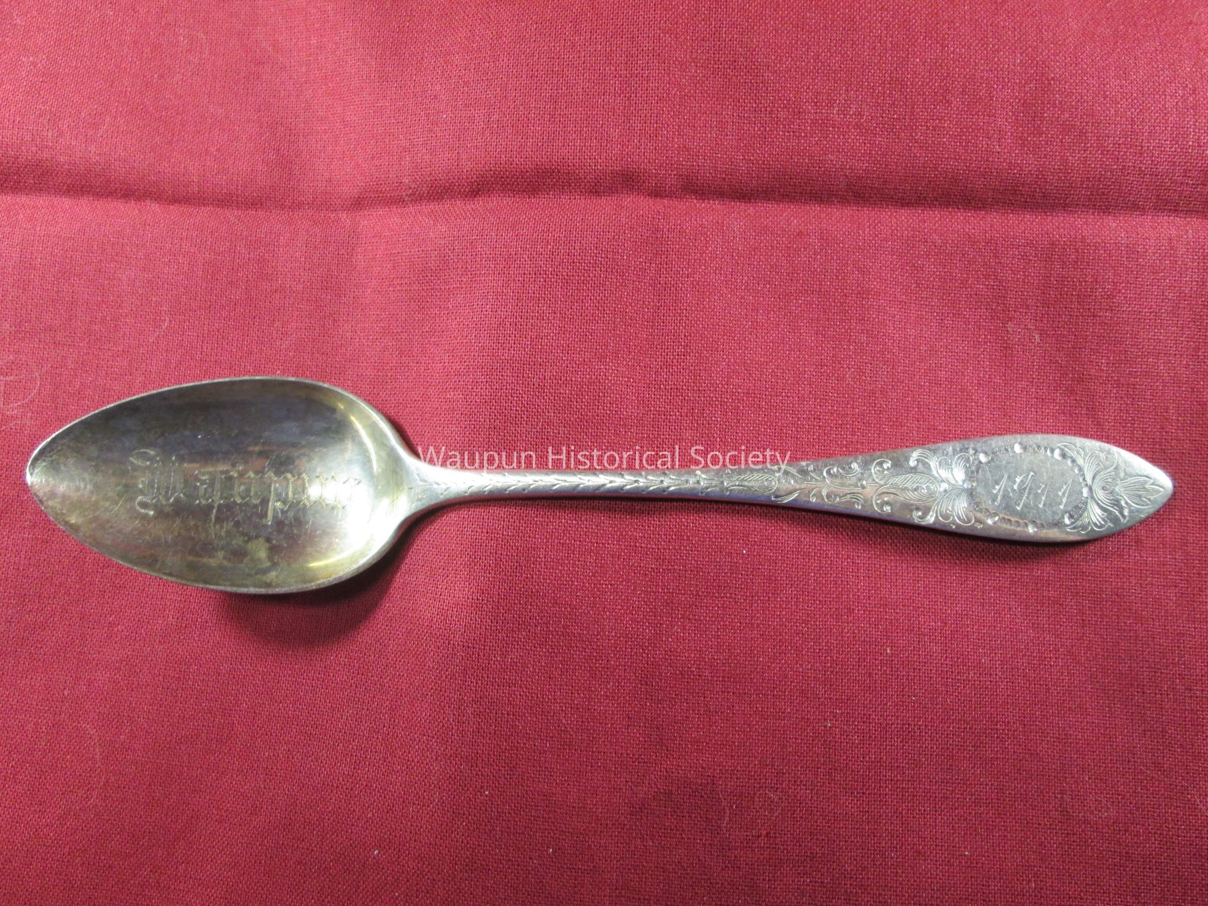 Spoon from collection. Sterling silver/gold wash with decorative handle. Engraved in the bowl of the spoon is "Waupun". Floral decoration and the year 1911 are engraved on the handle.The back side of the spoon has the word sterling and the name "Irene" on the handle.Acquisition