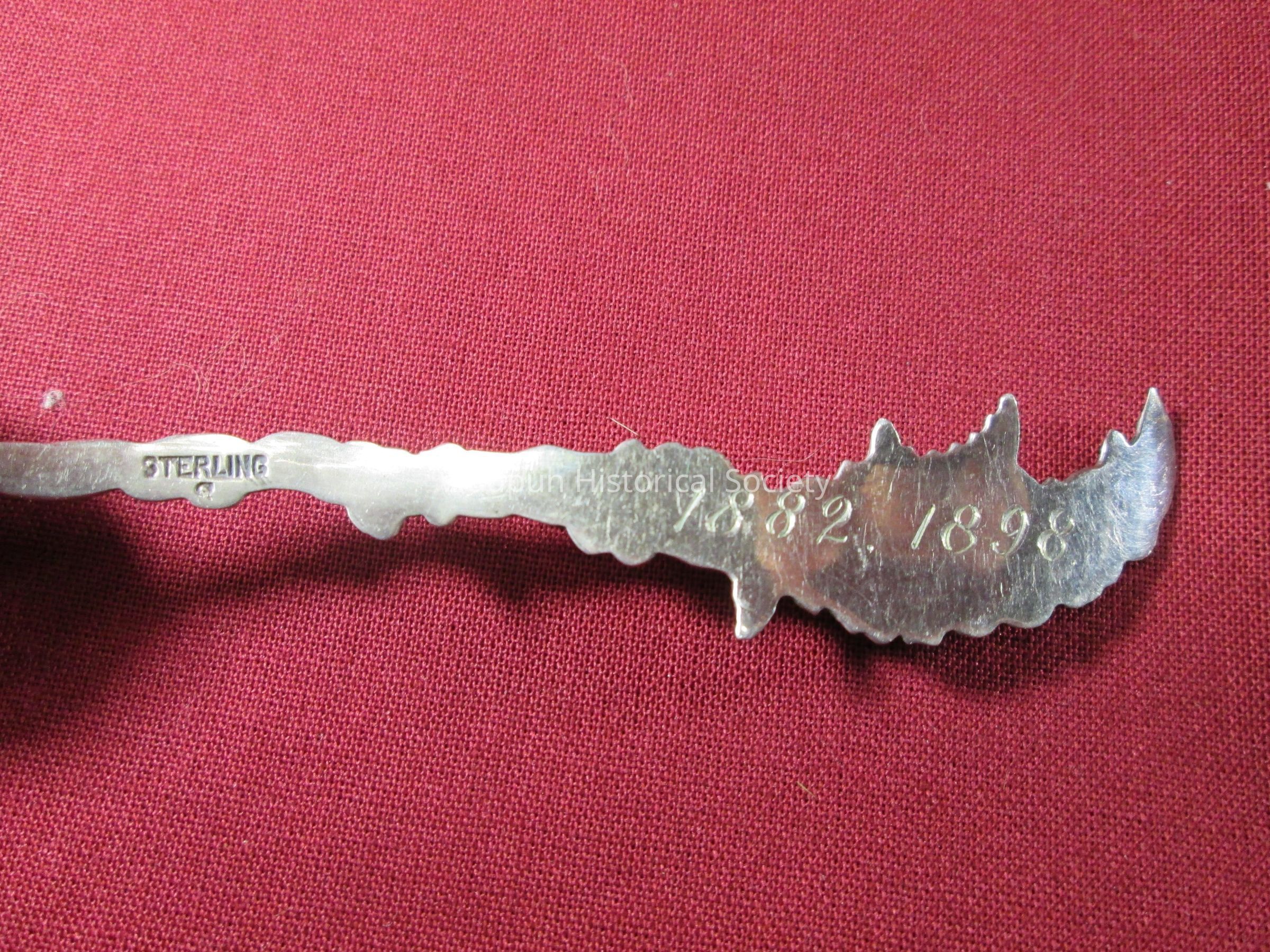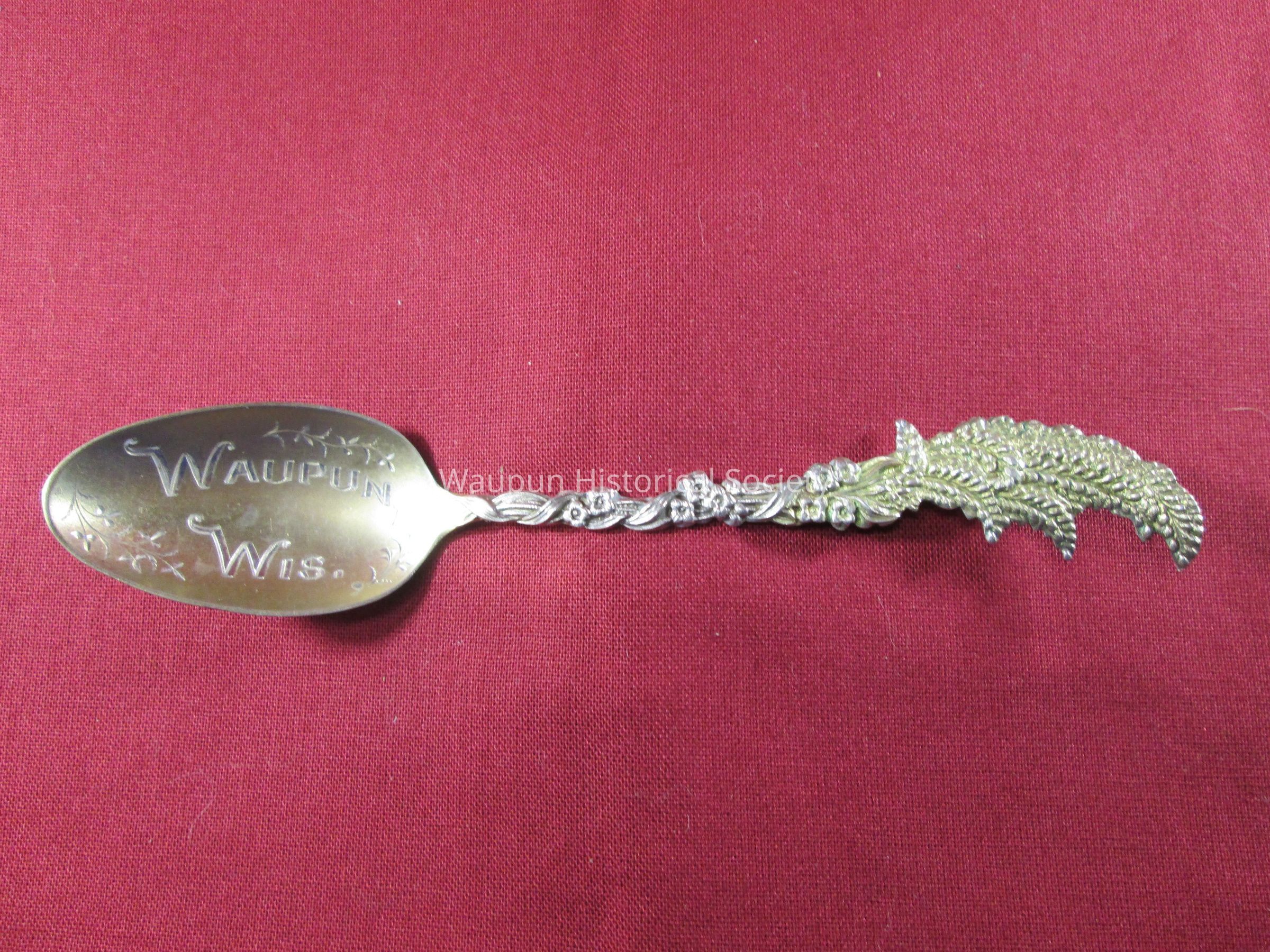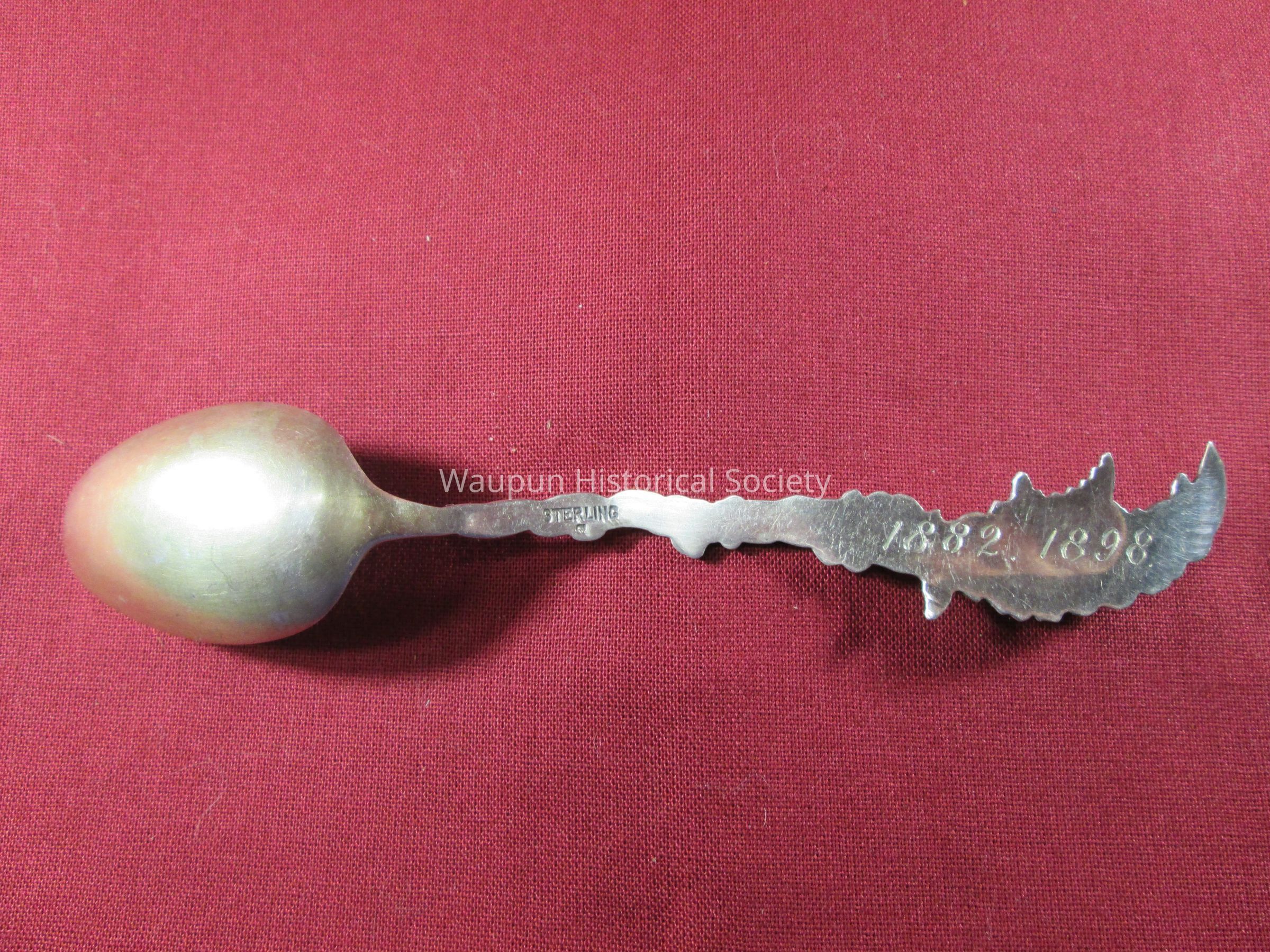 Spoon from collection. Sterling silver/gold wash with decorative floral handle. Engraved in the bowl of the spoon is "Waupun Wis". On the back of the handle is the word "sterling" and the years 1882 and 1898.Acquisition
