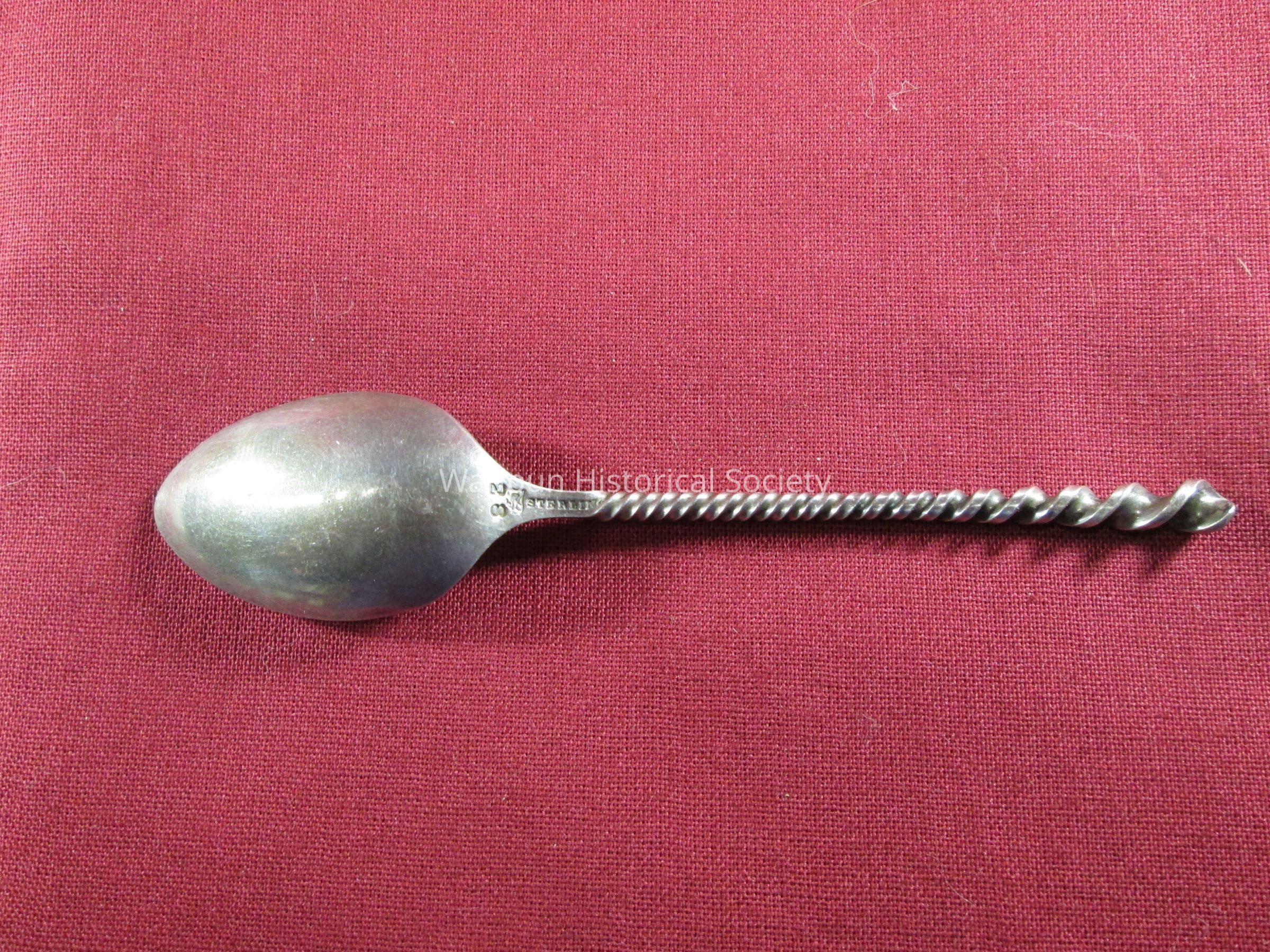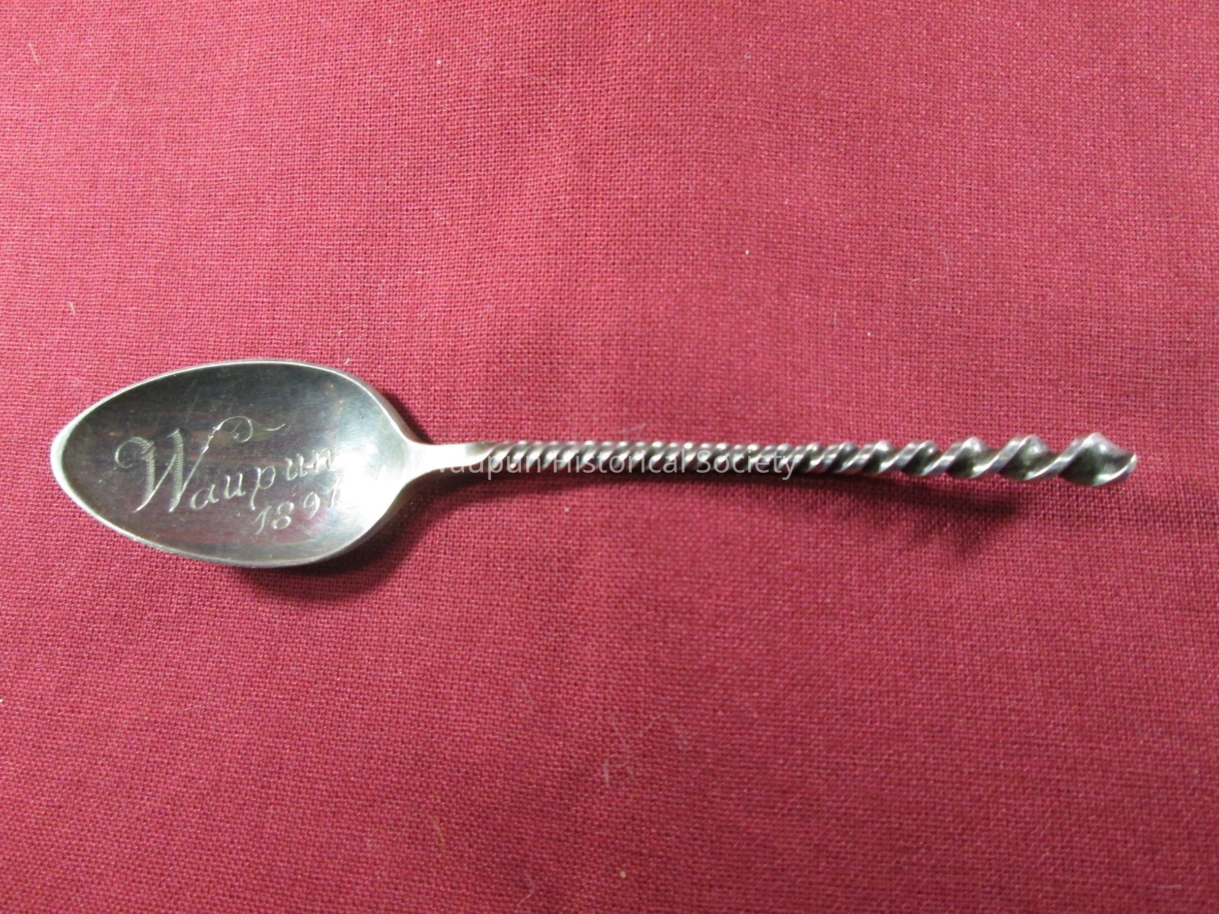 Child's spoon from collection. Sterling silver/gold wash with decorative spiral handle. Engraved in the bowl of the spoon is "Waupun 1891". The back side of the spoon has the word "sterling" and the number 28 at the base of the handle.Acquisition