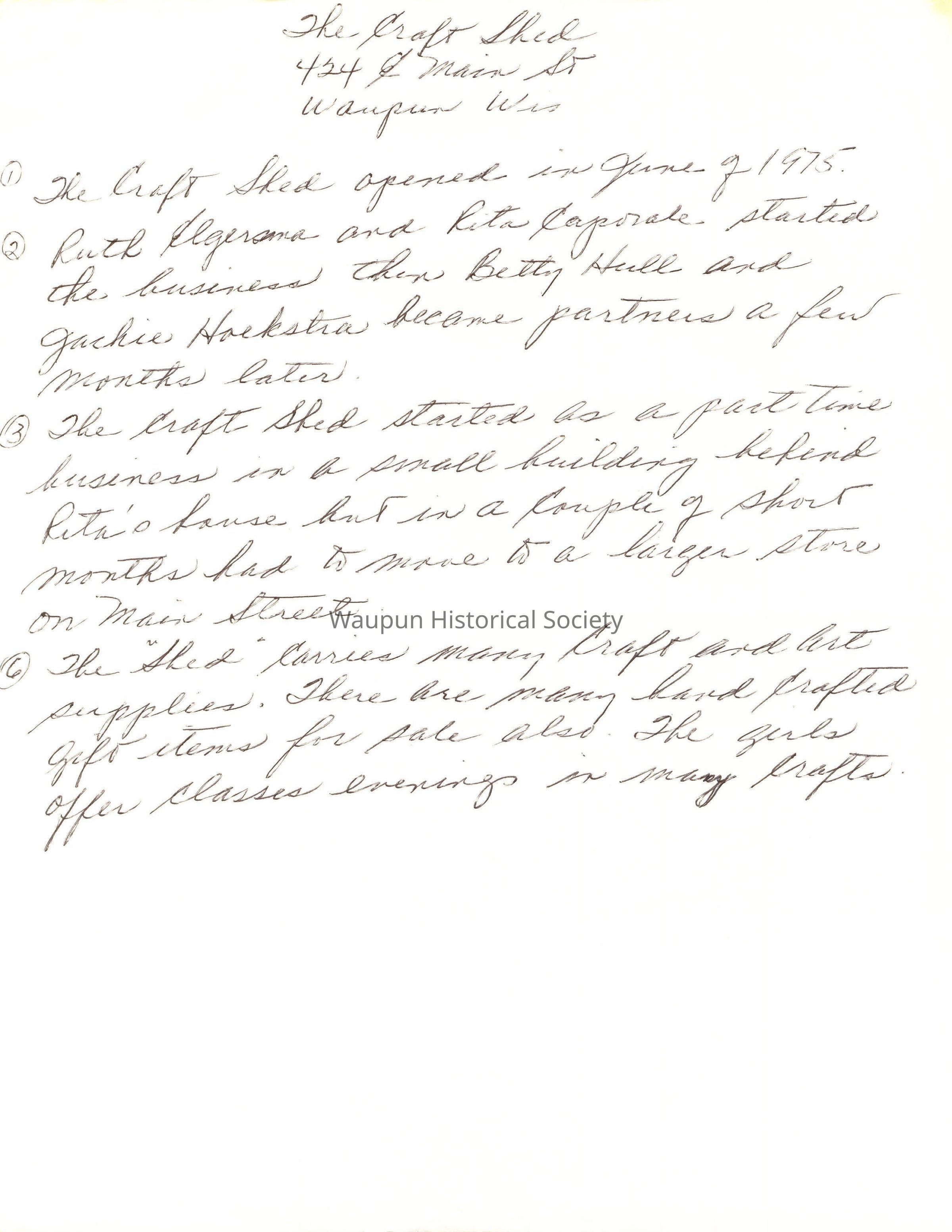 Historical information on The Craft Shed for 1976 Bicentennial Celebration in Waupun, WI