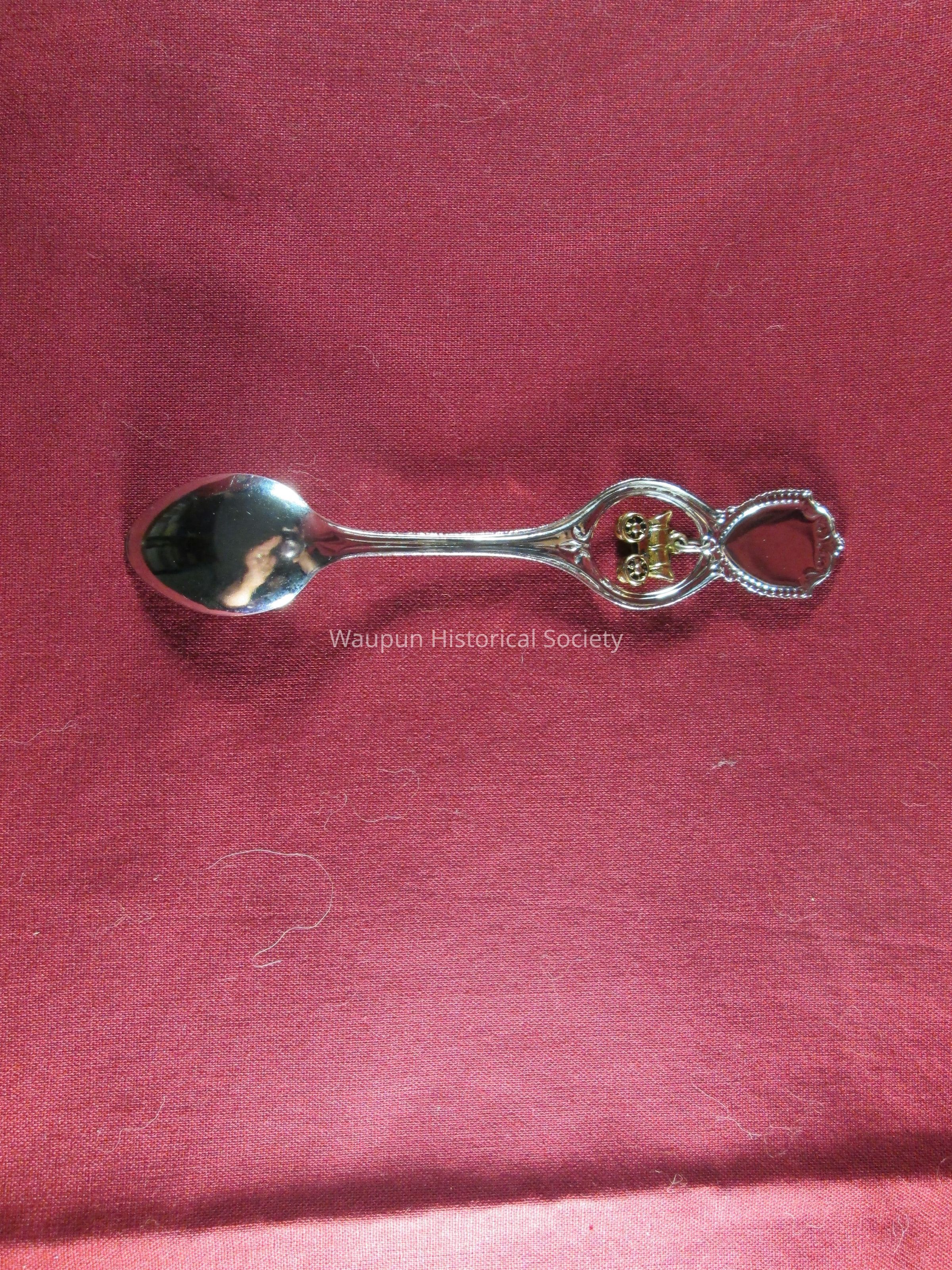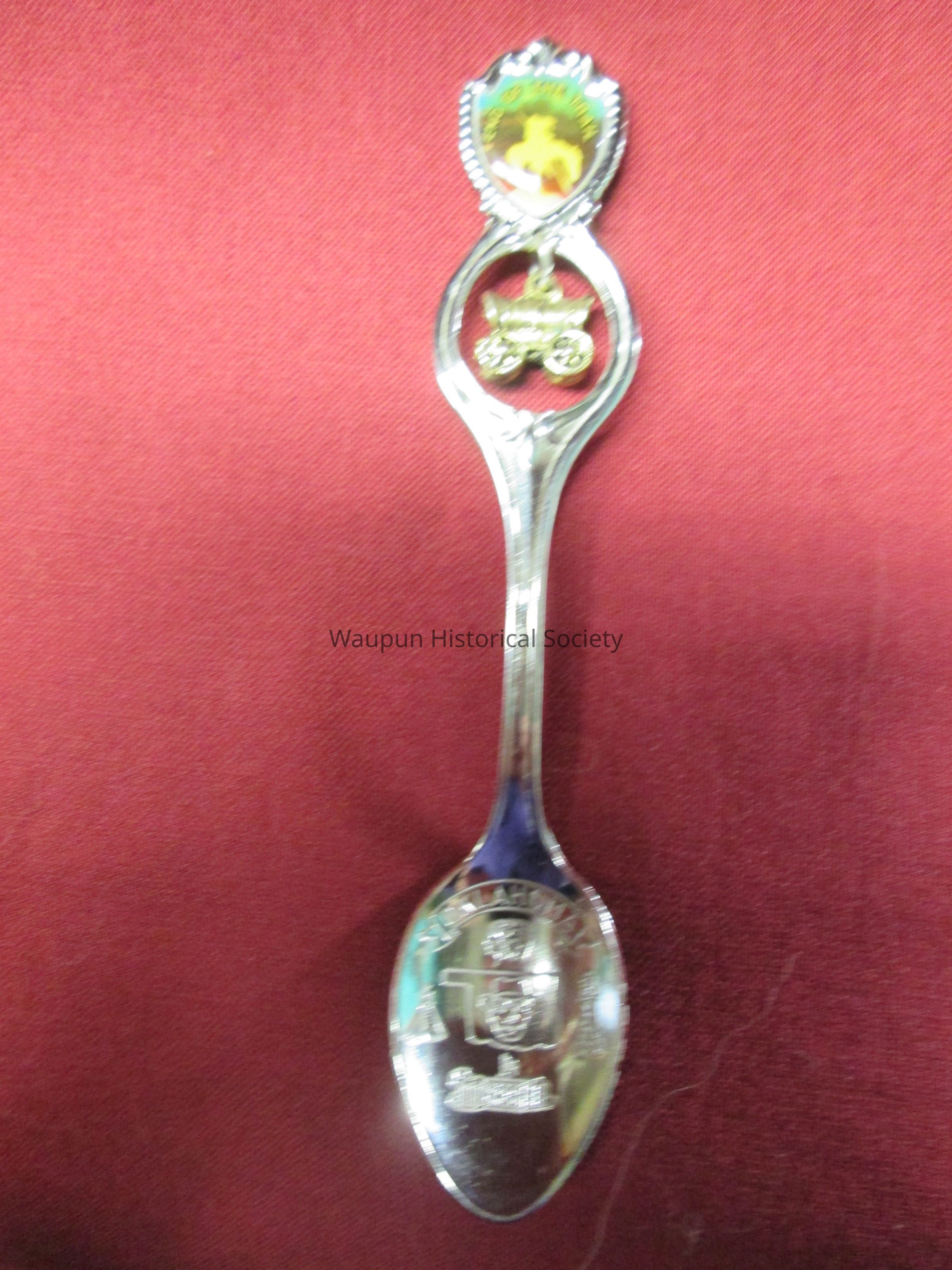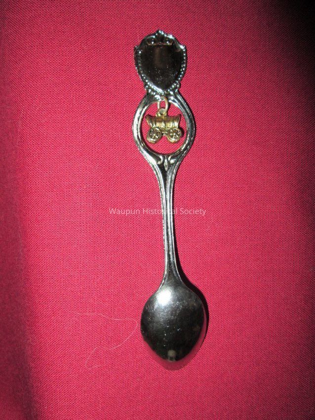 Spoon from collection. Stainless steal souvenir spoon is from Oklahoma. Features the state engraved on the bowl with a cowboy, Indian head, tee pee, a building with a flag overhead and an oil rig. The top of the handle shows the "End of The Trail" statue silhouette against a mountain back ground. Below the emblem is a round opening with a dangling gold color covered wagon charm. The back side of the spoon is plain with indentions that were made to form the front side decoration.Acquisition