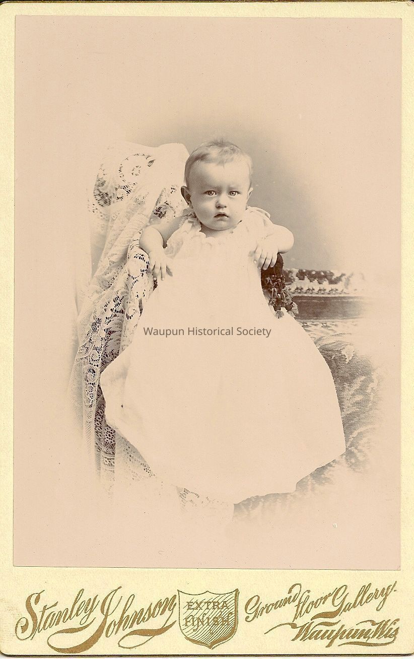 Cabinet Card, Johnson, Unknown baby portrait. This picture was taken at the Stanley Johnson studio. On the bottom of the picture it indicates Stanley Johnson, Extra Finish, Ground Floor Gallery, Waupun, WIS. Nothing is written on the back of the photo. This photo was purchased on eBay by Jim Laird.Acquisition
