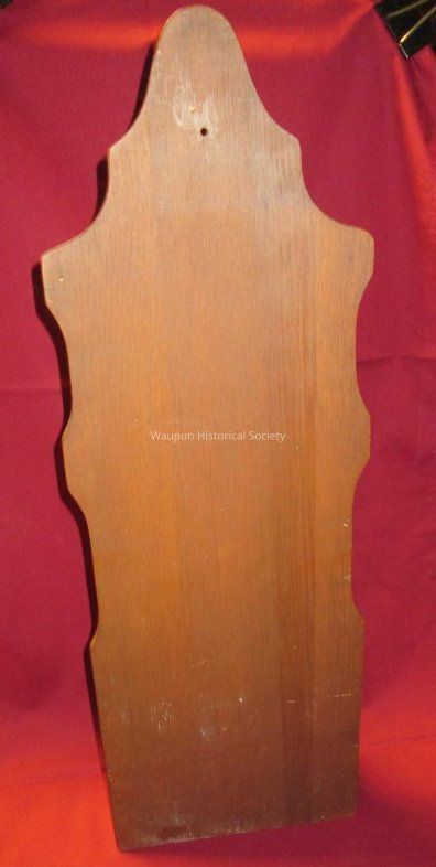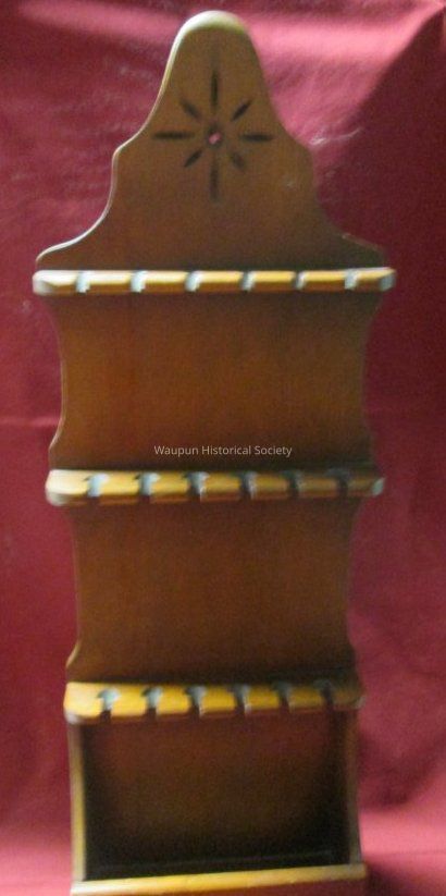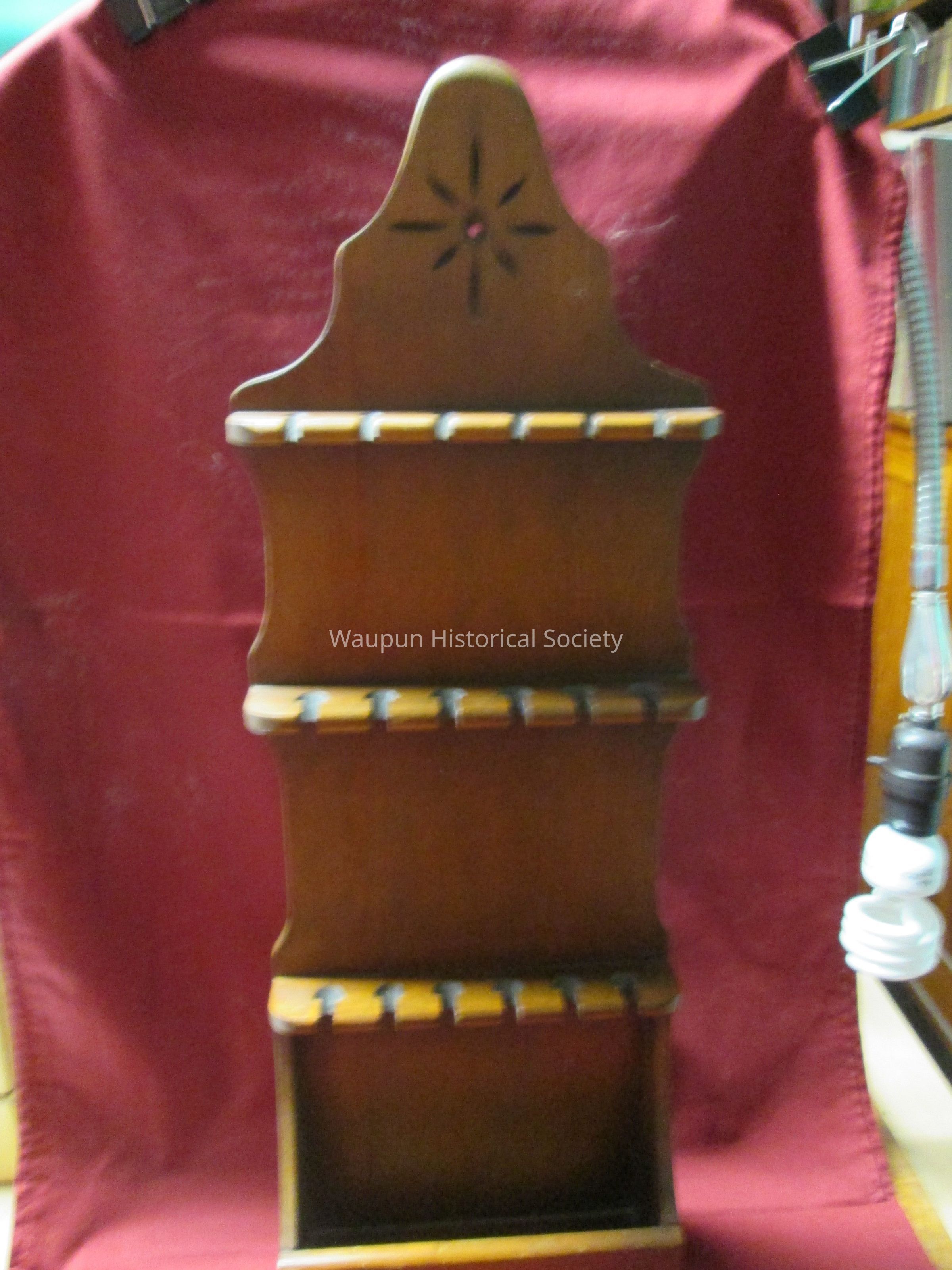 Wooden rack used to display the spoon collection. Cherry stain, with a star cut near the top with a hole in it's center for hanging the display. Accommodates 18 spoons and has a closed in base possibly used for additional pieces.Acquisition
