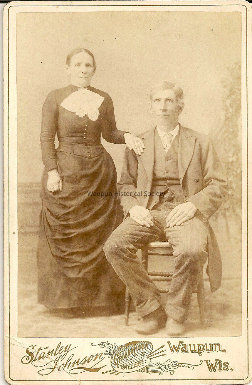 Cabinet Card, Johnson, Unknown couple portrait. May be wedding photo. On the bottom it indicates Stanley Johnson, Ground Floor Gallery, Waupun, WIS. Jim Laird purchased this photo on eBay. The back of the photo is blankAcquisition