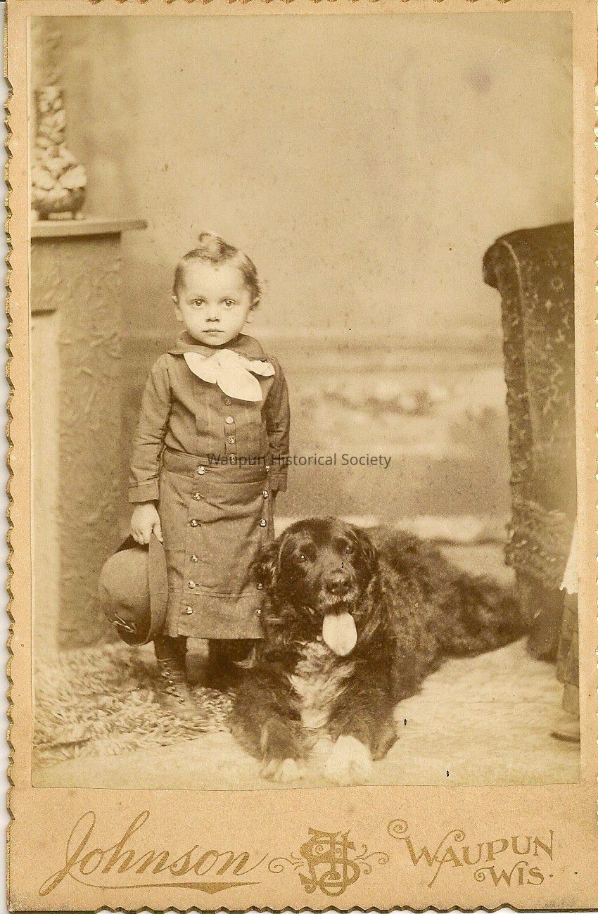 Cabinet Card, Johnson, Unknown child and dog. This photo indicates on the bottom that it is a Johnson. To the right of the name is a script that looks like ASJ, possibly for Alfred Stanley Johnson. It shows a little boy with a big dog next to him. Great shoes on the boy. He is holding a hat. The dog is quietly laying waiting for a response from the boy. Jim Laird purchased this picture on eBay. Nothing is written on the back.Acquisition