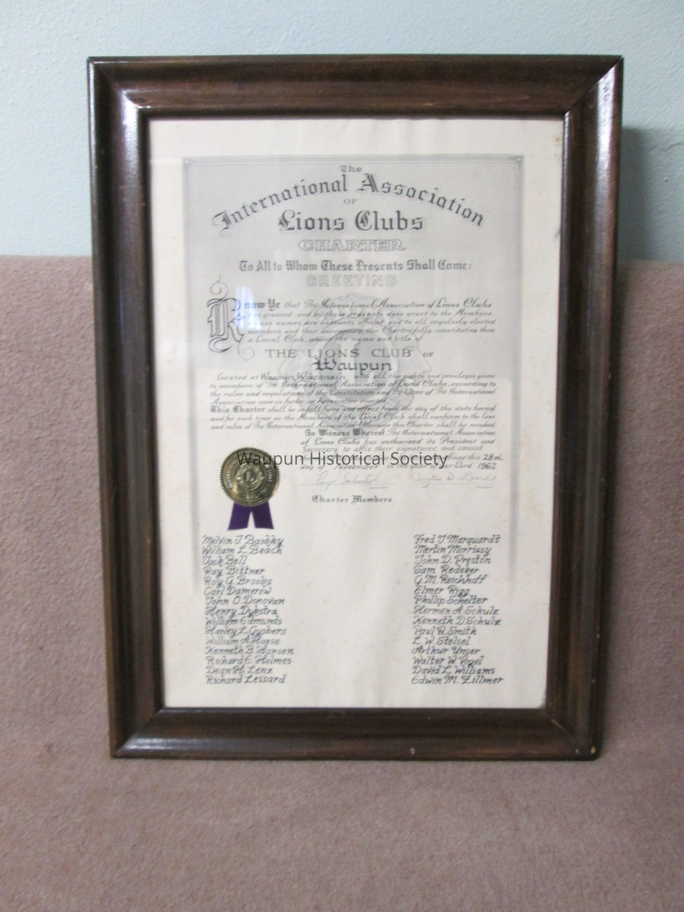 Waupun Lions Club Charter as issued by The International Association of Lions Clubs on November 28,1962. Placed in a brown wood frame with glass that measures 18"x 26", the document is signed by the Secretary Roy Schaetzel and President Curtis D. Lovill (Lovell) and list the names of the Charter Members.Acquisition