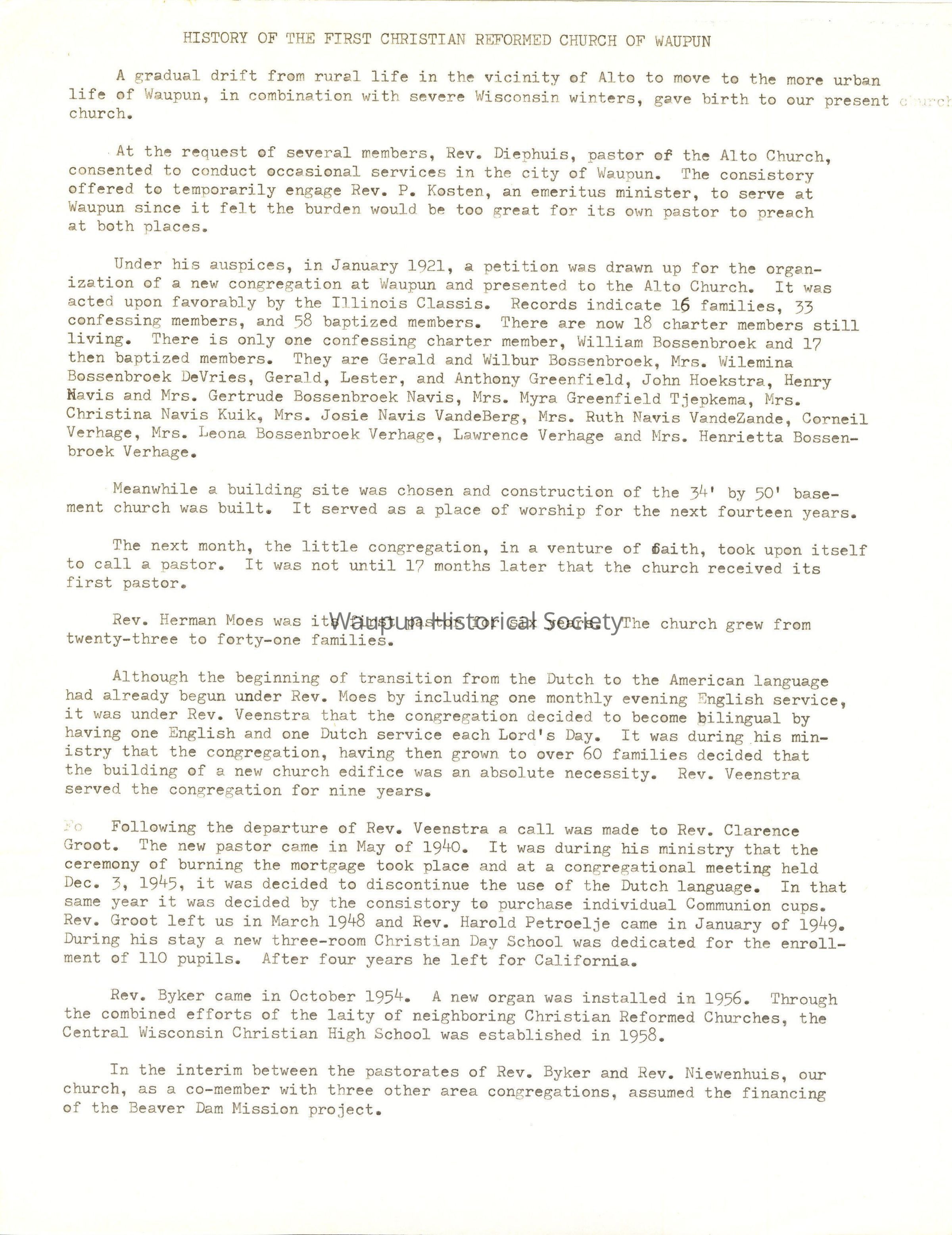 Under his auspices, in January 1921, a petition was drawn up for the organization of a new congregation at Waupun and presented to the Alto Church. It was acted upon favorably by the Illinois Classis. Records indicate 16 families, 33 confessing members, and 58 baptized members. There are now 18 charter members still living. There is only one confessing charter member, William Bossenbroek and 17 then baptized members. They are Gerald and Wilbur Bossenbroek, Mrs. Wilemina Bossenbroek DeVries, Gerald, Lester, and Anthony Greenfield, John Hoekstra, Henry Mavis and Mrs. Gertrude Bossenbroek Navis, Mrs. Myra Greenfield Tjepkema, Mrs.