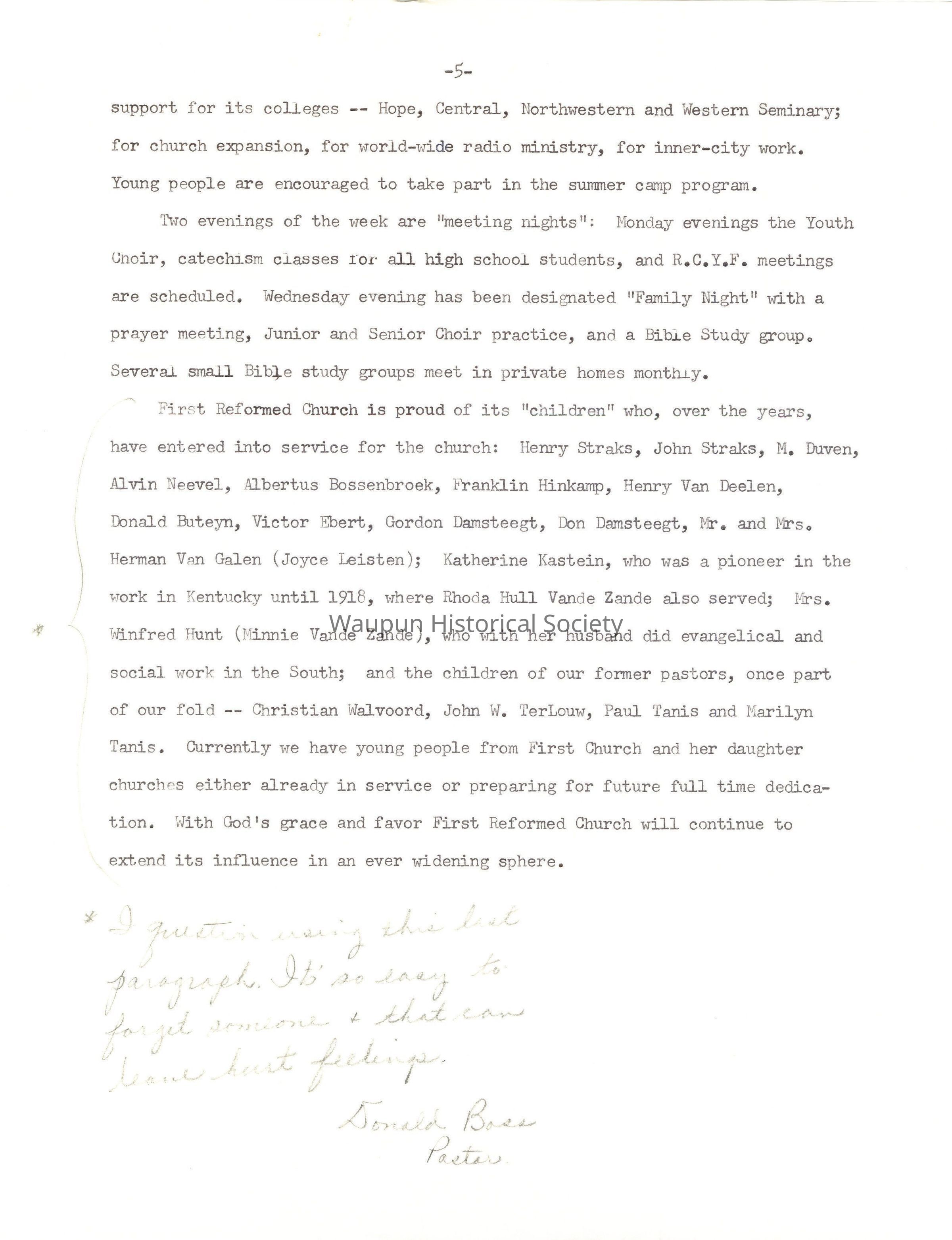 Historical information on First Reformed Church of Waupun for 1976 Bicentennial Celebration in Waupun, WI