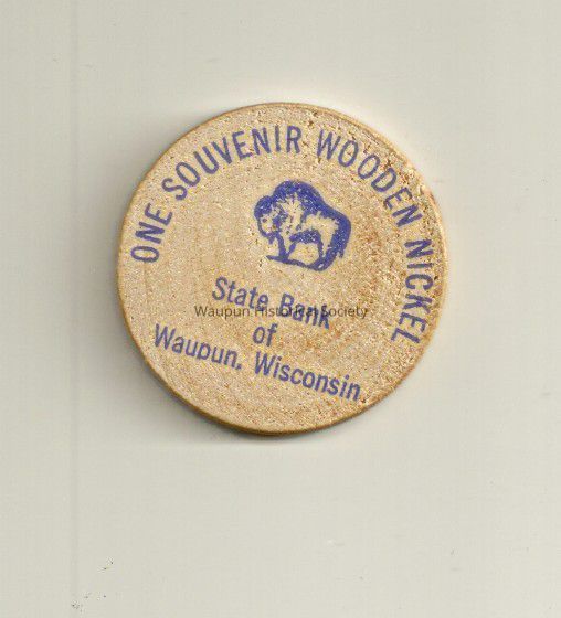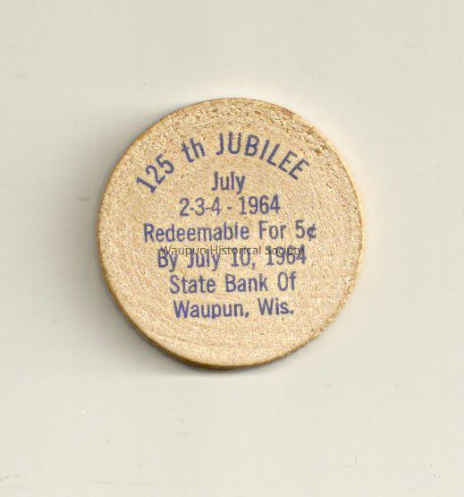 Souvenir Wooden Nickel issued for Waupun's 125th Jubilee Celebration that was held July 2, 3, and 4, 1964. The commemorative coin was actually redeemable for 5 cents by July 10, 1964 at the State Bank of Waupun. One side of the coin has a buffalo and the words "ONE SOUVENIR WOODEN NICKEL" and "State Bank of Waupun, Wisconsin. The reverse side indicates the celebration, dates, and how and where to redeem the wooden nickel.Acquisition